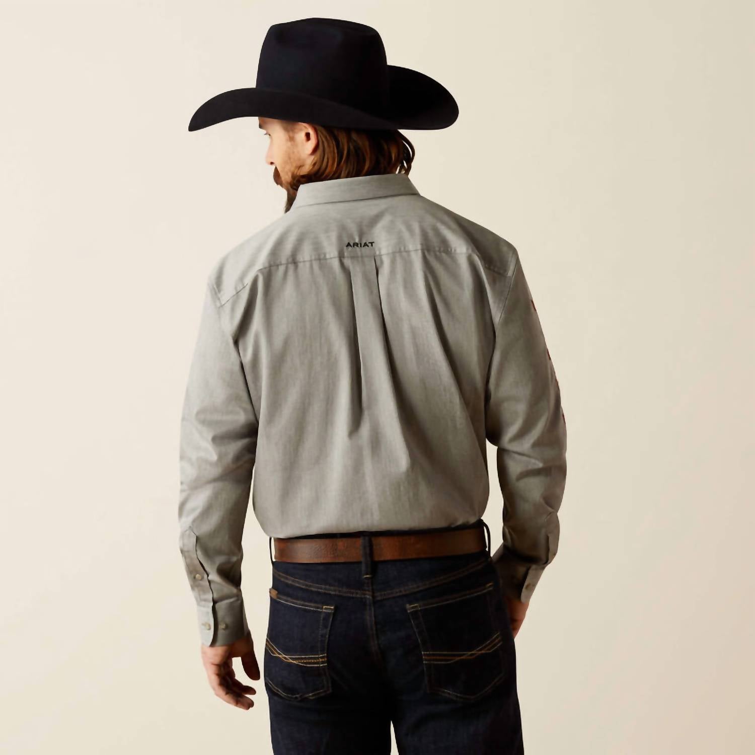 Introducing the Men's Team Logo Twill Classic Fit Shirt by ARIAT, a perfect addition to your streetwear collection. This long sleeve shirt in a sophisticated grey black color features a graphic pattern and a classic collar for a polished look. Designed without pockets, it employs a convenient button closure for easy wear. Ideal for spring vacations, this casual button-down effortlessly combines comfort and style.