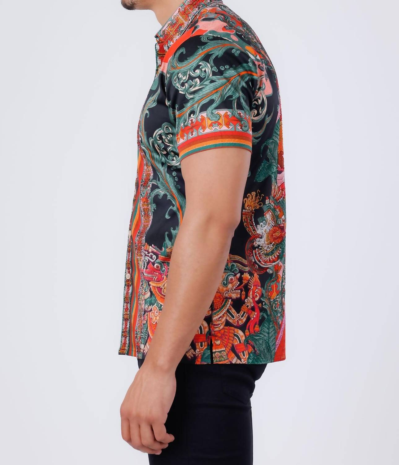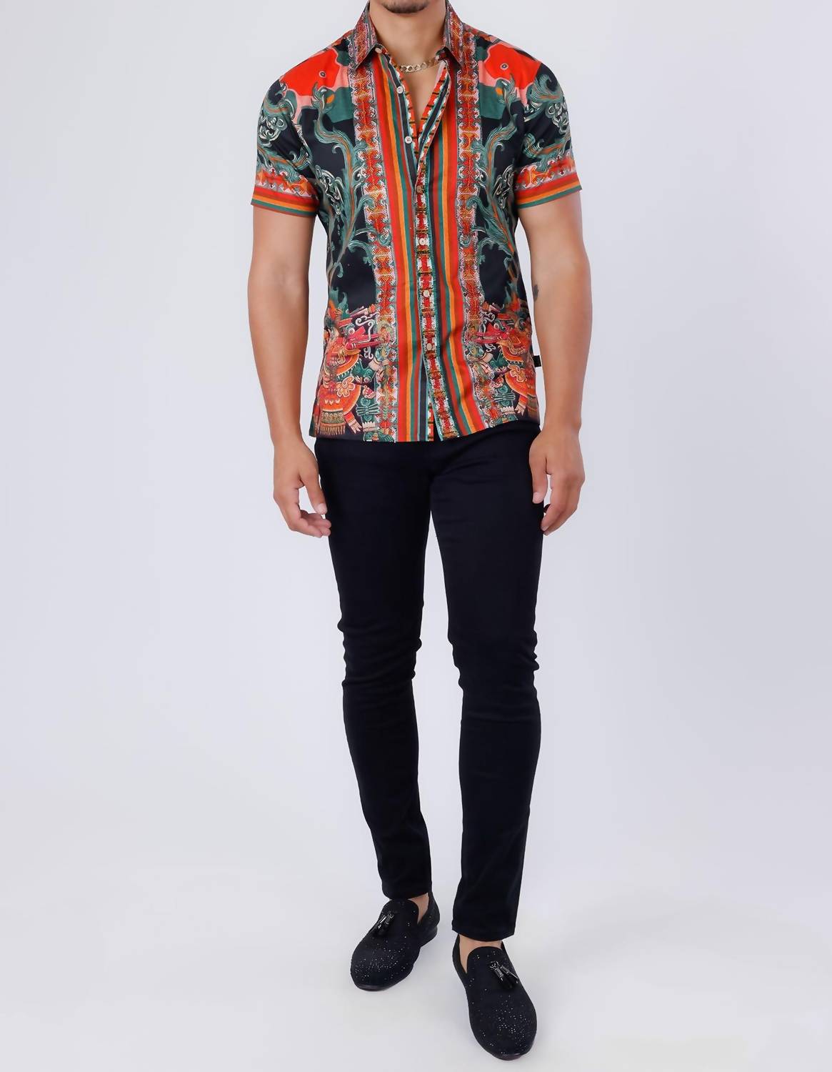Presenting the Flickerkilt Rhinestone Short Sleeve Shirt by Barabas, an exquisite men's fashion piece in vibrant orange. This casual button-down shirt is crafted from a 97% Cotton and 3% Spandex blend, offering a slim fit with lightweight comfort. Adorned with stunning hand-placed rhinestones and a floral and dragon Baroque design, it features a classic collar and button closure. To maintain its elegance, dry clean only.