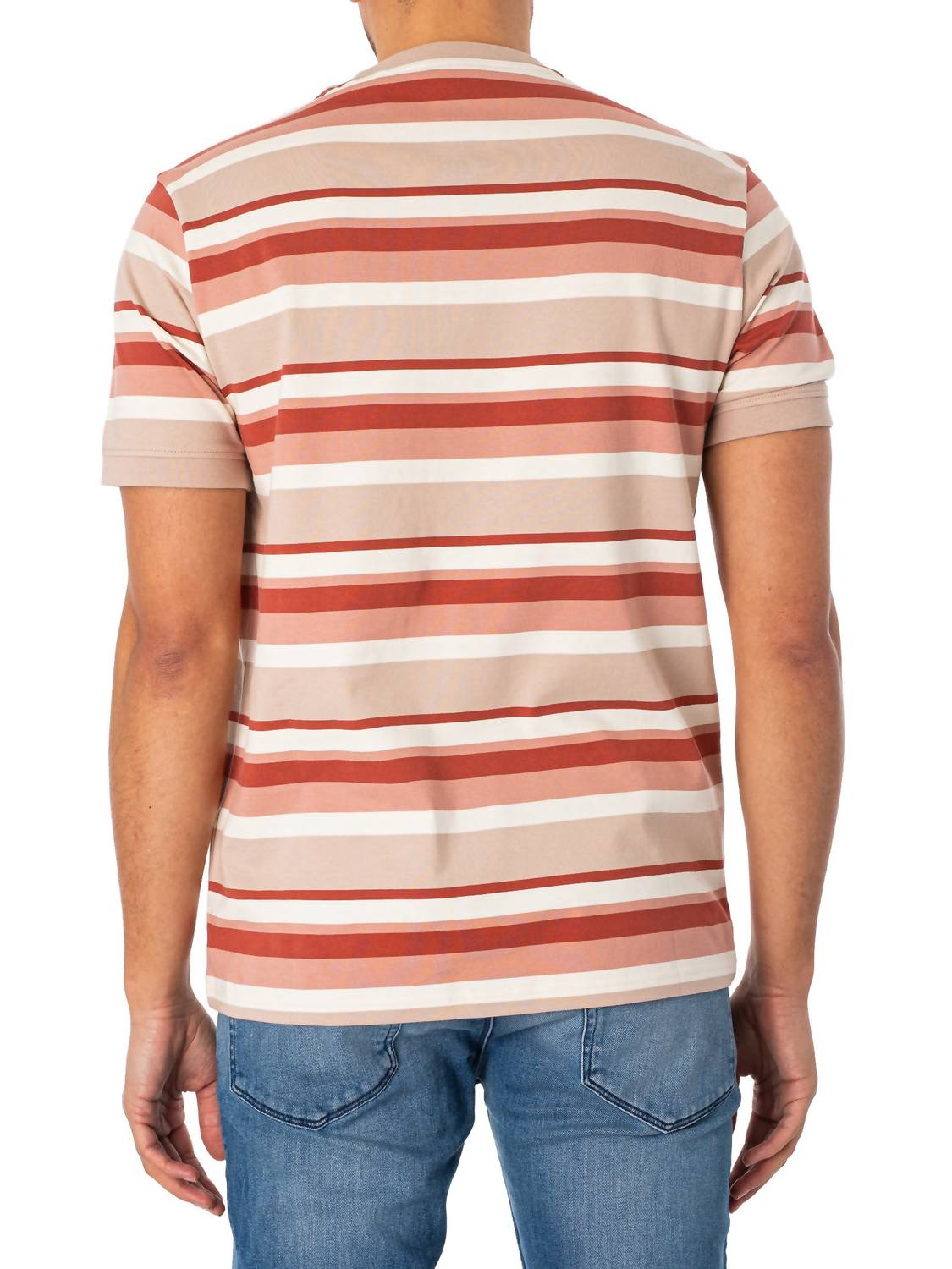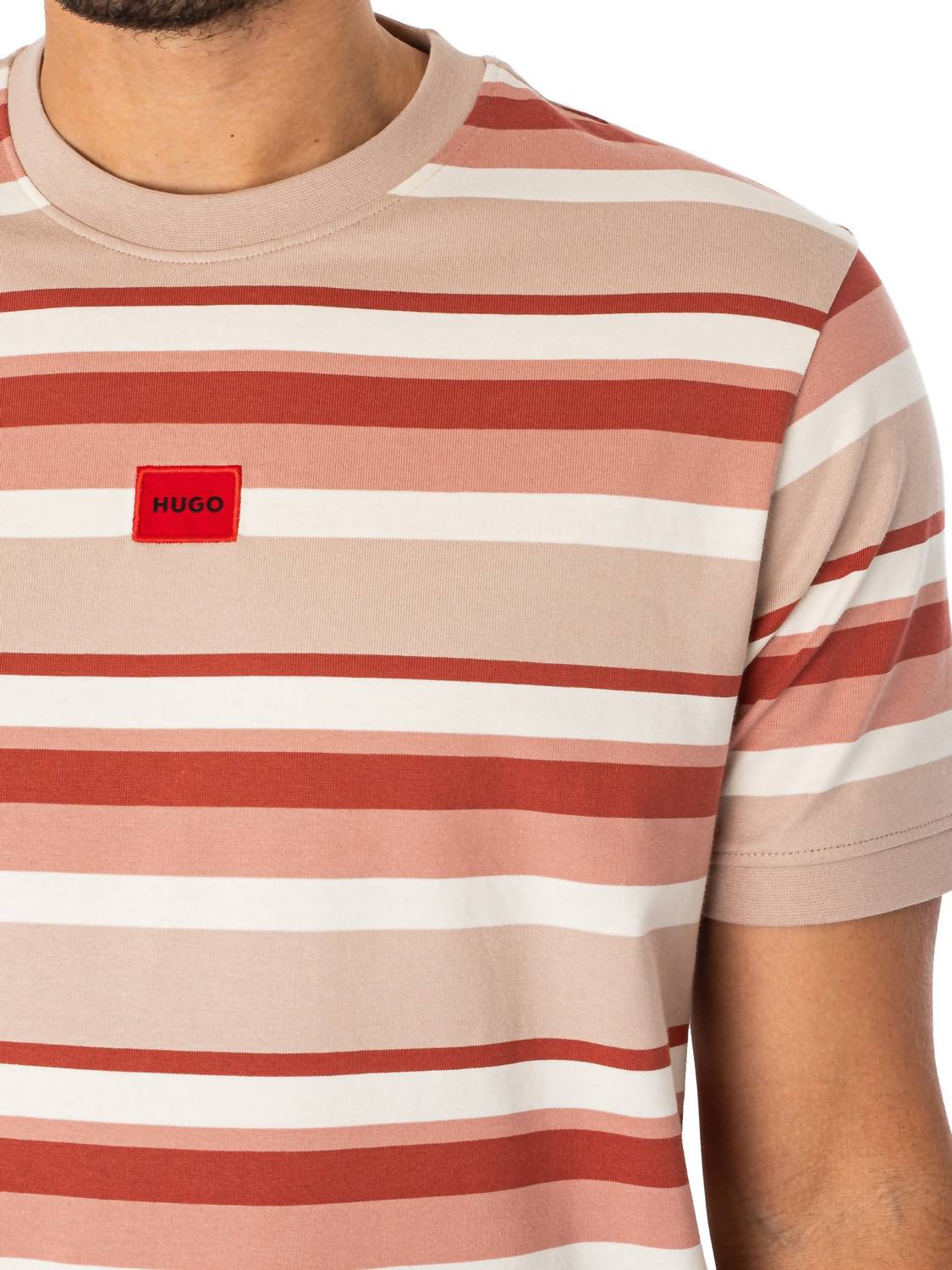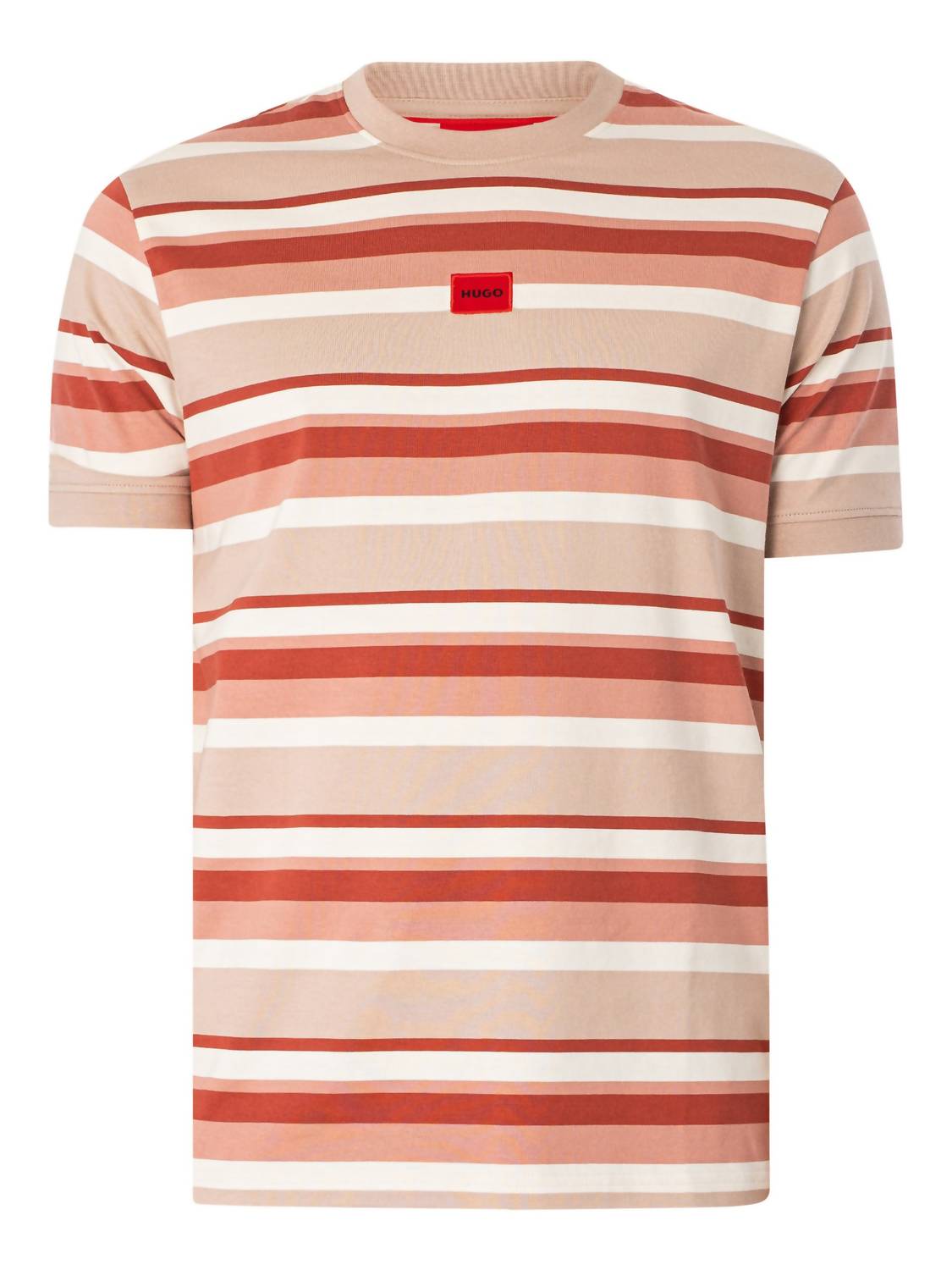 Introducing the Diragolino Striped T-shirt by Hugo Boss, a staple for the modern wardrobe in a stylish pink/beige color. Crafted from 100% cotton, this short sleeve T-shirt features three-color stripes and a distinctive red HUGO woven label embroidered on the chest. Designed with a regular fit, crewneck, and ribbed collar and cuffs for a refined look. Closure: Pull on. Care: Machine washable.