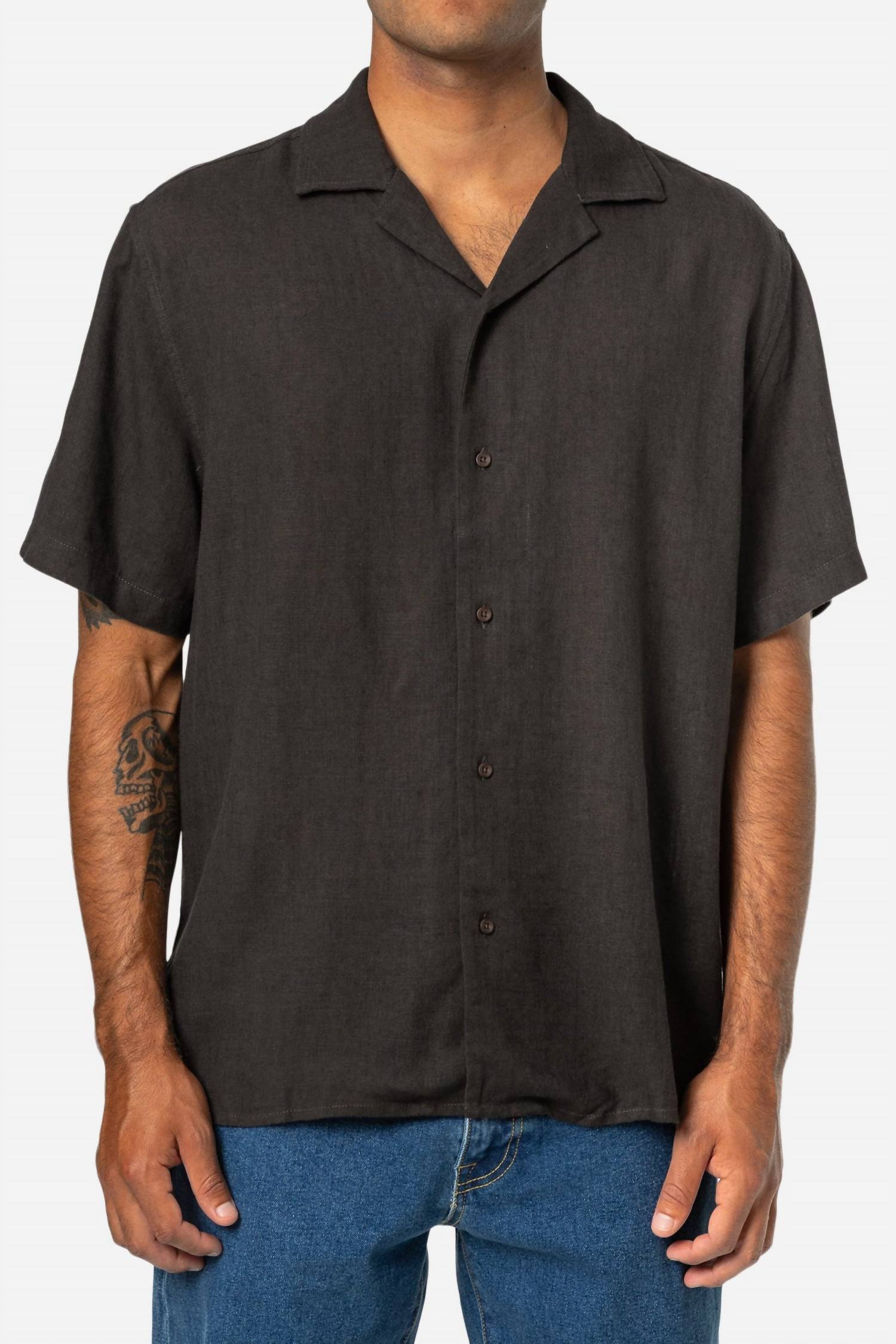 Introducing the Men's Teller Short Sleeve Shirt by Katin, an ideal choice for any season with its solid black wash and stylish camp collar. This shirt is crafted from a soft 80% Rayon and 20% Linen Slub blend, offering both comfort and polished appeal. The straight hem accentuates its clean-finished interior, making it versatile for dressing up or down. Closure: Button closure. Care: Dry clean only.