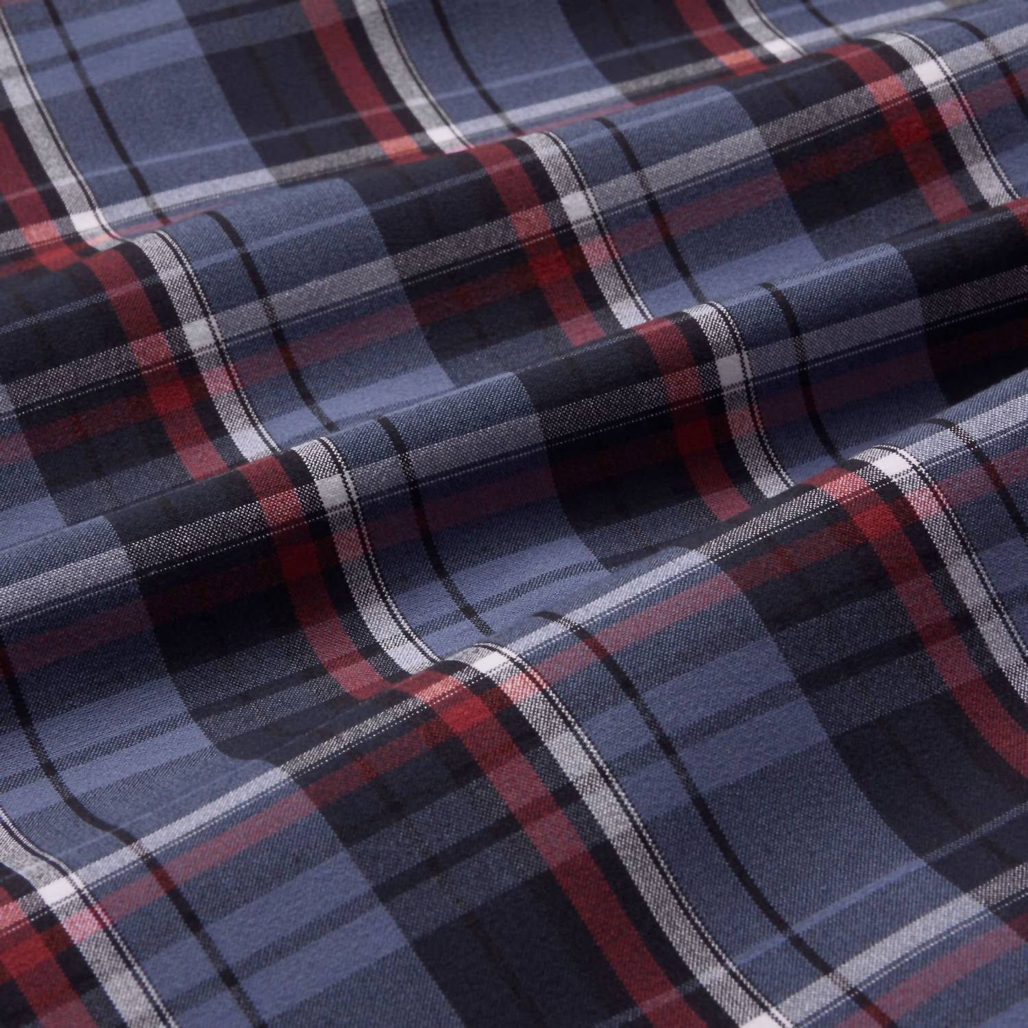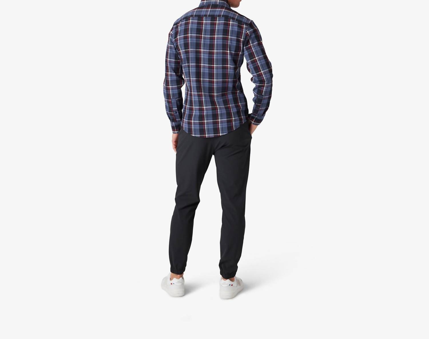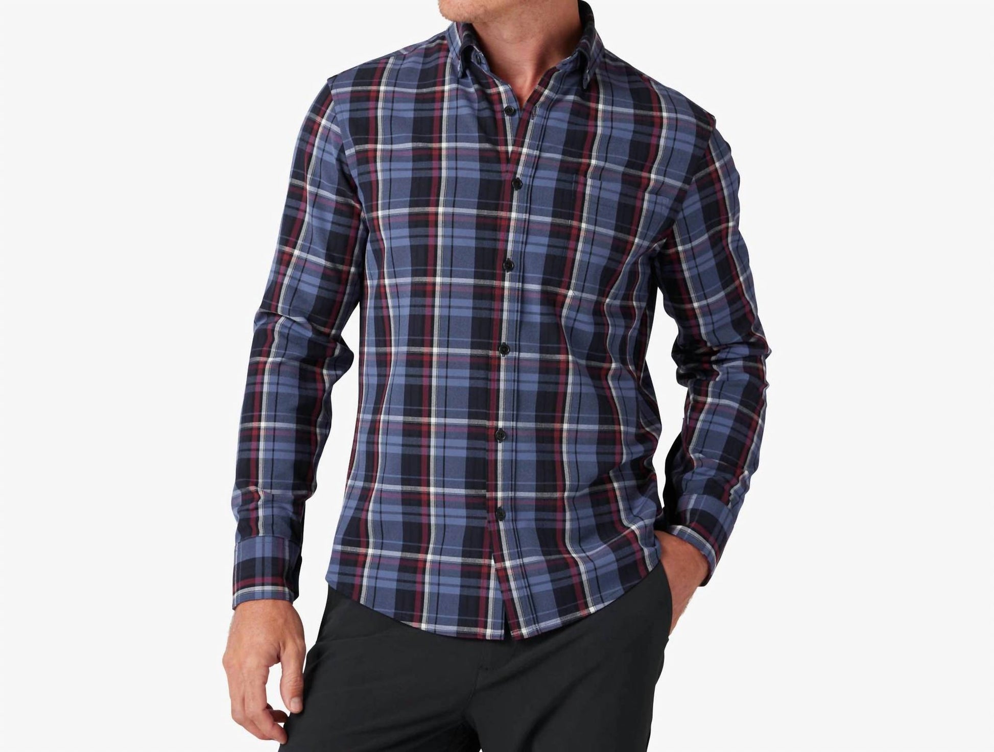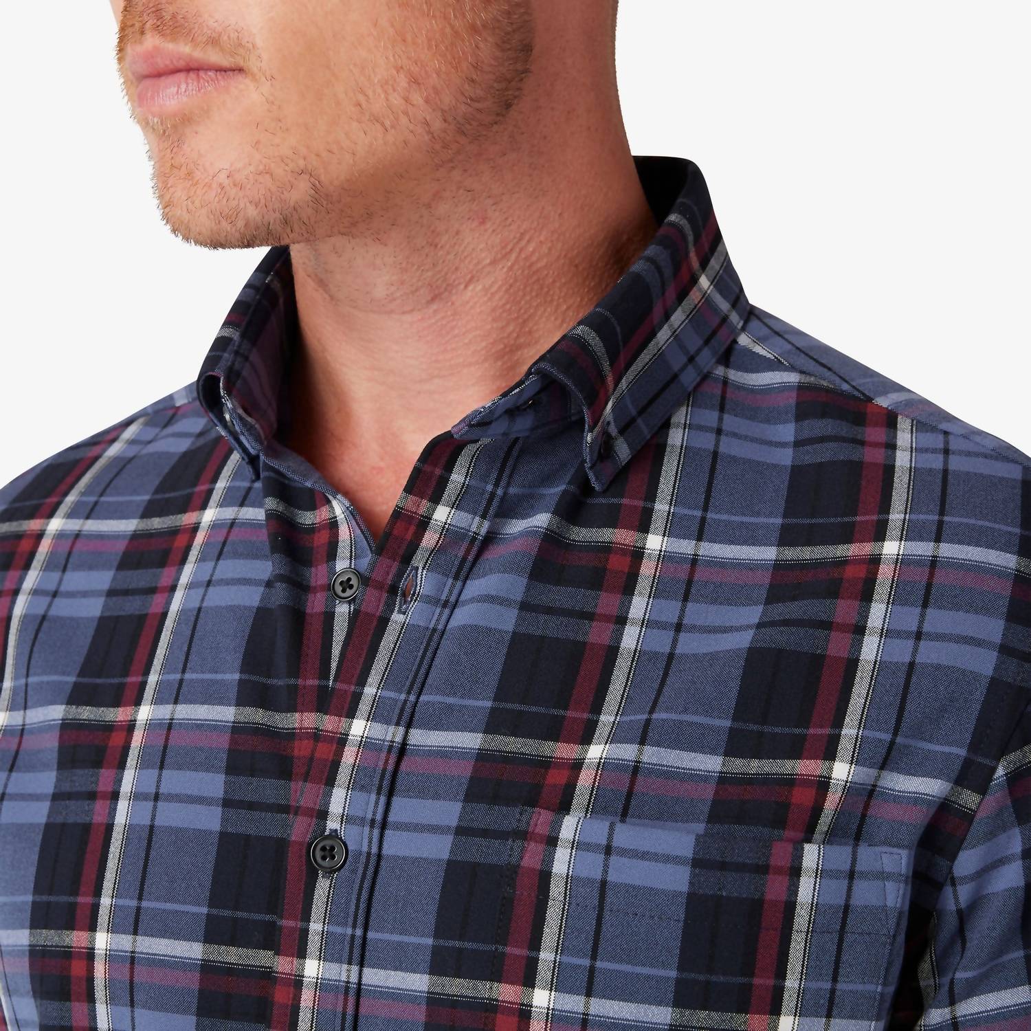Meet the City Flannel by Mizzen + Main, a dark blue plaid and check casual button-down shirt perfect for fall. This men's shirt features long sleeves and an exposed button collar with a set-on placket and a convenient chest pocket. Crafted with a soft and midweight blend of 65% Polyester, 32% Rayon, and 3% Spandex, it offers a comfortable fit with its no-tuck length, 2 inches shorter in the body to hit mid-zipper. The button closure adds classic style, and care instructions include machine wash cold, line dry, with the option for low tumble dry if needed.
