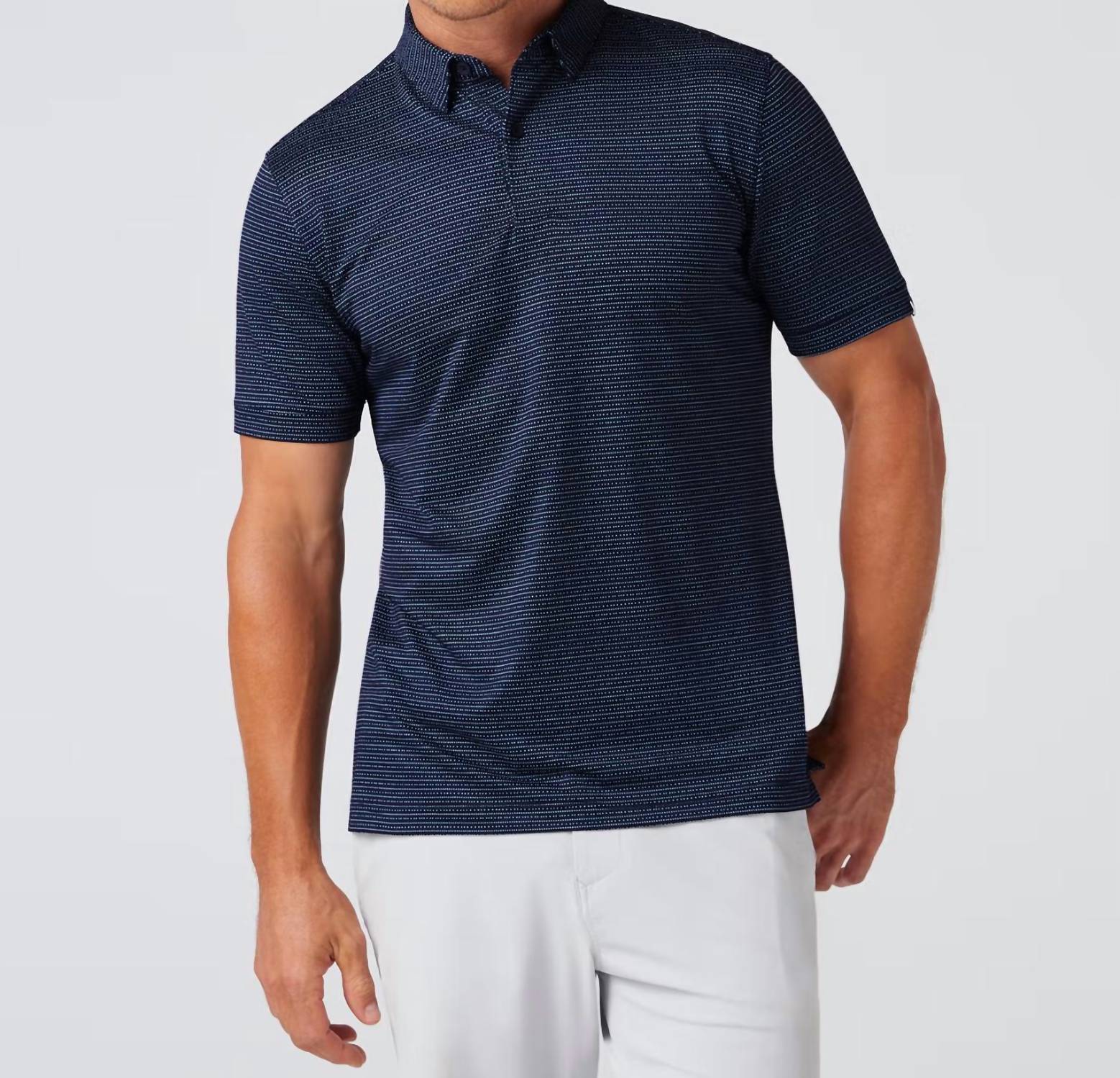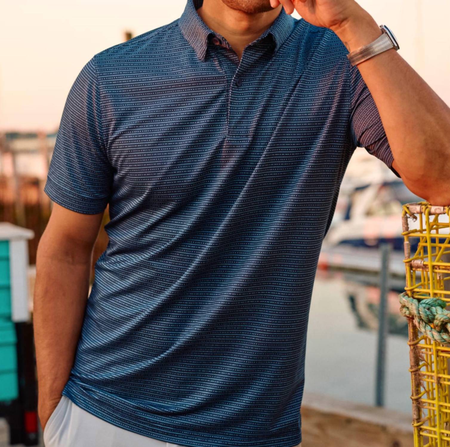 Introducing the Halyard Short Sleeve Polo by Mizzen + Main, featuring a sleek Navy Dot pattern. This finely textured knit polo is composed of 90% Polyester and 10% Spandex, offering a lightweight and stretchy fit. Designed to keep you cool and dry with moisture-wicking fabric, it's perfect for the hottest days. Closure: Button closure.