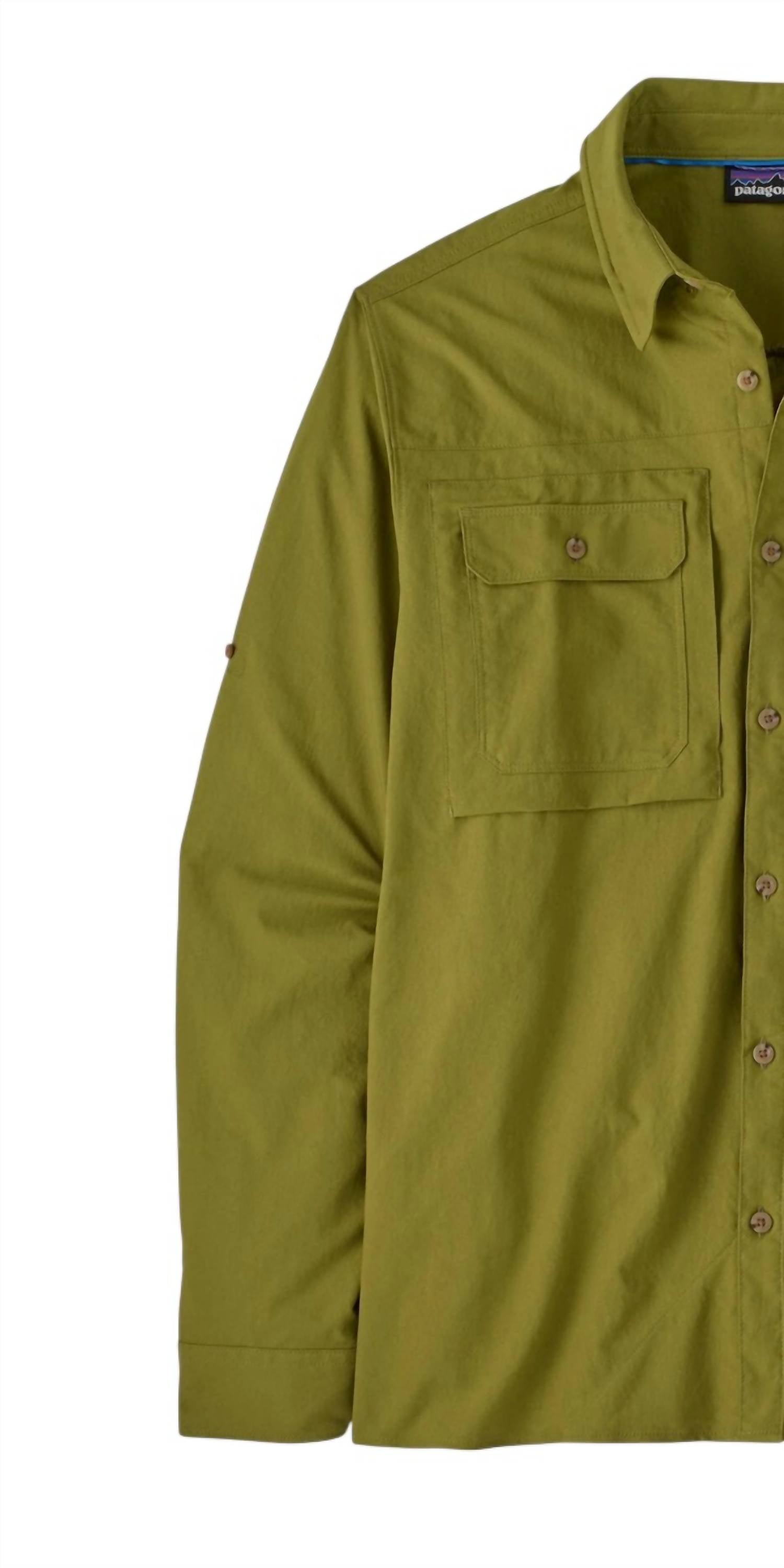 Discover the Patagonia Men's Long Sleeves Self Guided Sun Shirt in Graze Green, perfect for any outdoor adventure. This solid casual button-down shirt is crafted from 100% recycled polyester, offering a lightweight, quick-drying design with mechanical stretch and 40+ UPF sun protection. Smartly equipped with two vertical zip chest pockets, two button-closure pockets, and a hidden tool dock, it ensures ultimate functionality. Closure: Button closure. Care: Hand wash, line dry. Enjoy added features like stay-cool venting and a convertible double-layer collar for extra sun protection. Ideal for summer hiking and workwear.