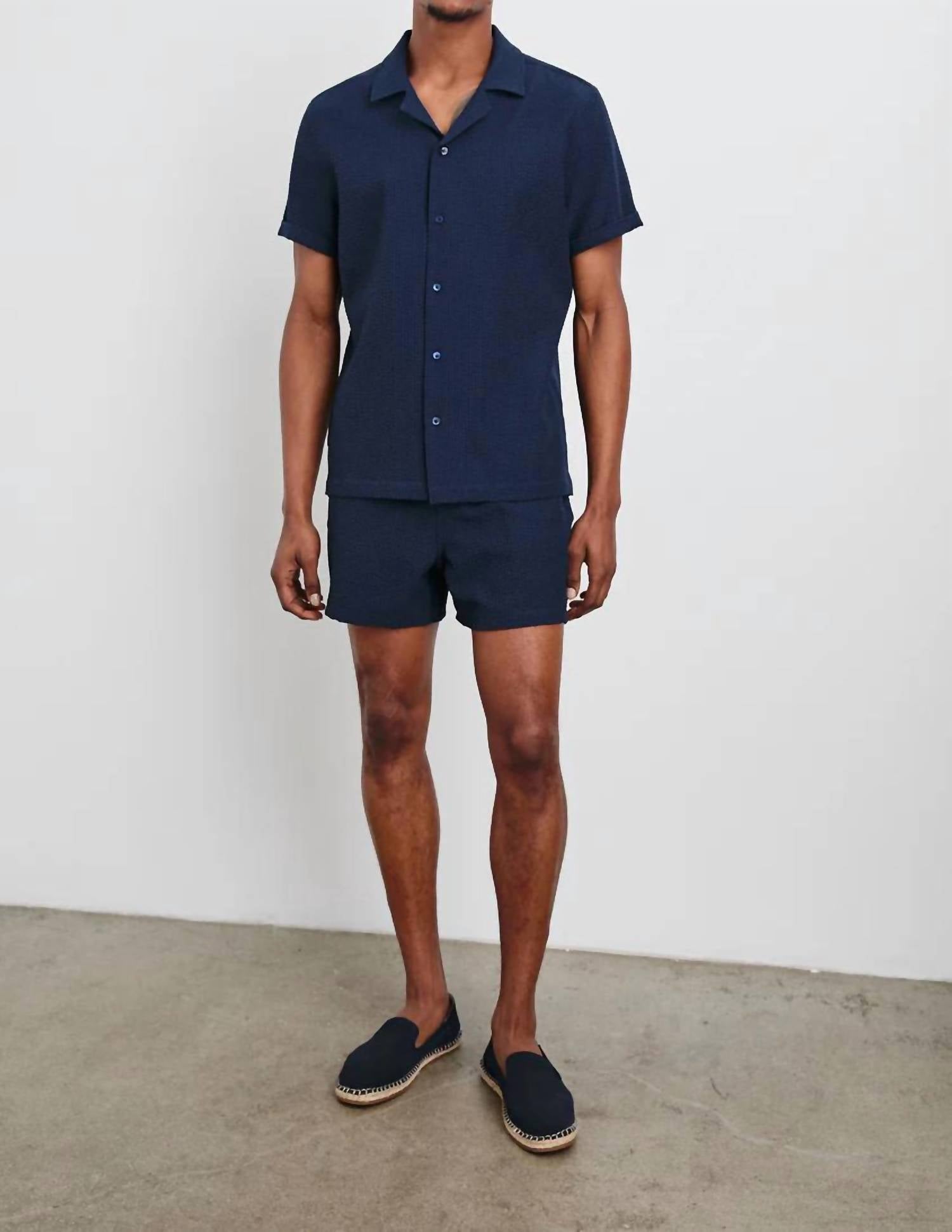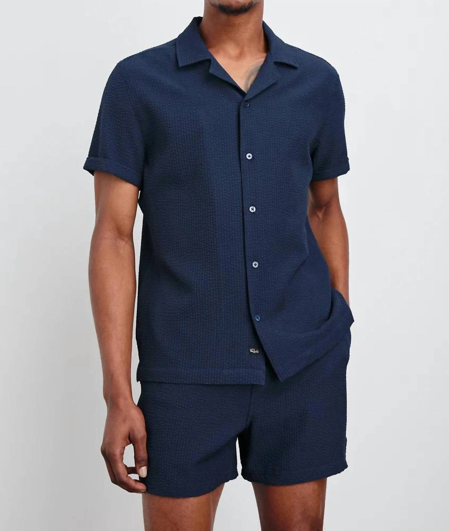 The Amalfi Shirt by Rails is a must-have for outdoor summer adventures, crafted for men seeking style and comfort. Featuring short sleeves and a classic fit, this navy shirt is made from 98% polyester and 2% spandex stretch seersucker fabric, offering an airy and textured feel. Its garment length measures 28.5 inches, complete with traditional shirting details and a button closure. Made in an imported design, it ensures easy care with machine wash cold, a gentle cycle, and low tumble dry.