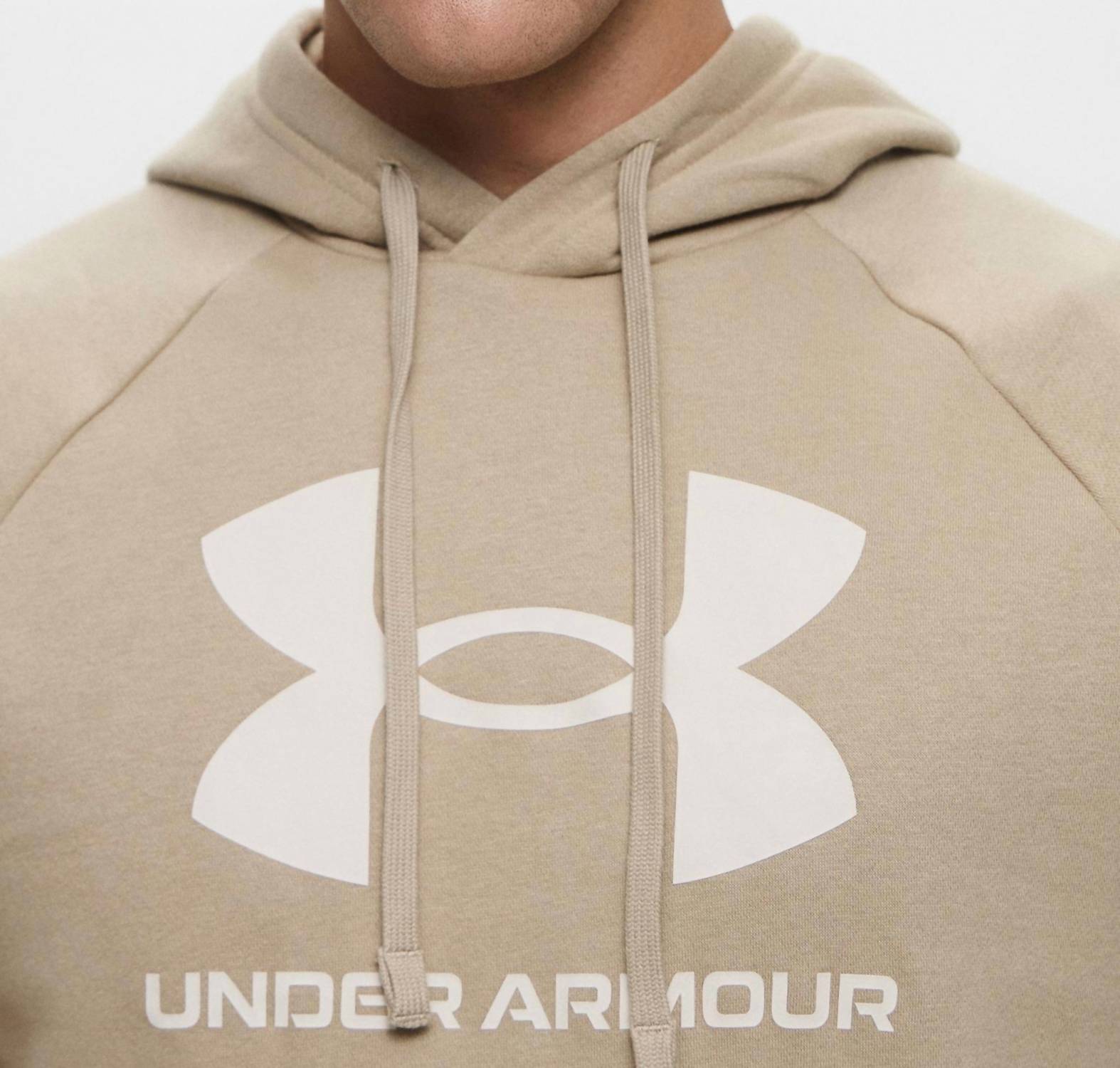 Meet the Rival Fleece Logo Hoodie by Under Armour, a perfect blend of style and comfort for men. Crafted in solid beige polyester, this hoodie features long sleeves and a hooded neckline, making it an ideal choice for spring athleisure and travel. It includes convenient pockets for added functionality. Closure: Tie closure. Care instructions: Machine wash and tumble dry.