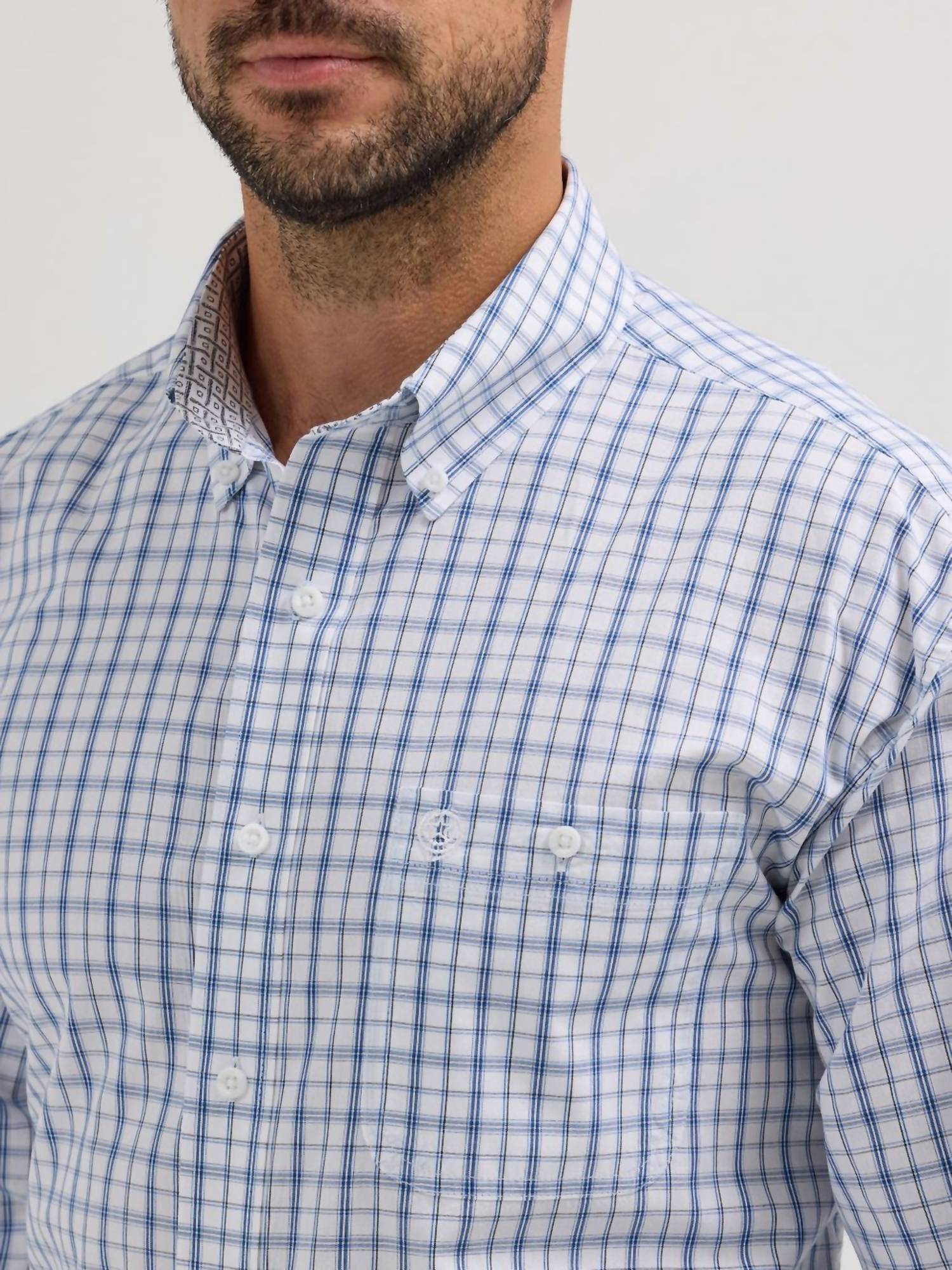 Discover the Men's George Strait Shirt by Wrangler, a white, long sleeve casual button-down perfect for vacation or spring events. Featuring a plaid and check pattern, this minimalist design resonates with maximalist trends. Designed with a collar neckline and a convenient button closure.