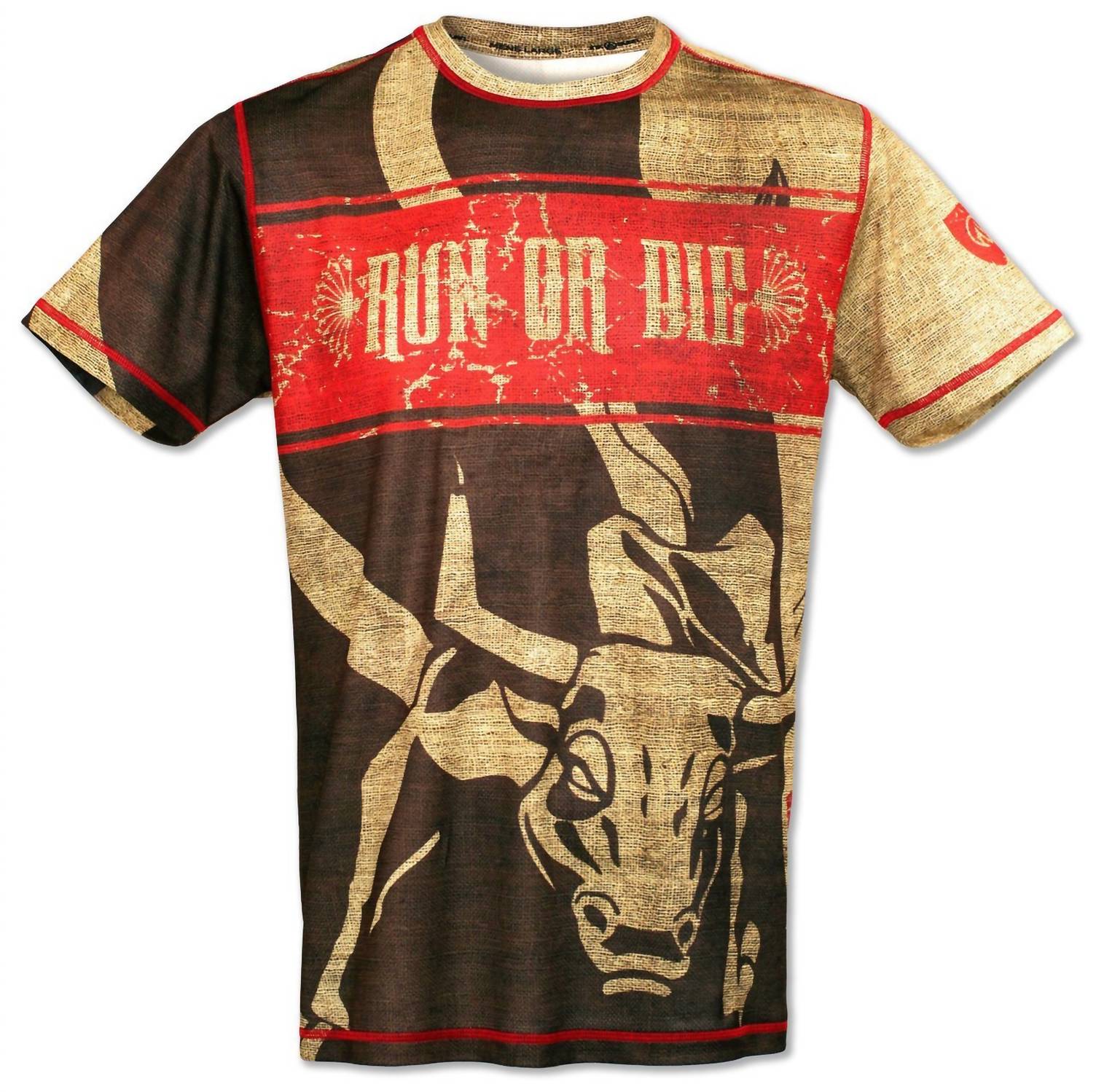 Experience the vibrant Men's Toro Tech Shirt by INKnBURN, ideal for your athletic pursuits. This short-sleeve shirt is crafted from high-performance Polyester Dry I.C.E. Technical Fabric that ensures breathability by wicking moisture away to keep you cool and dry. Designed in the USA, it features a graphic print in a multi-color retro burlap coffee bag style, finished with a crewneck and a pull-on closure. Care is effortless with machine wash and tumble dry instructions, making it perfect for fitness enthusiasts seeking lasting comfort in their activewear.