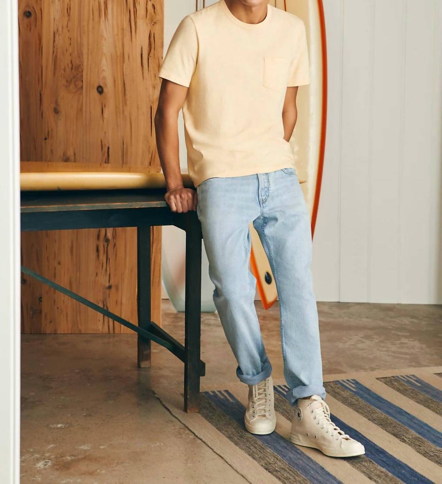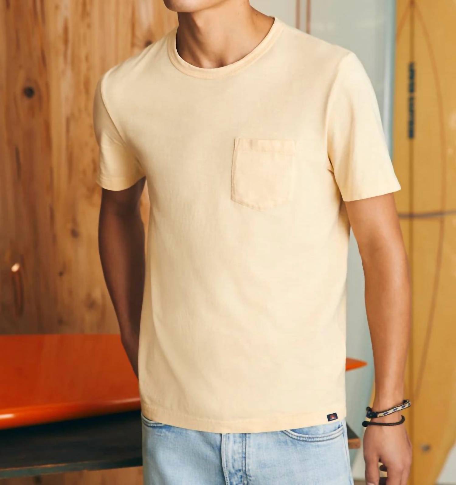 Discover the Faherty Men's Sunwashed Pocket Tee in a vibrant Sunny Days hue, an essential crafted for ultimate comfort. This short sleeve tee is made from organic cotton and designed with a crewneck, offering a relaxed silhouette and a solid pattern. With a handy pocket detail, it’s an ideal pull-on style perfect for any casual setting. Care instructions include machine wash and lay flat to dry.
