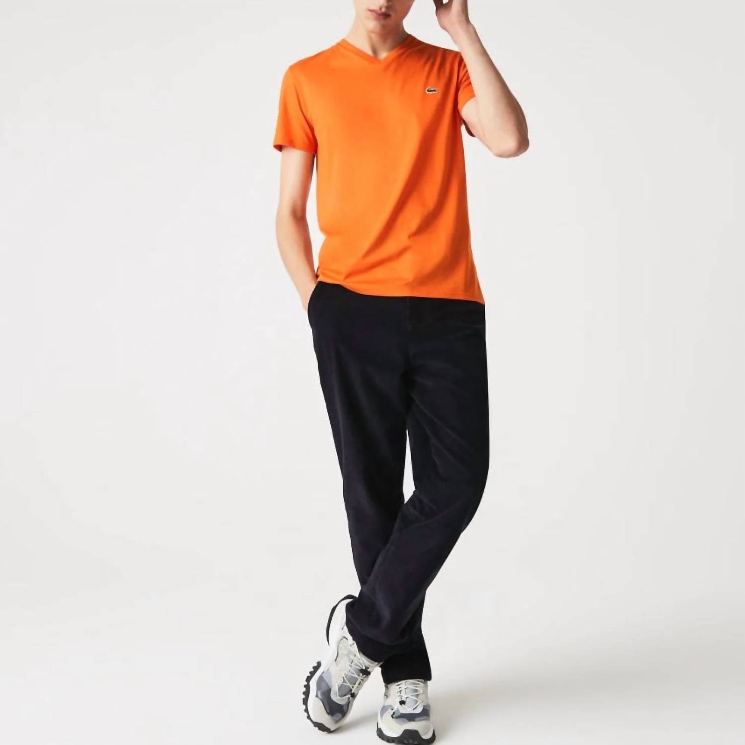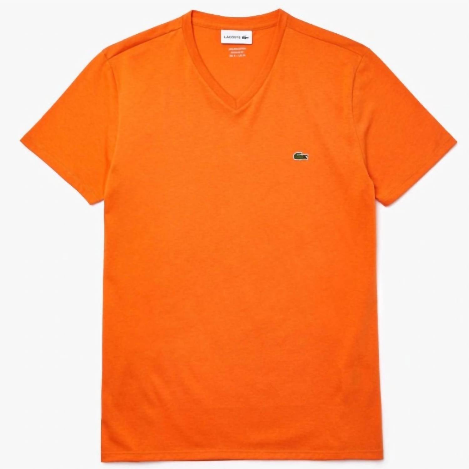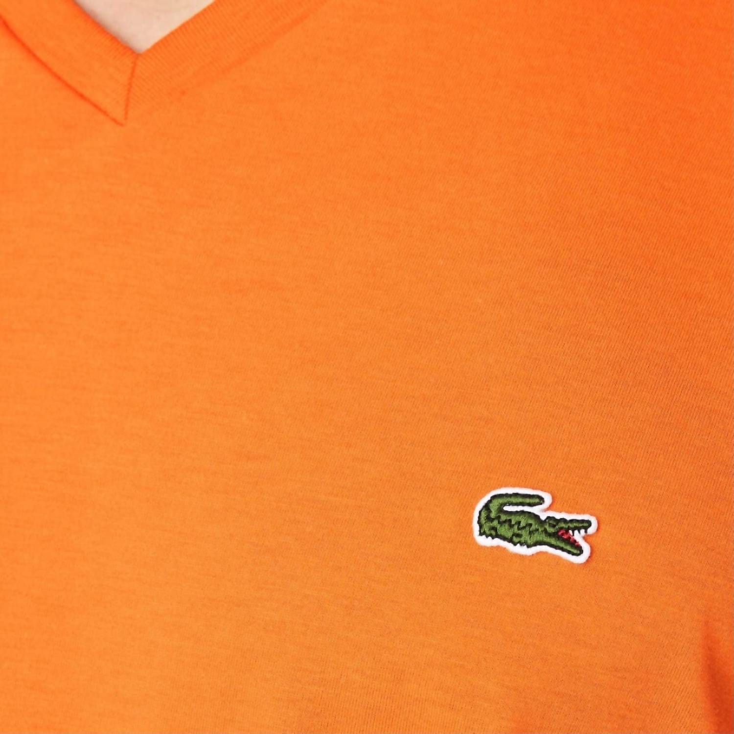 Elevate your wardrobe with the LACOSTE Men's Short Sleeve Tee in vibrant orange, a staple for minimalist, vacation-friendly style. Crafted from 100% Pima Cotton jersey, this solid V-neck tee showcases classic elegance with a distinctive embroidered Green Crocodile logo on the chest. It features a pull-on closure for easy wear and a transfer branding on the neckband lining. Perfect for activewear and casual occasions this fall season.