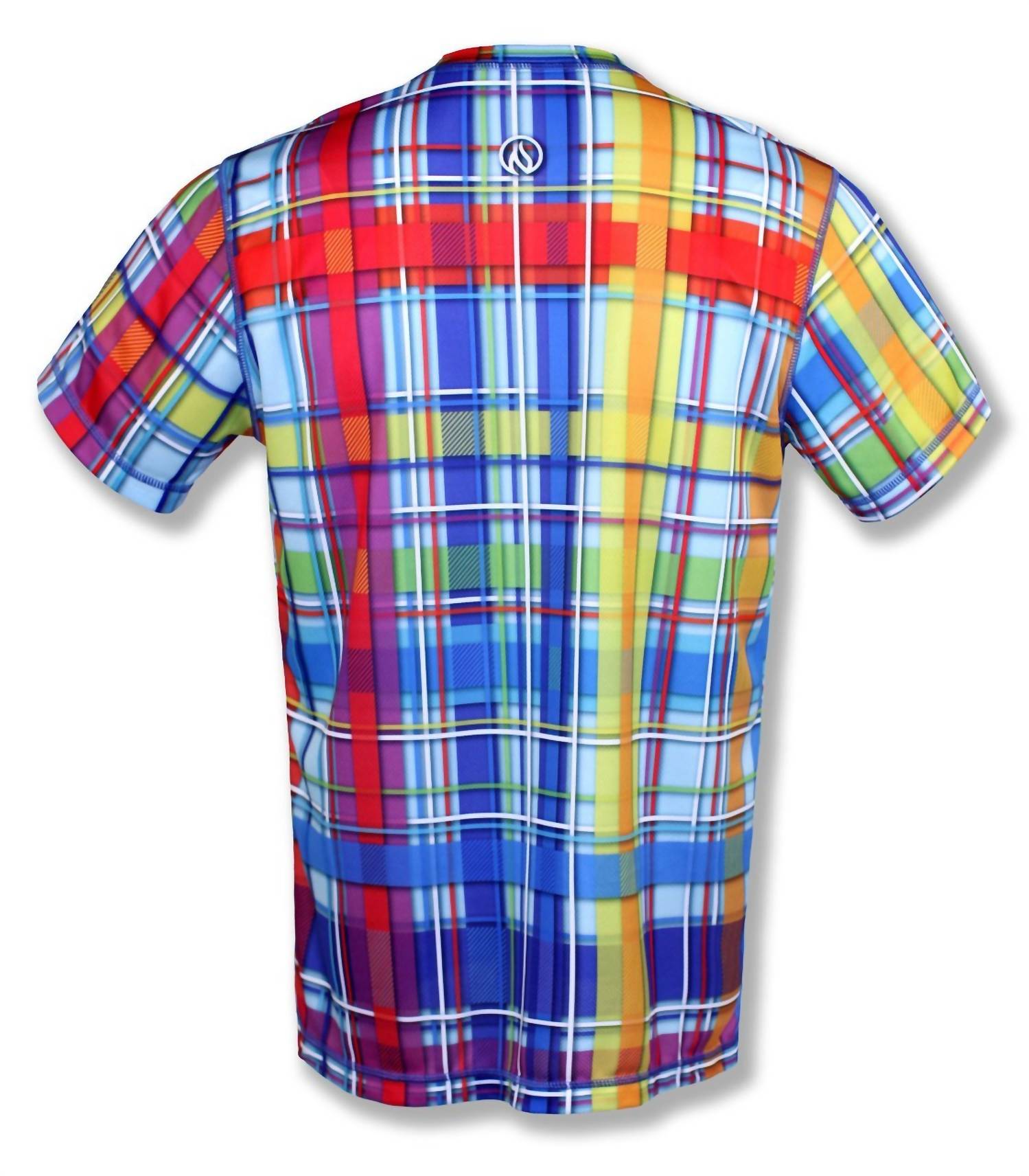 Celebrate Pride with the Men's Rainbow Tech Shirt by INKnBURN, featuring short sleeves in a vibrant, multi-dimensional plaid. This patterned piece is composed of Dry I.C.E. tech polyester, ensuring quick moisture wicking and vibrant, lasting color. Made in the USA, it features a comfortable crewneck and pull-on closure to support your active lifestyle. Care: Machine wash and line dry.