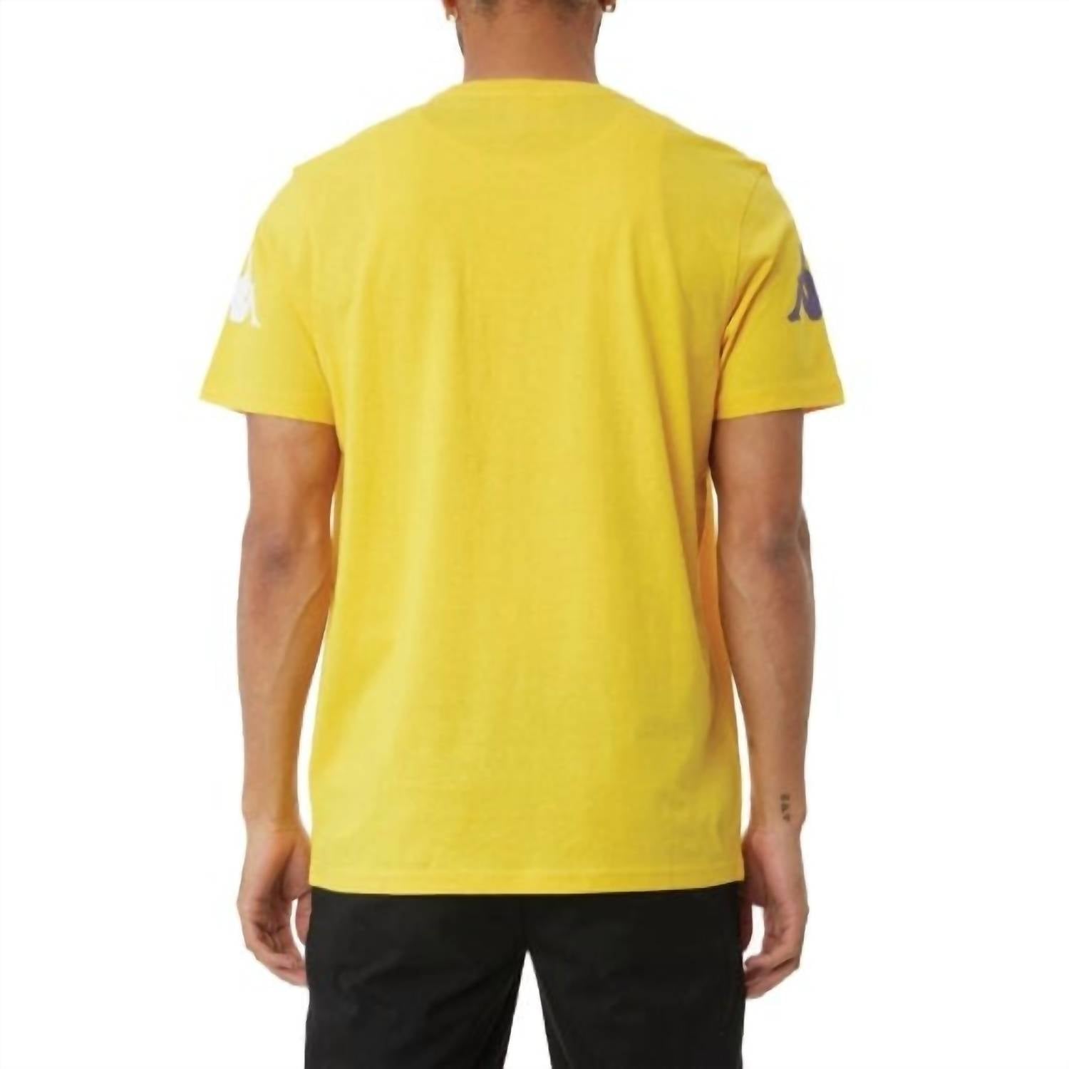 Elevate your summer wardrobe with the Authentic Paroo Tee Shirt by Kappa, a streetwear essential in a striking yellow/violet-white/black colorway. This men's regular fit tee features short sleeves and a crewneck, adorned with Kappa lettering printed on the chest and the iconic Omini logo on the sleeves. Crafted from 100% cotton, this graphic tee offers both comfort and style for vacation-ready looks. Closure: Pull-on.