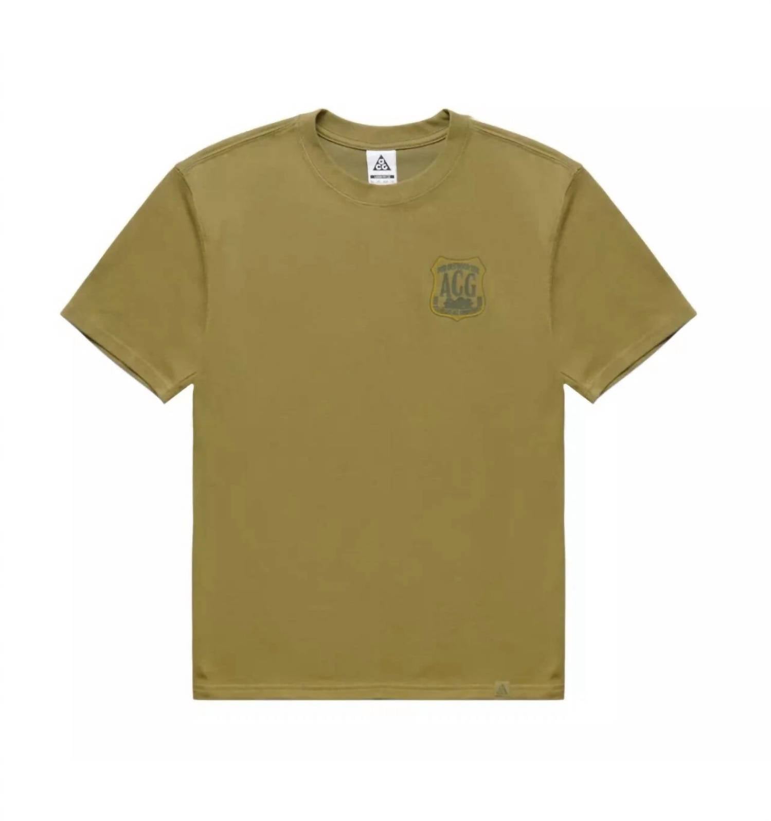 Elevate your summer wardrobe with the Nike ACG Men's For Outdoor Use T-Shirt, crafted in a stylish olive hue. Embrace the streetwear trend with its graphic design, featuring short sleeves and a classic crewneck, perfect for vacation adventures. The shirt offers a comfortable pull-on closure without any pockets. Made for versatility and ease, the piece lacks specific care instructions but promises a timeless fit.