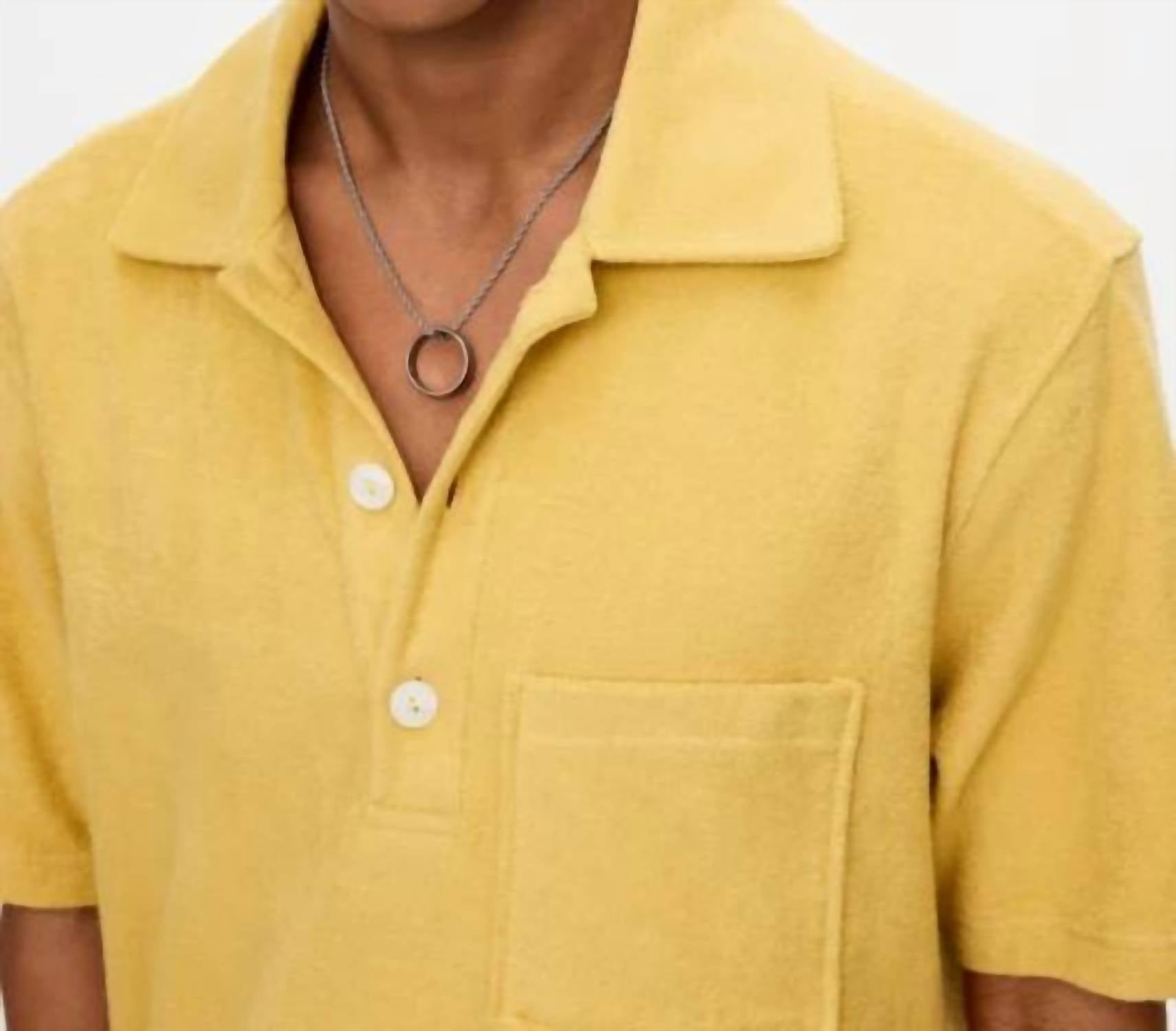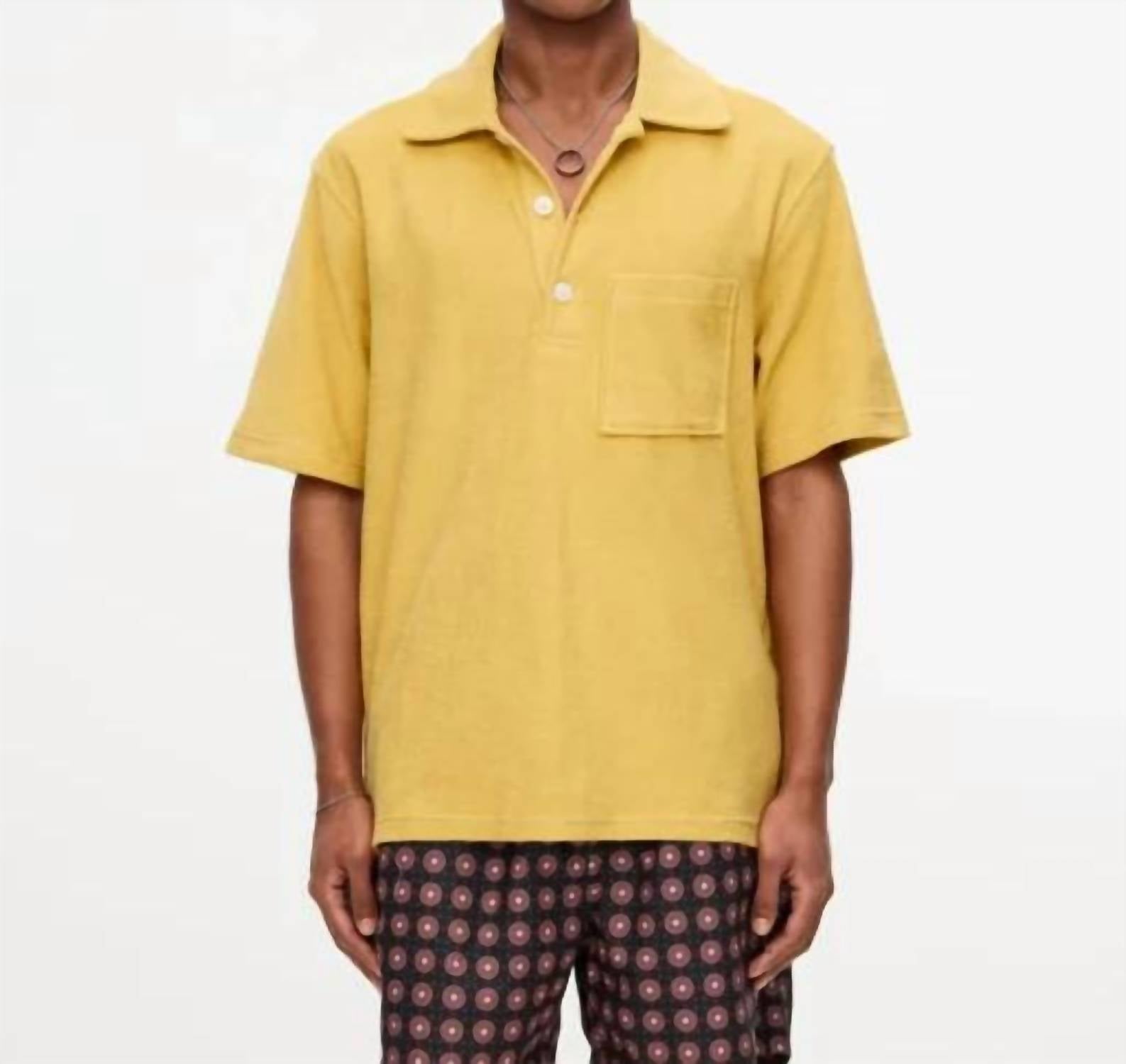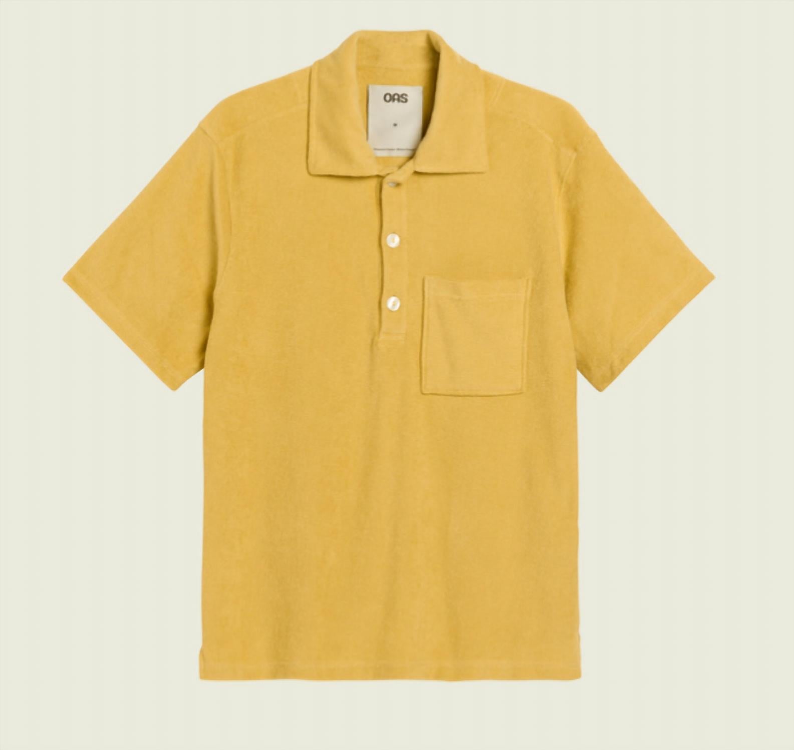 Introducing the Zabaione Terry Shirt by OAS, a minimalist summer staple for men. This yellow short-sleeve shirt, crafted from cotton, showcases a solid pattern and a classic collar. Originating from Portugal, it features a convenient pull-on closure and includes pockets for practicality. Care for it easily with machine wash instructions.