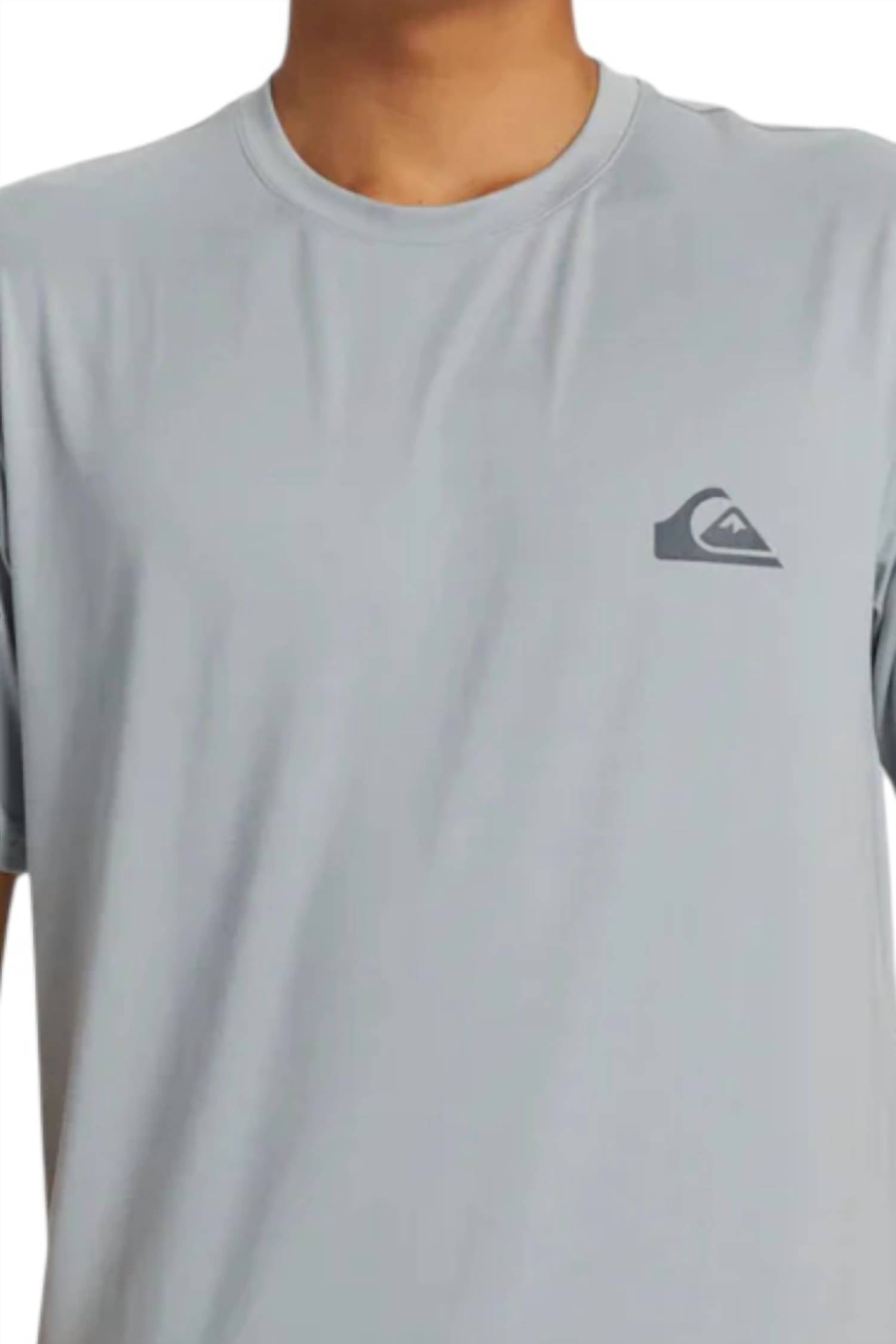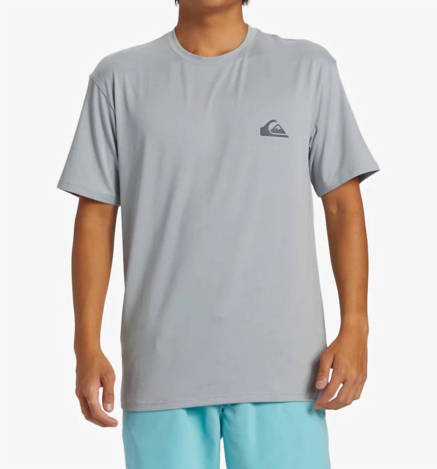 Presenting the Quiksilver Everyday Surf Short Sleeve Tee in solid SJE0-Quarry, designed for optimal comfort and sun protection. This tee boasts short sleeves and is crafted from a premium blend of 92% recycled polyester and 8% elastane. It features a pullover closure and is perfect for summer vacations with its UPF 50+ sun protection and moisture-wicking properties. Care for this garment by hand washing and line drying. Ideal for streetwear and activewear, this tee is a reliable companion for your summer adventures.