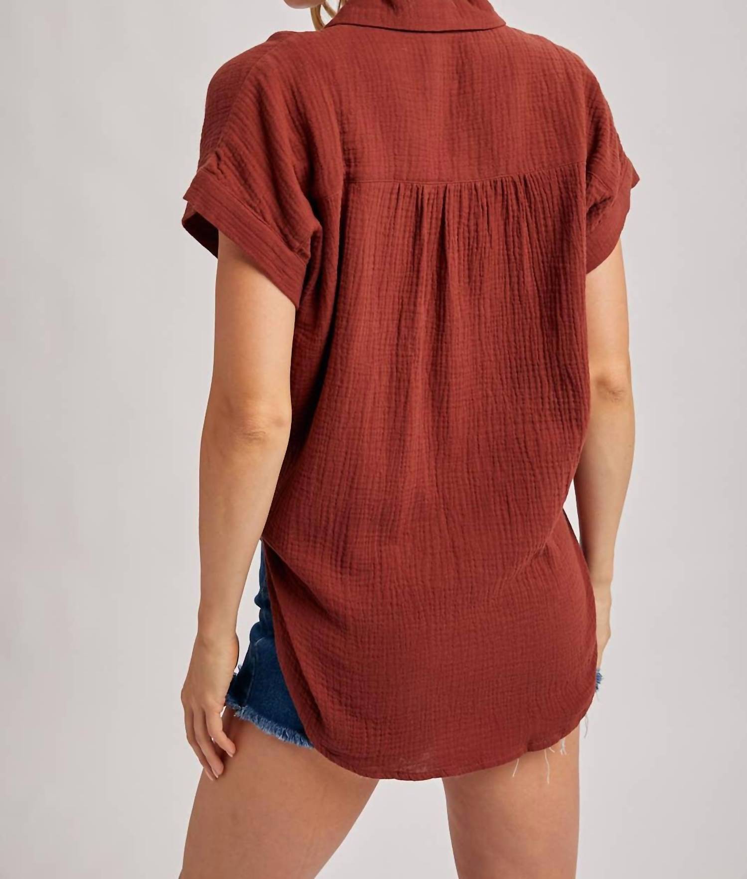 Elevate your wardrobe with the Essential Button Up Cotton Shirt by BluIvy in a sophisticated brick hue. This short-sleeve shirt, crafted from 100% textured cotton, offers a breathable, relaxed fit perfect for daily wear. The classic collar and button closure add a timeless appeal, making it an ideal choice for any occasion. Care for this piece is simple with machine wash instructions, ensuring your style remains effortlessly chic.