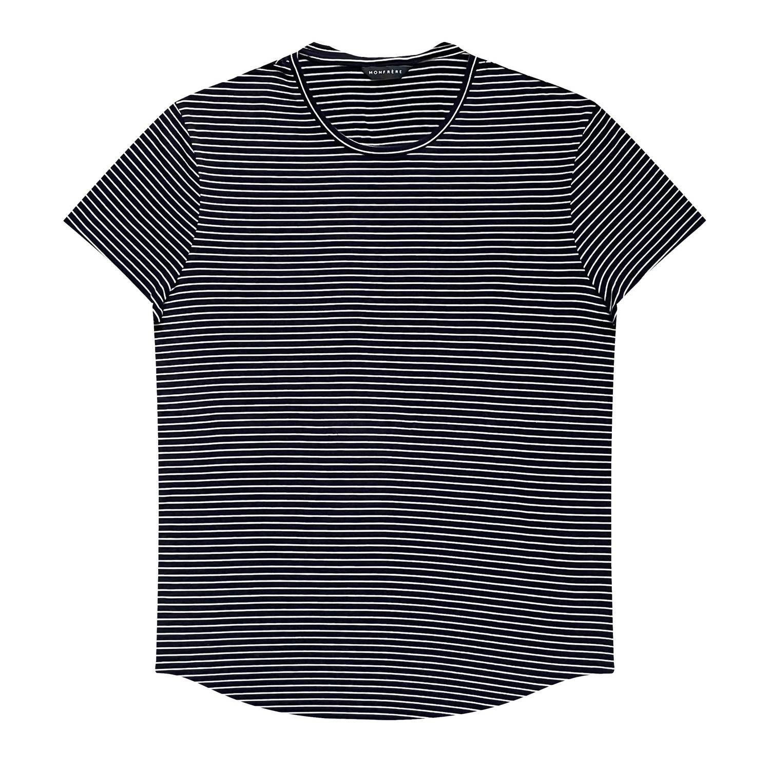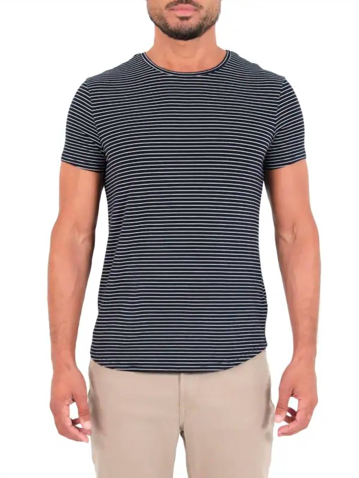 Stylish short sleeve tee showcasing noir stripes and crafted for comfort. Made from 95% viscose and 5% elastane. Crewneck T-shirt is about 26" in length, ensuring a perfect fit. Pull-on closure adds convenience. Stretchy fabric enhances wearability. Care for this piece with ease using machine washing instructions.