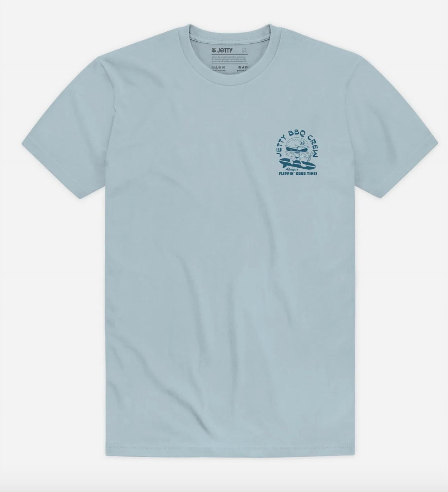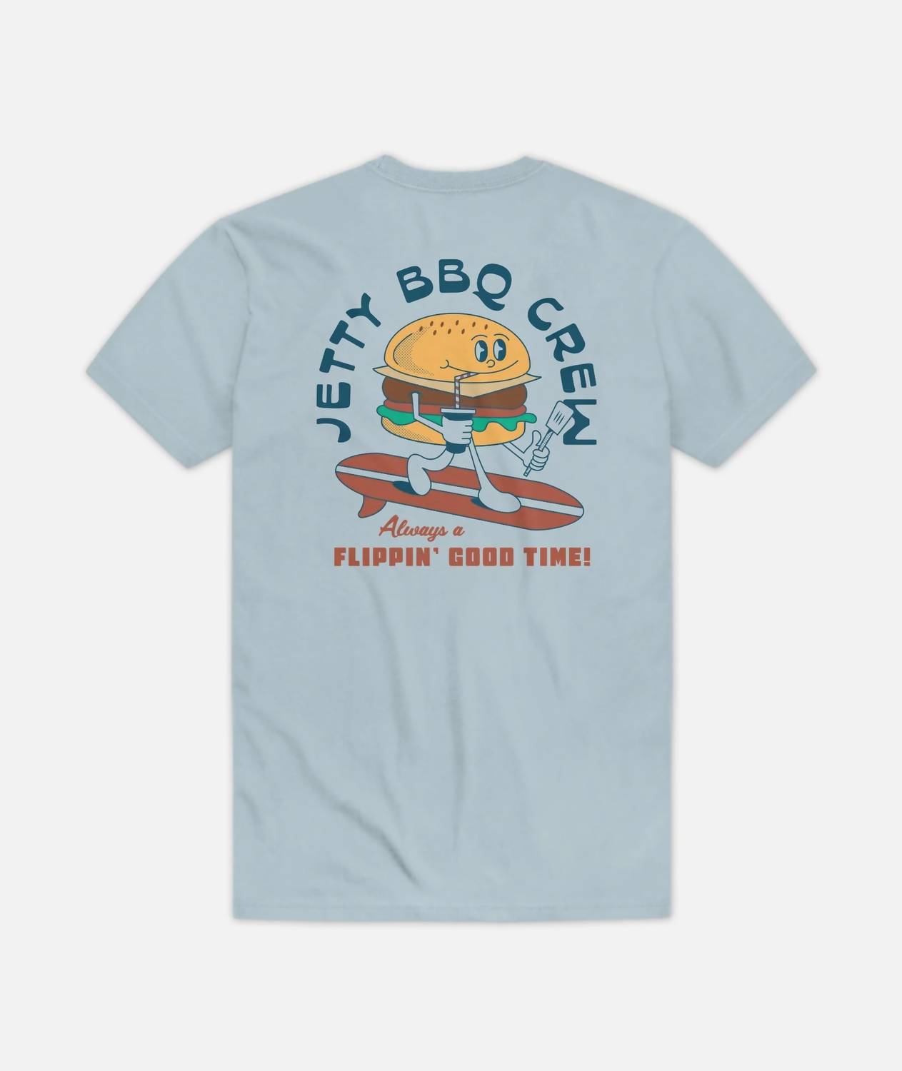 Introducing the Men's Burger Crew Shirt by Jetty, a casual streetwear essential for your vacation wardrobe. This short sleeve tee in a light blue hue is crafted from a comfortable cotton blend for a premium ultra-soft feel. It features a graphic pattern and a classic crewneck design, and its pull-on style makes it easy to wear. Designed and printed in New Jersey with water-based discharge ink, this piece is all about effortless style and comfort.