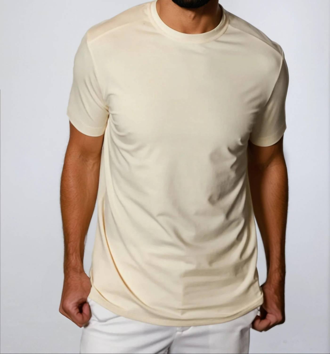 Introducing the Buki Cinqo Crew Neck T-shirt in the refreshing Maize color, your new favorite for minimalist style and travel-ready comfort. This solid short sleeve tee is crafted from innovative Supima Plus performance knit, bringing you the softest feel with advanced moisture management and four-way stretch. Closure: Pull-on. Care: Machine wash. Engineered in Seattle, this shirt offers wrinkle resistance and vibrant color retention up to 50 washes, making it a sustainable everyday essential.