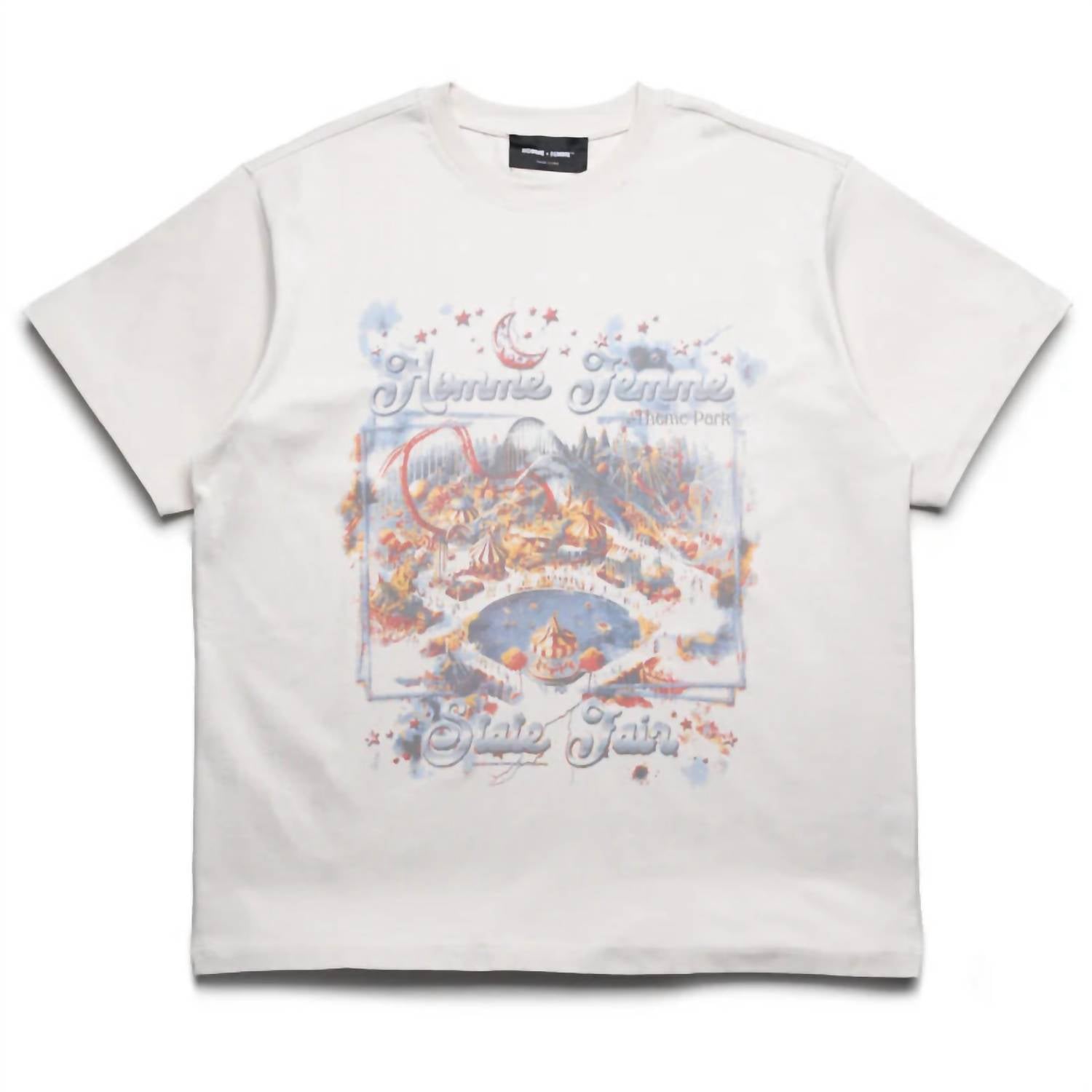 Introducing the Men's Carnival Short Sleeve Tee by Homme + Femme, a streetwear staple perfect for spring music festivals. This off-white tee, crafted from 100% cotton, features a boxy fit and a captivating graphic inspired by the allure of state fairs. Designed with a classic crewneck and short sleeves, it offers a casual yet stylish appeal. Easy to care for, simply machine wash and tumble dry this versatile piece.