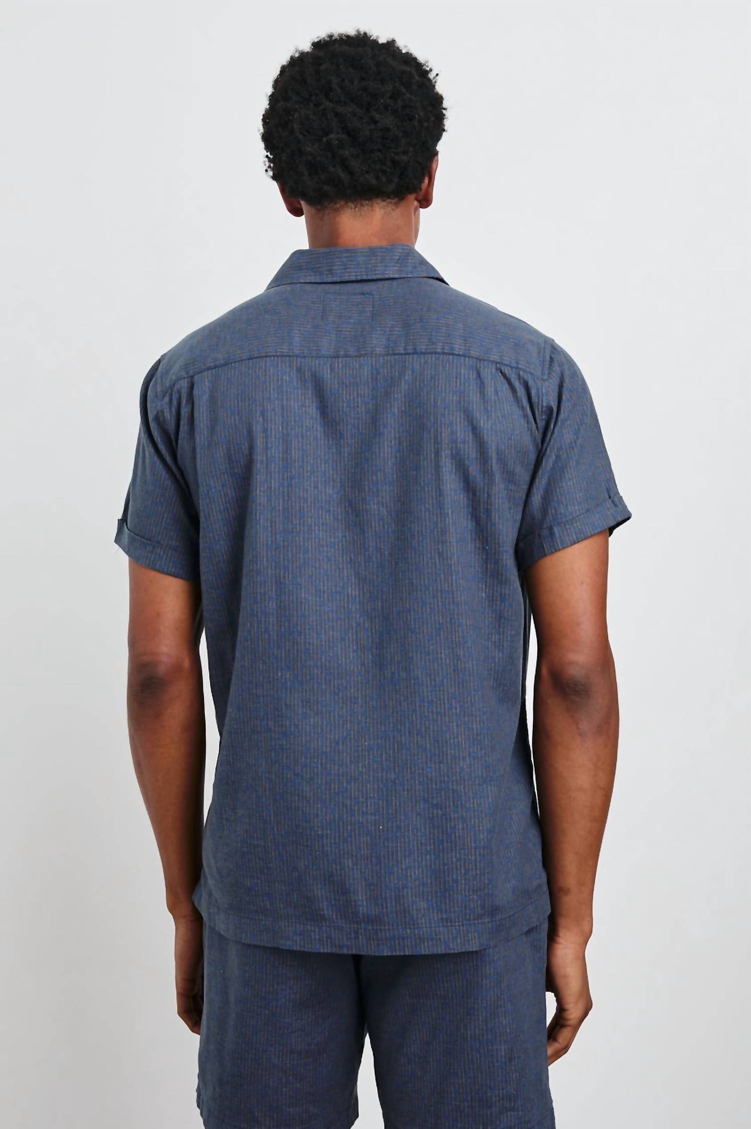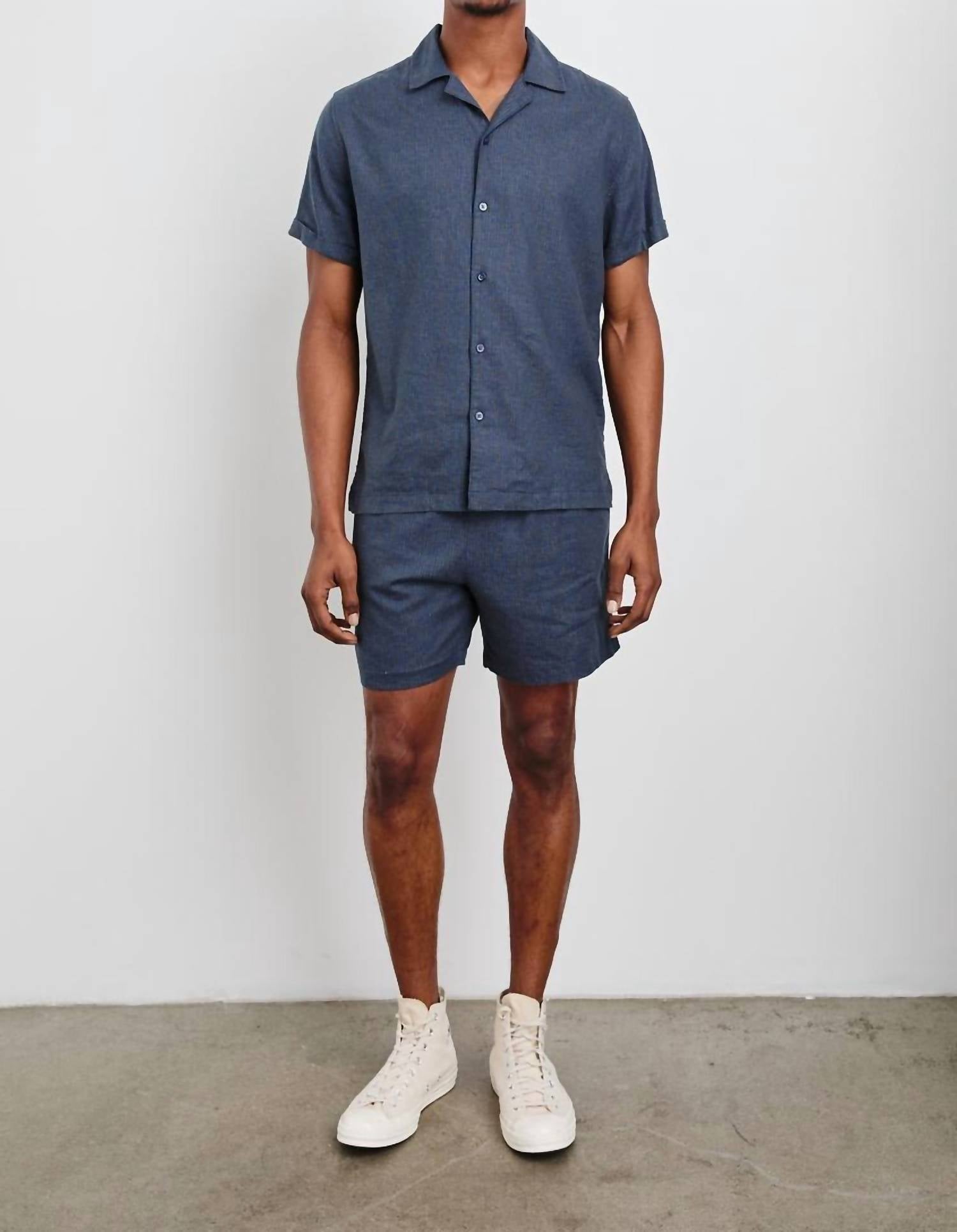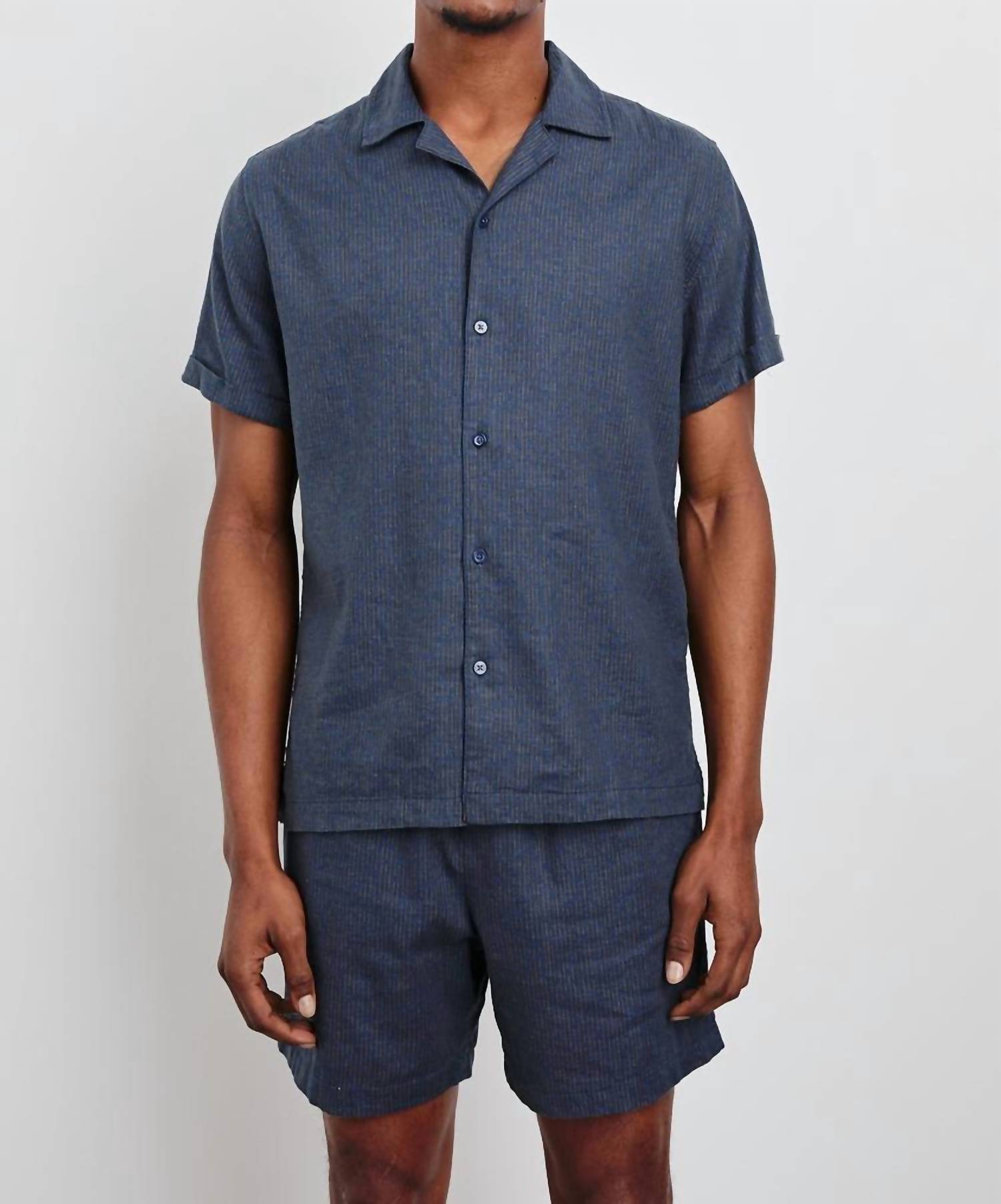 Introducing the Rails Atlas Short-sleeve Shirt in a striking Navy Cedar Vertical color. This men's shirt is made from a stretch linen blend, incorporating 53% Linen, 44% Rayon, and 3% Spandex, to provide both comfort and versatility. With a button closure and Art Deco-inspired print, it stands out whether worn alone or paired with the Aries Short. Designed with classic shirting details, this piece is imported and should be machine washed cold and line dried.