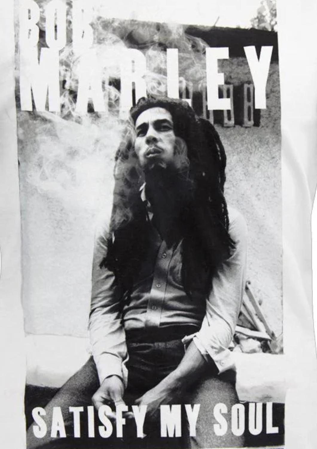 Celebrate music and style with the Men's Satisfy My Soul Short Sleeve T-shirt by Bob Marley. This white, graphic-printed T-shirt features a striking black-and-white portrait of the legendary singer-songwriter Bob Marley, accompanied by the text "MARLEY" and "SATISFY MY SOUL." Crafted from soft cotton, it's designed with short sleeves and a casual crewneck for a relaxed fit. Enjoy easy wear with its pull-on closure and maintain its quality through machine washing. Perfect for music festivals and streetwear enthusiasts, this tee is a nod to both comfort and legendary musical influence.