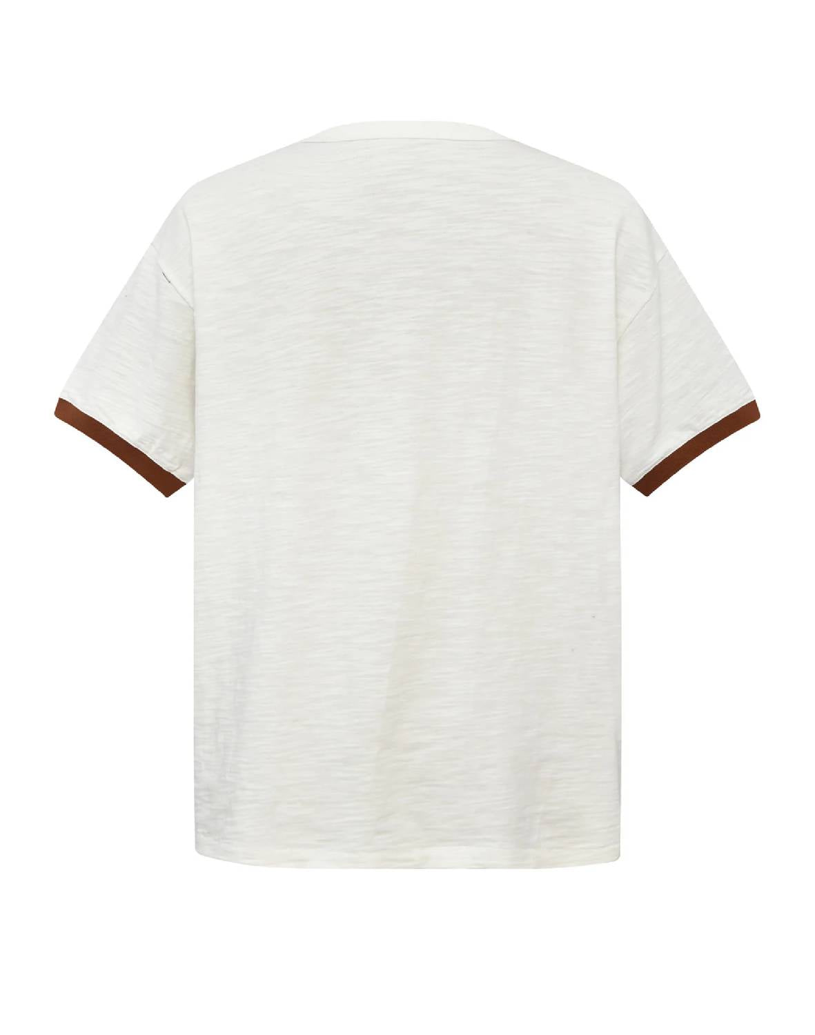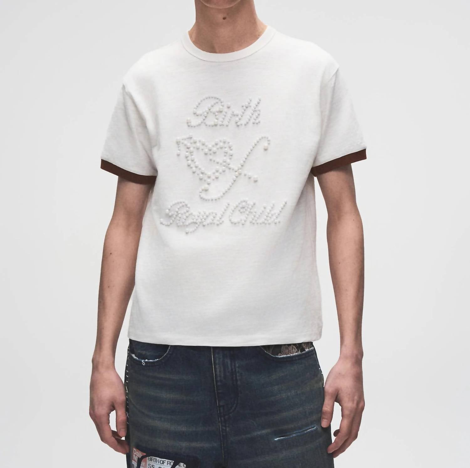 Introducing the Pearl Patchwork Logo T-shirt by Birth of Royal Child, a stunning blend of creativity and elegance. This short sleeve tee in white and brown features a crew neck and a pearl-embellished logo with contrast sleeve trim, creating a playful yet sophisticated look. Made from 100% cotton Jersey, this regular fit design boasts a straight hemline and a sleek pullover style. Perfect for evening events, it offers a minimalist touch inspired by nature and spirituality.