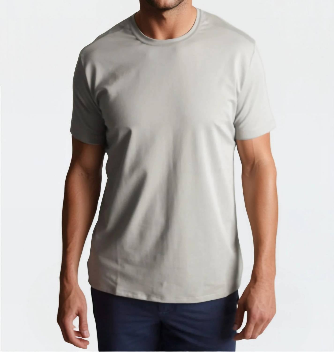 The Buki Cinqo Crew Neck T-shirt in Vetiver is the epitome of luxury and modern technology for men seeking minimalist style. This short-sleeve tee, made from revolutionary Supima Plus performance knit, promises buttery softness with advanced moisture management and wrinkle resistance. Designed without pockets and featuring a classic pull-on closure, this solid color tee offers four-way stretch and outstanding color retention for a lasting polished look. While care instructions are not provided, you can trust it will maintain its premium quality through every wear. Model is 6'2" and wears a size L, making it perfect for any dinner party.