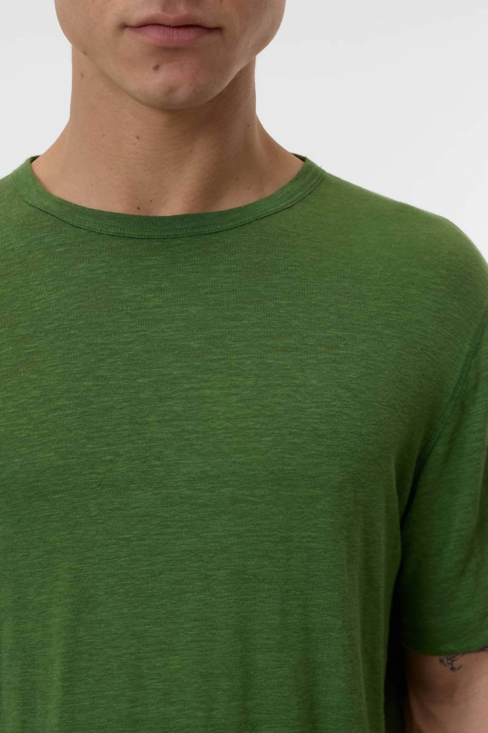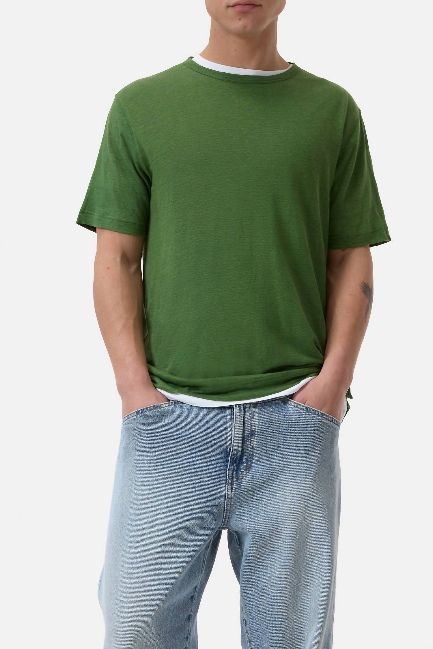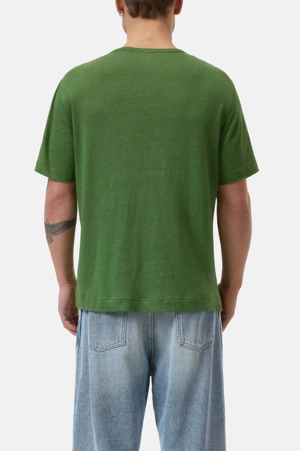 Discover the Linen Blend Crew T-shirt by CLOSED, a stylish addition to any summer wardrobe in a smoky blue hue. This men's t-shirt boasts short sleeves and a solid pattern, crafted from a fine linen jersey that includes a touch of elastane for added comfort. With a pull-on closure, it features a regular fit, a crewneck, and a straight hemline with side slits. Care instructions include machine wash and tumble dry.