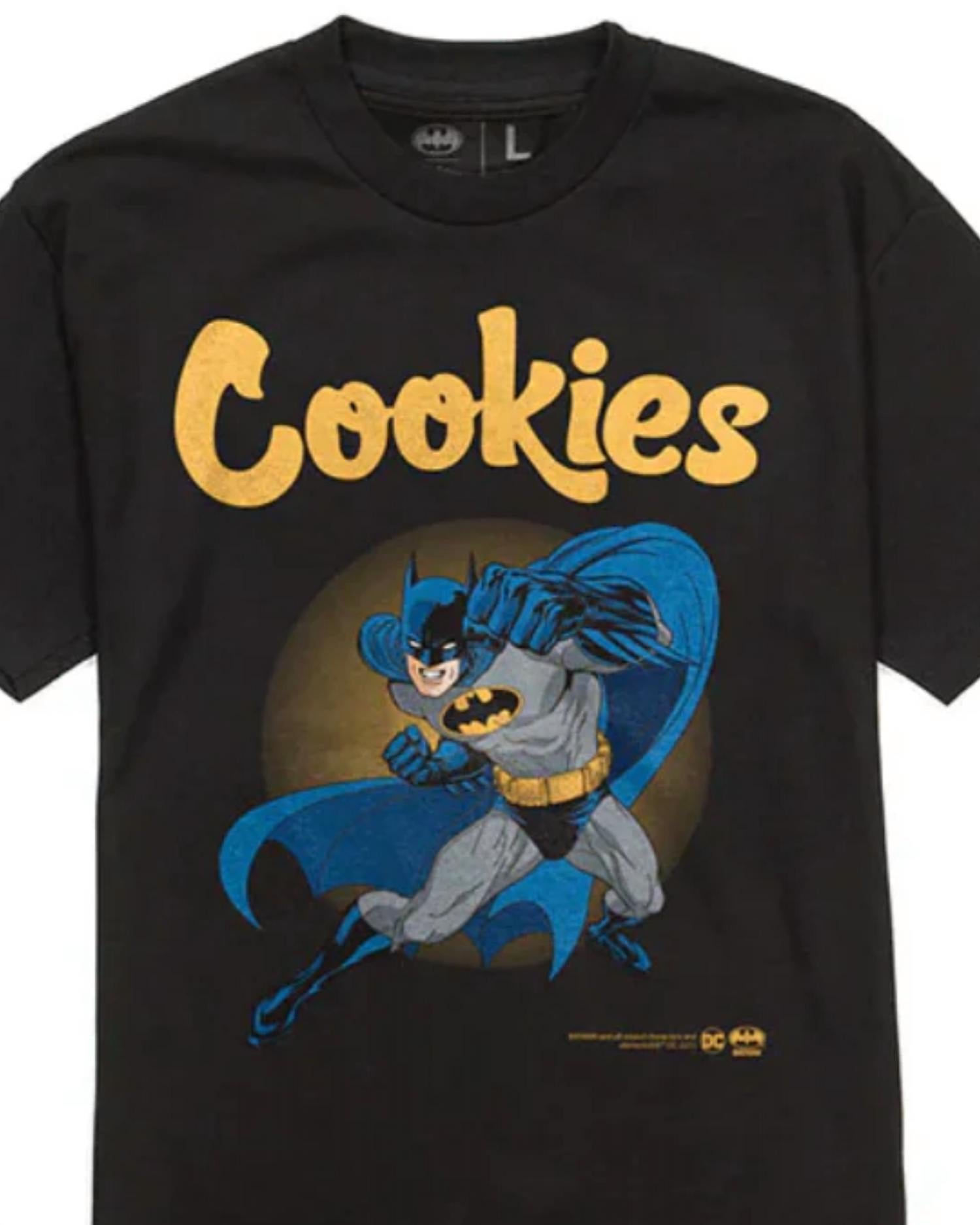Introducing the Men's Official Batman Shirt by Cookies, the perfect streetwear piece for Batman enthusiasts. This short sleeve tee is crafted from 100% cotton jersey with a 6.0-ounce weight for comfort and durability, featuring a set-in rib collar and shoulder-to-shoulder taping. With a crewneck design and pull-on closure, it's preshrunk to minimize shrinkage and offers easy wear for casual outings or a dinner party. Complete with double needle sleeve and bottom hems, this graphic tee in black is an ideal summer staple.