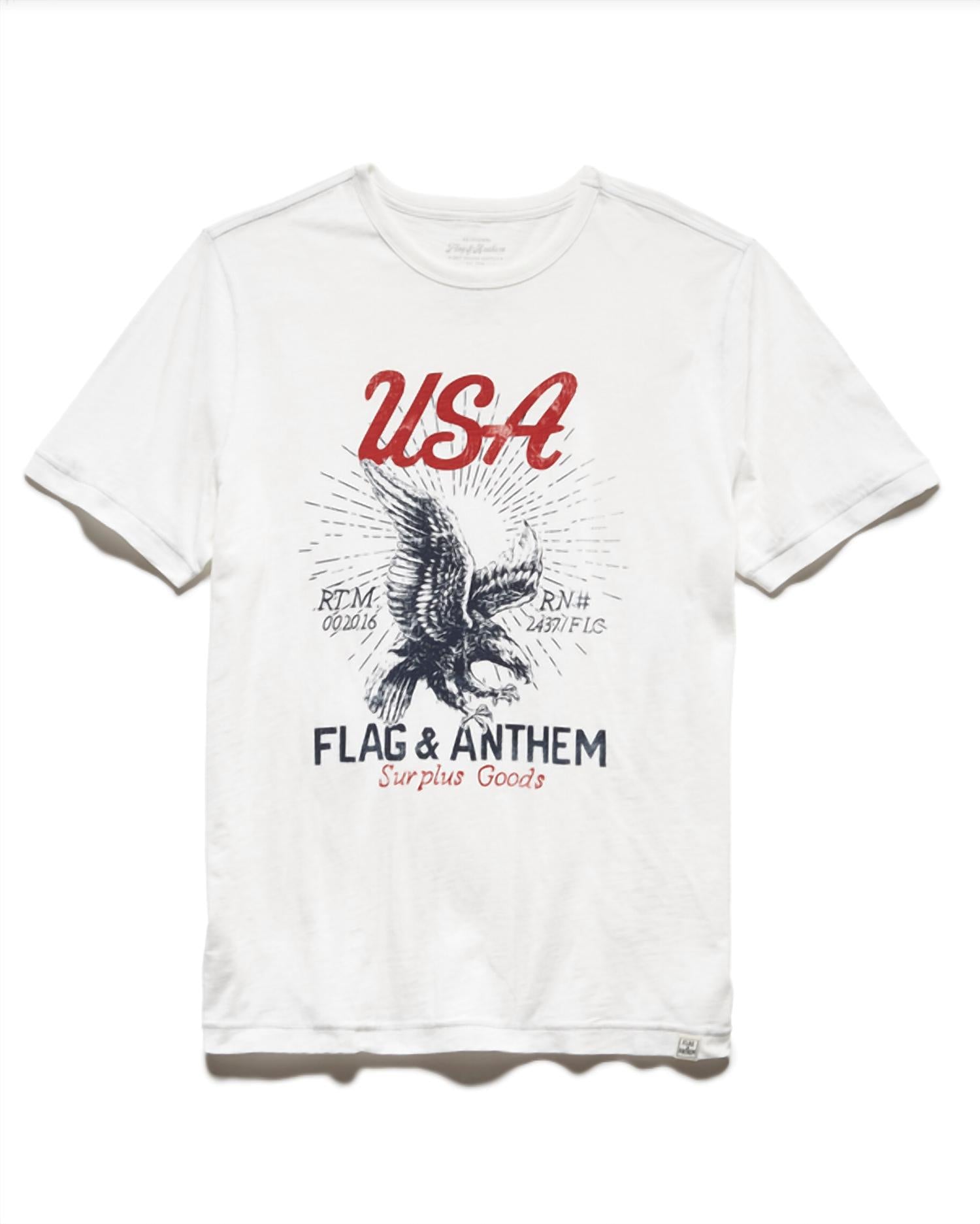 Celebrate your style with the USA Eagle Slub Tee by Flags & Anthem, an ideal choice for casual comfort. This men's tee features short sleeves and a classic crewneck design, offering a relaxed fit with its 28.5-inch garment length. Crafted from 100% cotton, it has a graphic pattern on a clean white canvas and is easy to wear with its pull-on closure. Care for this tee is hassle-free with machine wash instructions, ensuring it remains a staple in your wardrobe.