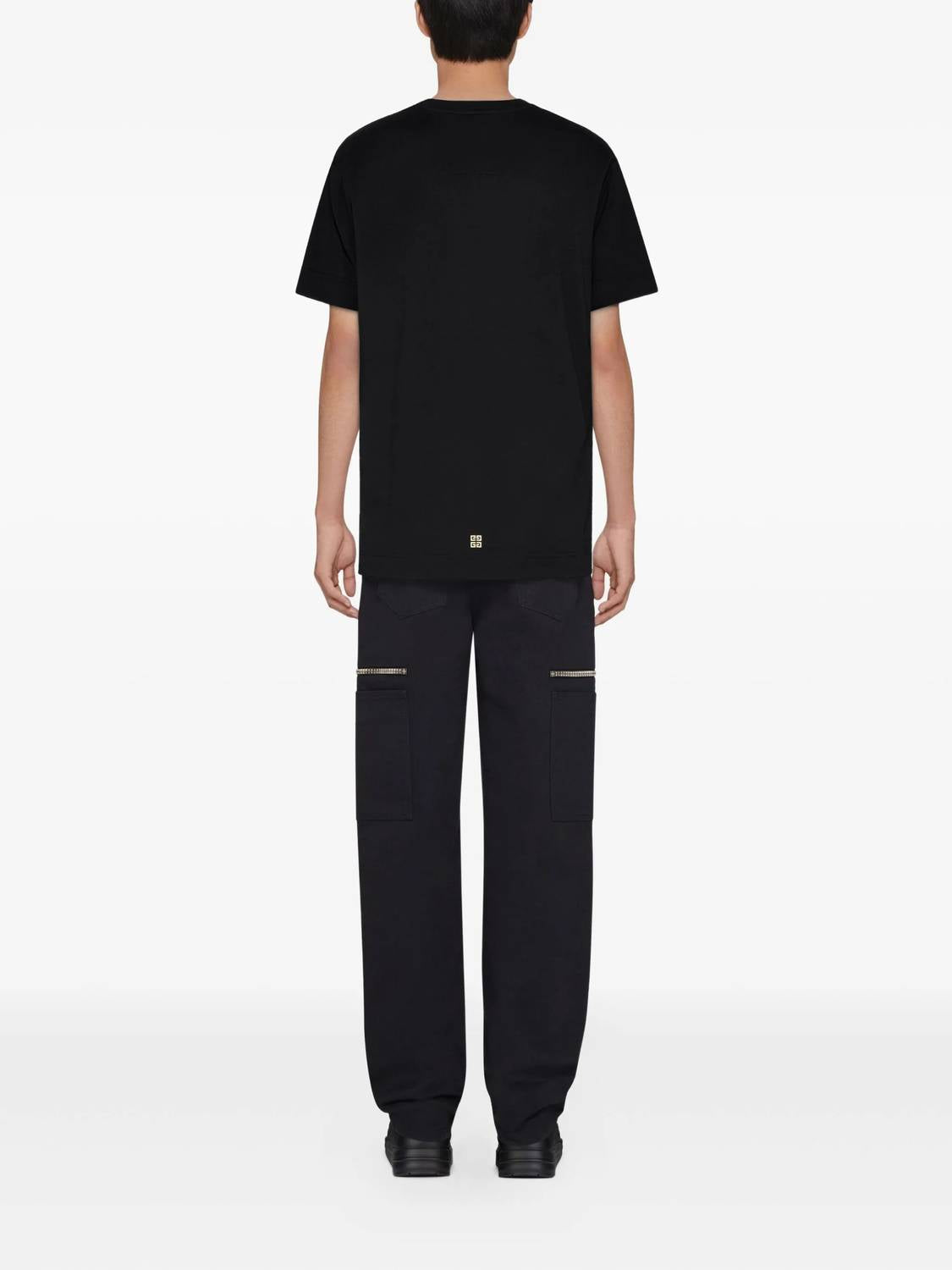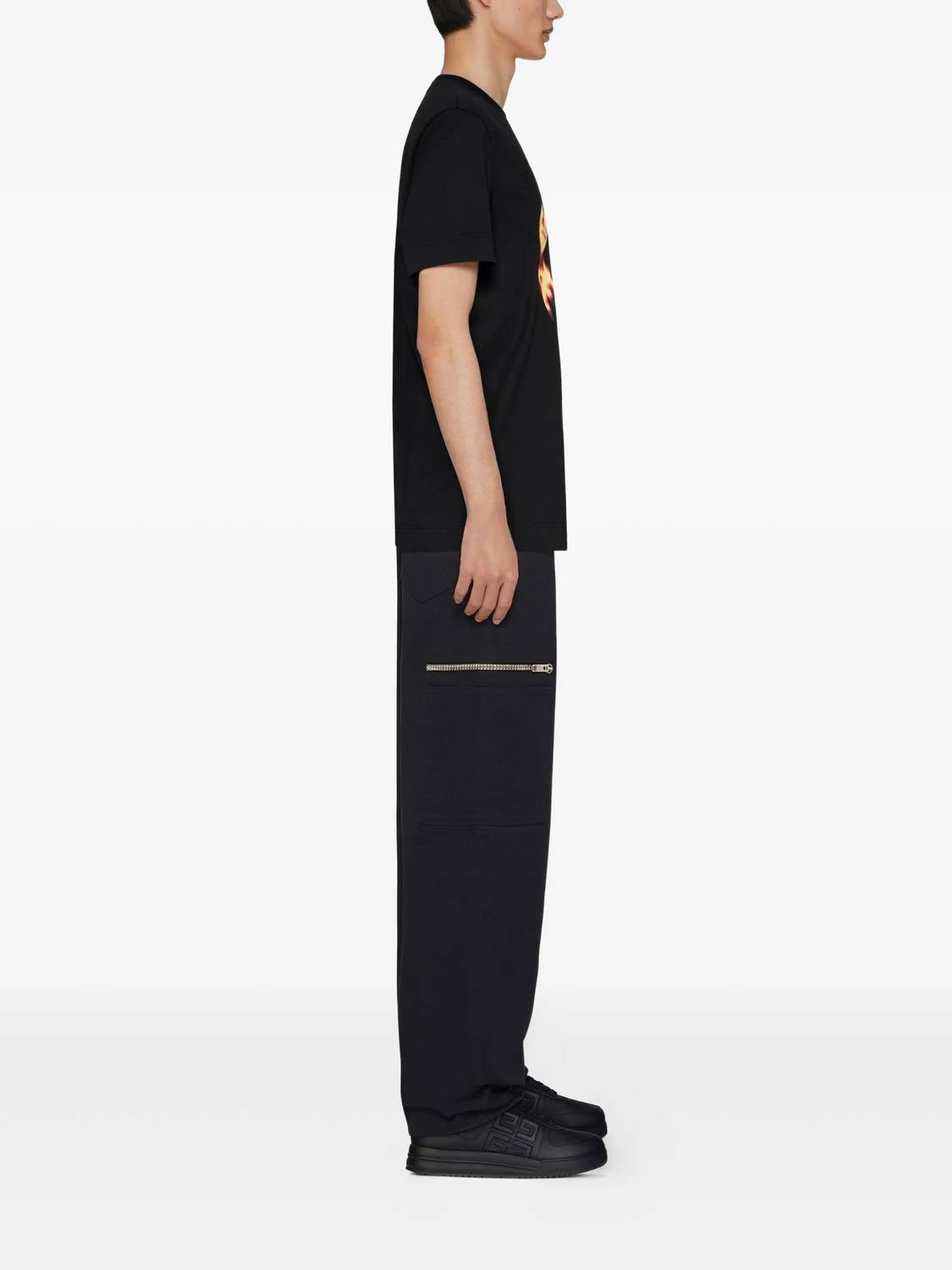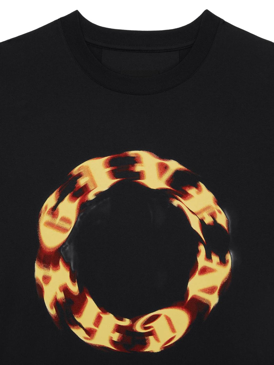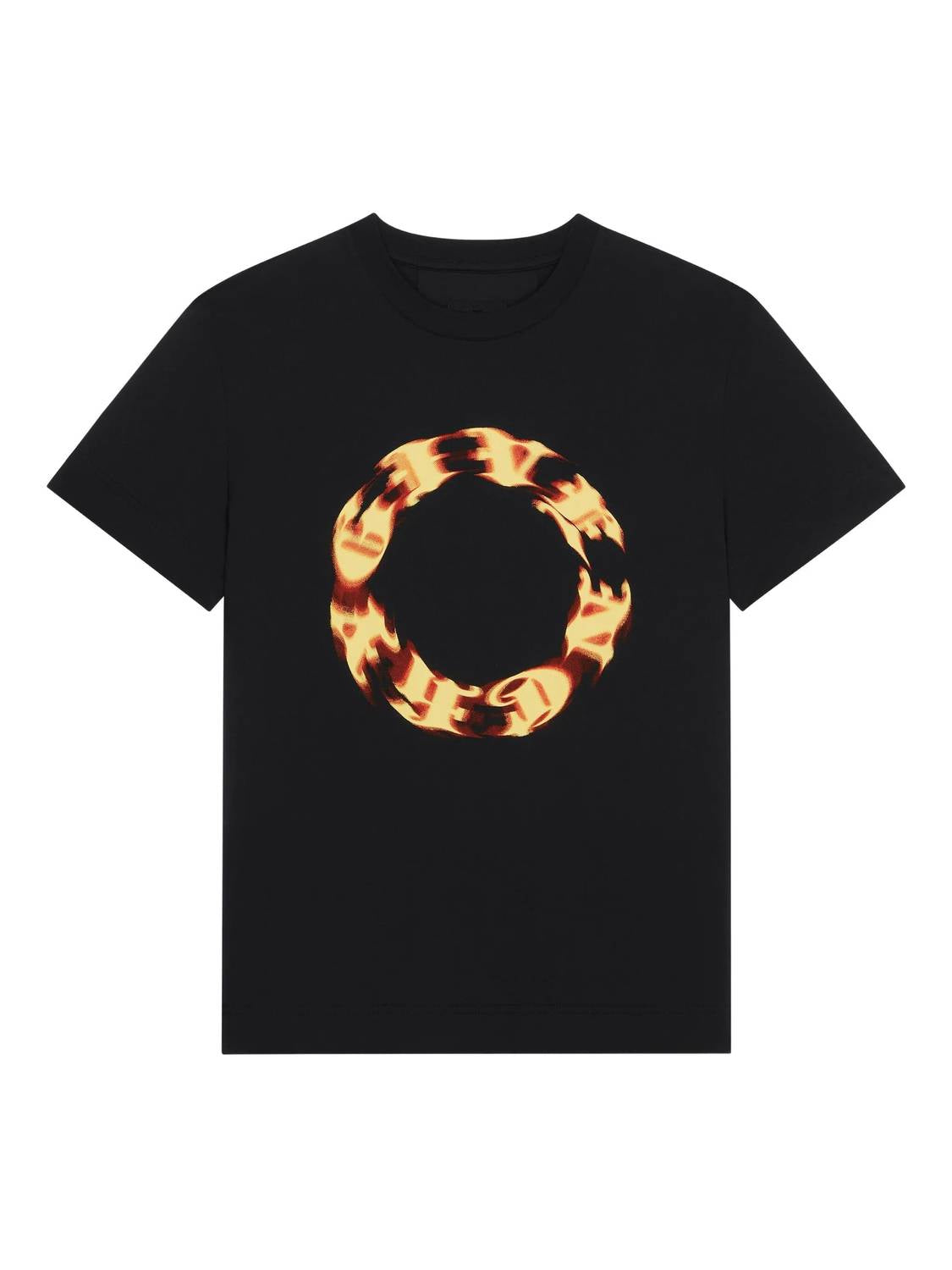 Elevate your streetwear style with the Men's Paris Logo T-shirt by Givenchy, an iconic piece in classic black. Designed with short sleeves and a crew neck, this tee features a graphic print with a circular pattern and a striking flame effect. The 100% cotton construction ensures a soft and comfortable feel, perfect for travel and everyday wear. Closure: Pull on.