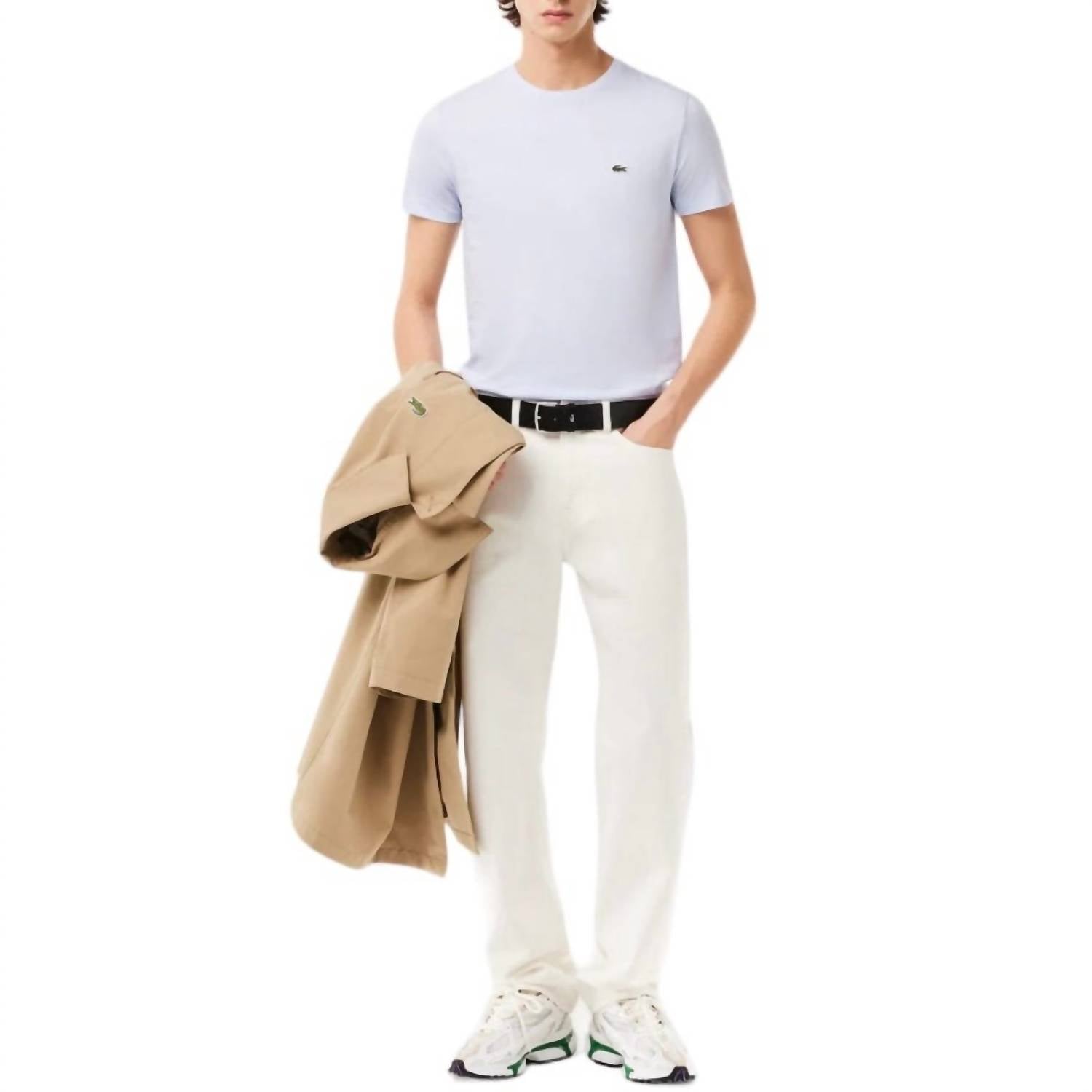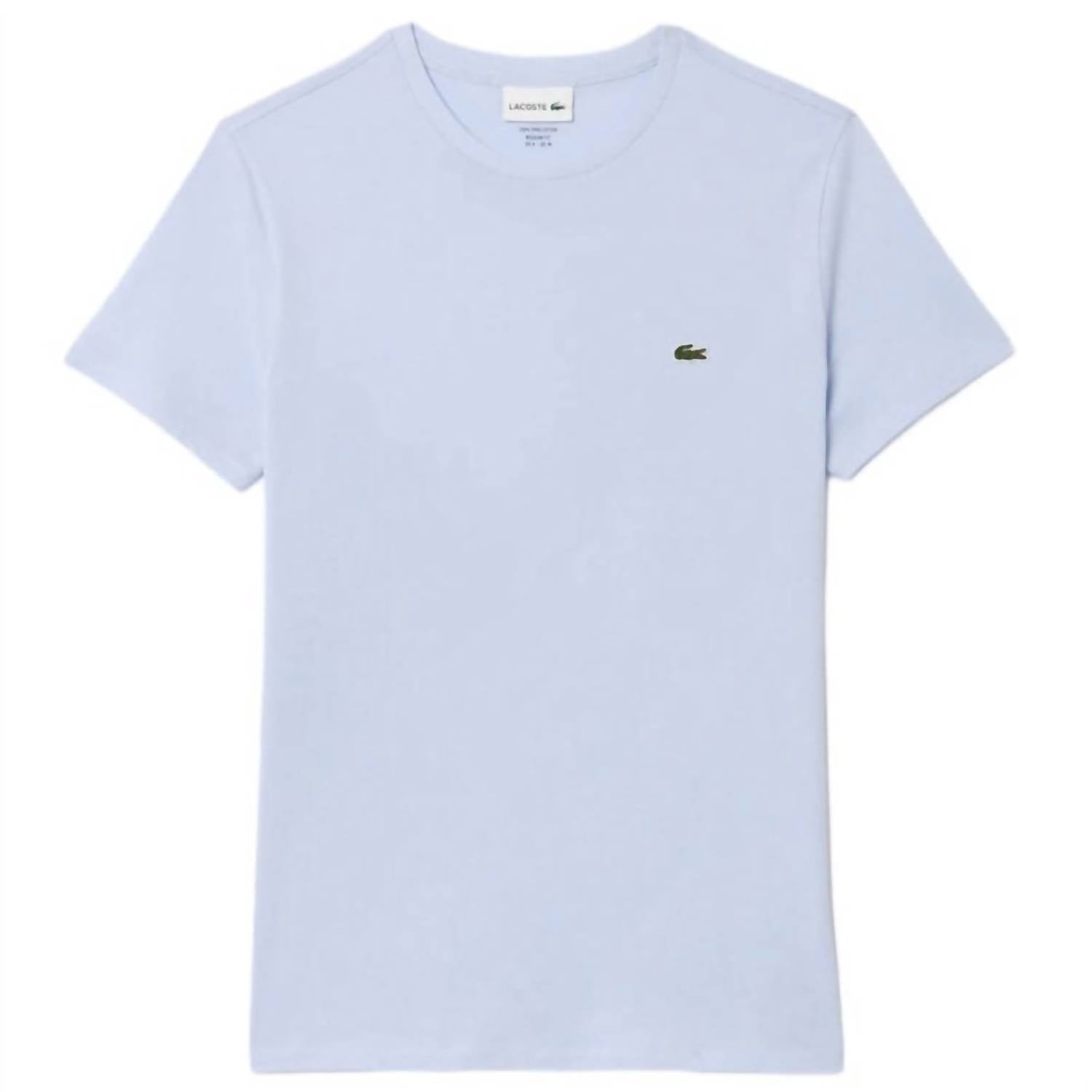Introducing the Crew Neck Cotton Jersey Tee by Lacoste in a soothing light blue, tailored for men who appreciate minimalist fashion. This short sleeve tee is crafted from 100% high-quality Pima cotton, known for its finesse and lightweight finish, sourced from Peru. Featuring a regular fit with a slightly fitted straight cut, the tee includes the iconic embroidered crocodile branding on the chest. Closure: Pull on. Care: Machine wash, tumble dry. Ideal for the summer season, it's perfect for a back-to-school look.
