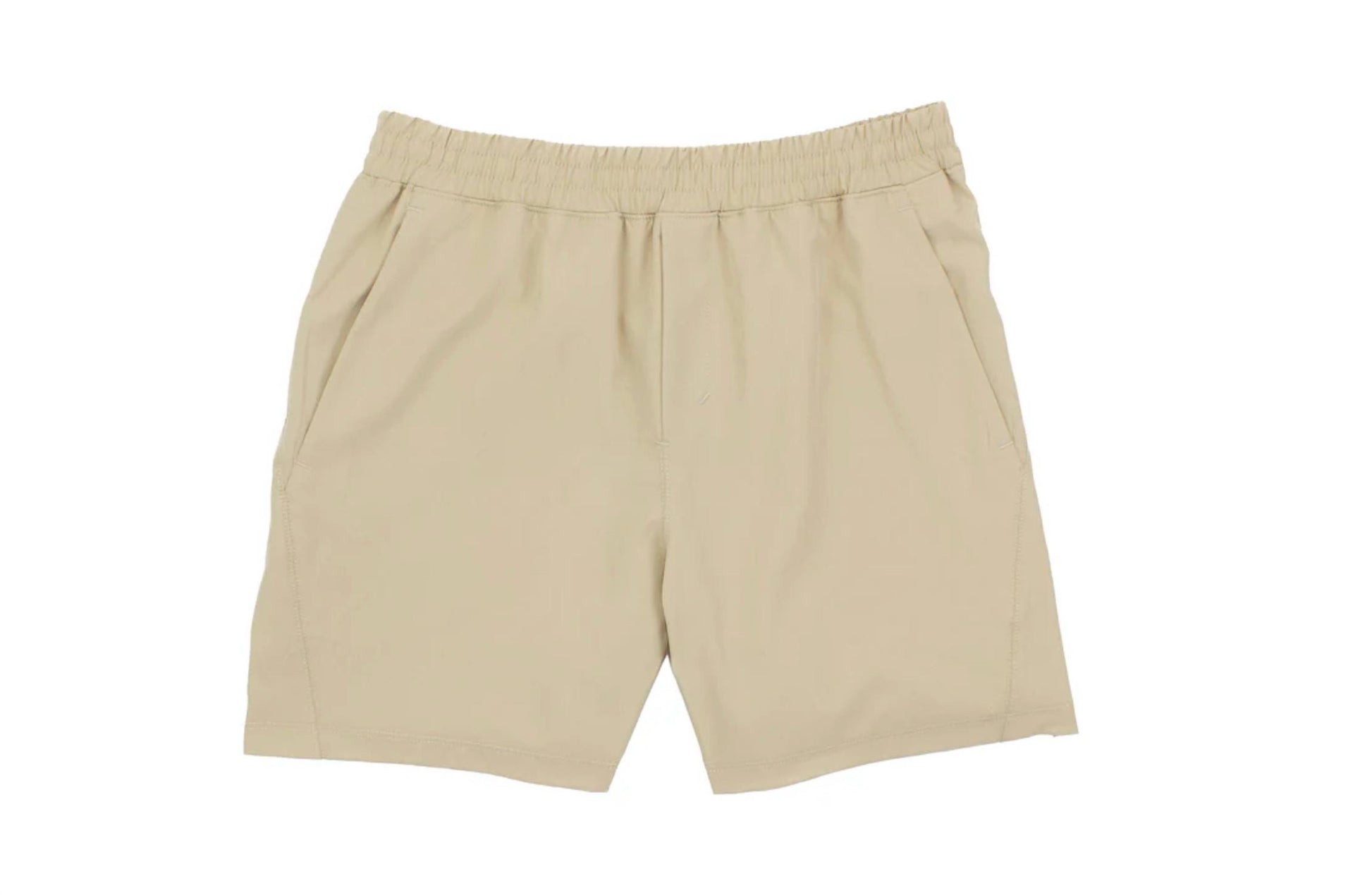 Introducing the Men's Court Short by Properly Tied, crafted to enhance your performance and comfort in stylish khaki. This pull-on short features an elastic waistband and is composed of a flexible 95% polyester and 5% spandex blend, ensuring ease of movement. It is equipped with both low-bounce side pockets and a hidden zipper pocket, with a mesh seam across the back for added ventilation. Ideal for any activity, this minimalist piece is machine washable for your convenience.