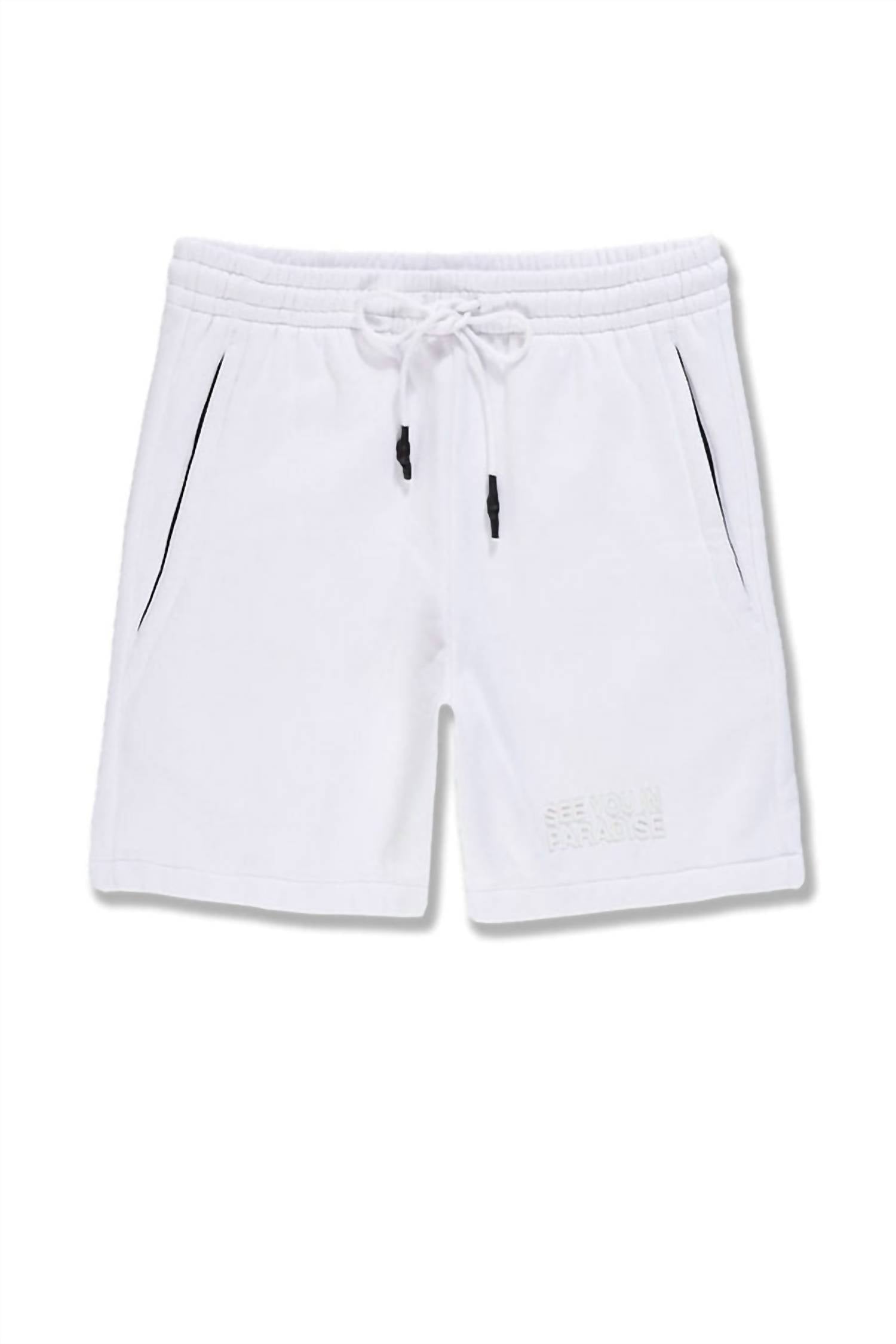 Introducing the Retro Paradise Tonal Shorts by JORDAN CRAIG, designed with an 8.5" inseam to fall stylishly above the knee. These shorts are crafted from a durable 65% Cotton, 35% Polyester blend, featuring a high-density "See You In Paradise" tonal print on the thigh. With dual side pockets featuring hidden zipper openings and a back wallet pocket, they offer practicality alongside style. Closure: Adjustable drawstrings. Care: Machine wash. Perfect for summer athleisure and game day occasions.