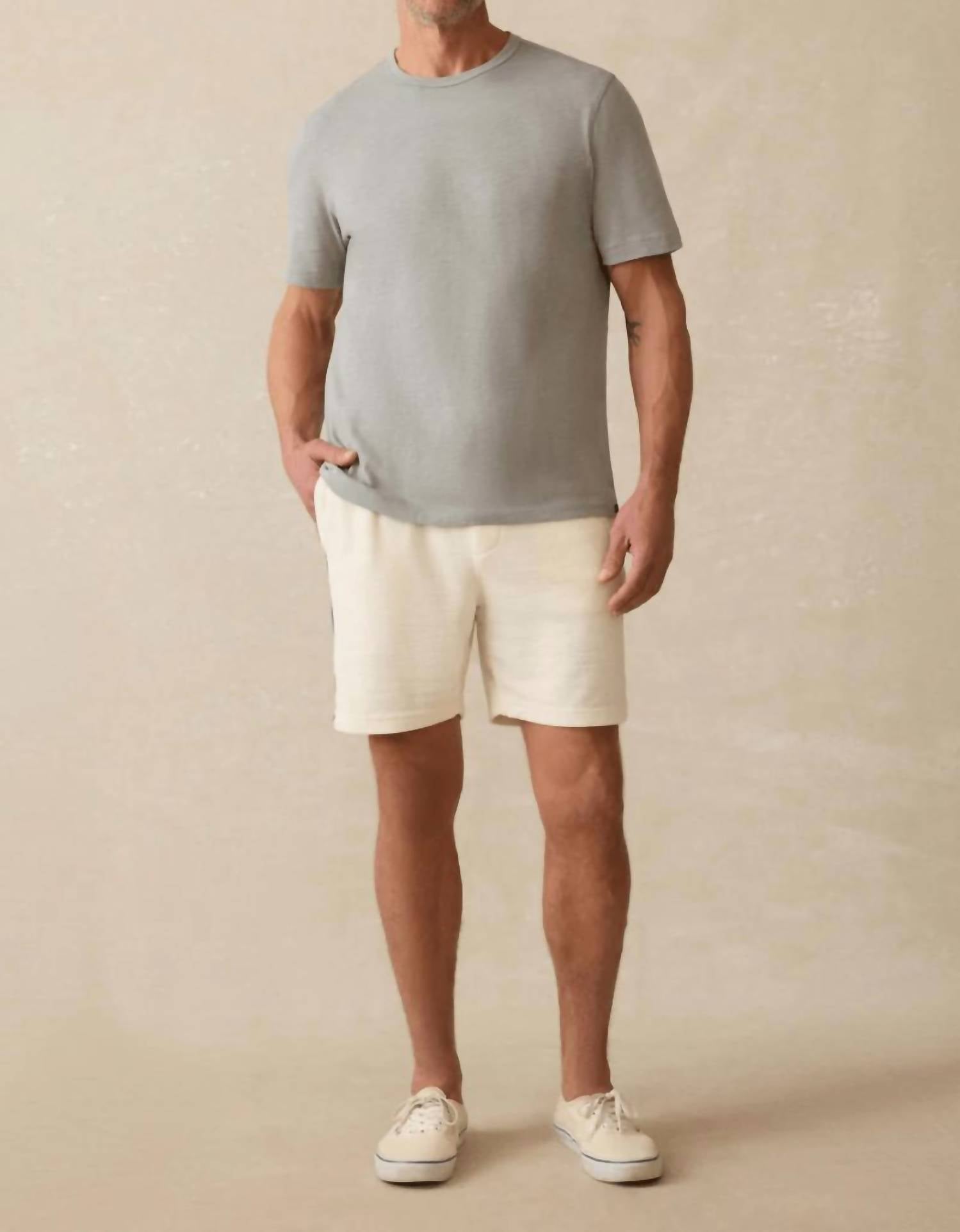 Experience all-day comfort with Faherty's Cabana Towel Terry Sweatshort in Vintage White. These men's relaxed fit shorts boast an inseam of 7.5 inches and feature an elastic Hollywood waistband with a drawstring for easy wear. Crafted from a cotton blend of 55% Cotton, 27% Good Earth Cotton®, and 18% Recycled Polyester, they are perfect for a minimalist summer style. Equipped with front slash pockets and a buttoned patch pocket, these shorts are ideal for travel or lounging; simply machine wash and tumble dry for easy upkeep.