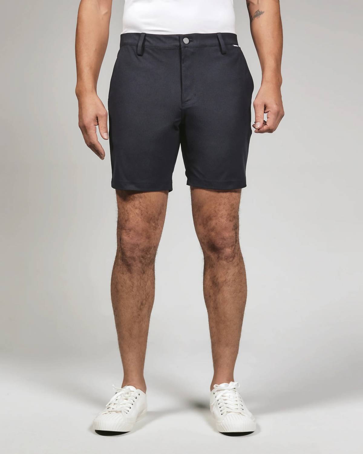 Meet the Infinity Short by 7Diamonds, your go-to choice for a minimalist summer wardrobe. Crafted in a solid charcoal hue from 100% polyester, these flat front shorts feature an 8" inseam and offer a relaxed drape thanks to the Linear Flex® technology fabric. The design includes a jacquard comfort stretch waistband and dual back pockets with secure hidden zippers, all secured with a button closure. Care for these shorts by machine washing cold with similar colors, tumble drying on low, and avoiding bleach, ironing, or dry cleaning. Model: 6'1" wearing a size medium.