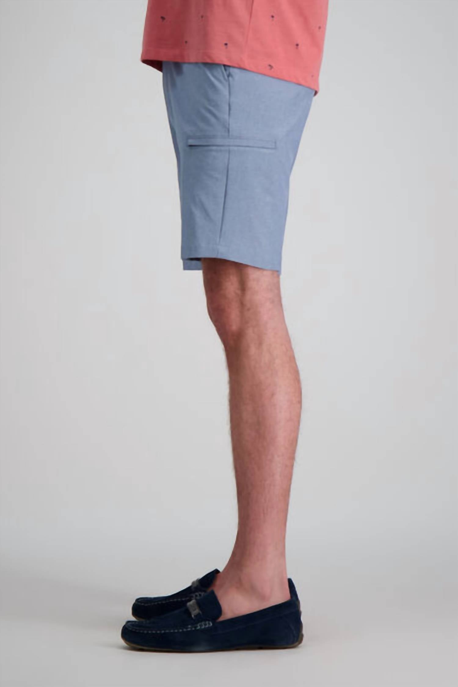Introducing the Men's The Active Series Performance Utility Short by Haggar, designed for both functionality and style. Crafted from solid blue polyester, this men's flat front short offers a sleek look. Featuring a button closure, it's an excellent choice for spring occasions like homecoming. With the added convenience of pockets, this utility short is both practical and stylish.