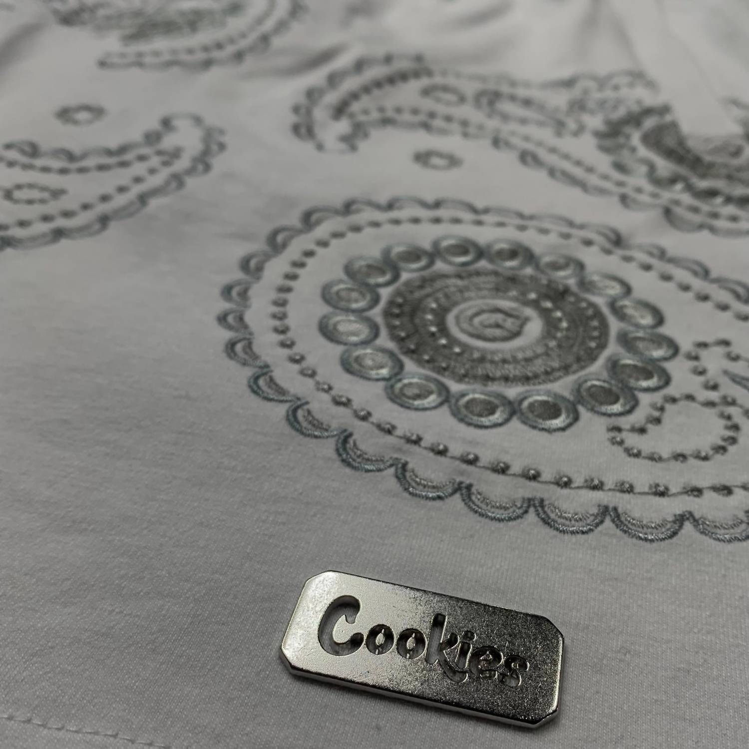 Elevate your summer wardrobe with the Men's Casablanca Interlock Jersey Sweat Shorts by Cookies, perfect for vacation getaways or 4th of July celebrations. These flat front shorts are crafted from 100% cotton in a classic white hue, featuring an embroidered paisley pattern that exudes a sense of streetwear style. Designed with convenient zipper pockets and a pull-on closure, these shorts seamlessly combine function with fashion. Care instructions include machine wash and tumble dry, making them a practical and stylish addition to any men's collection.