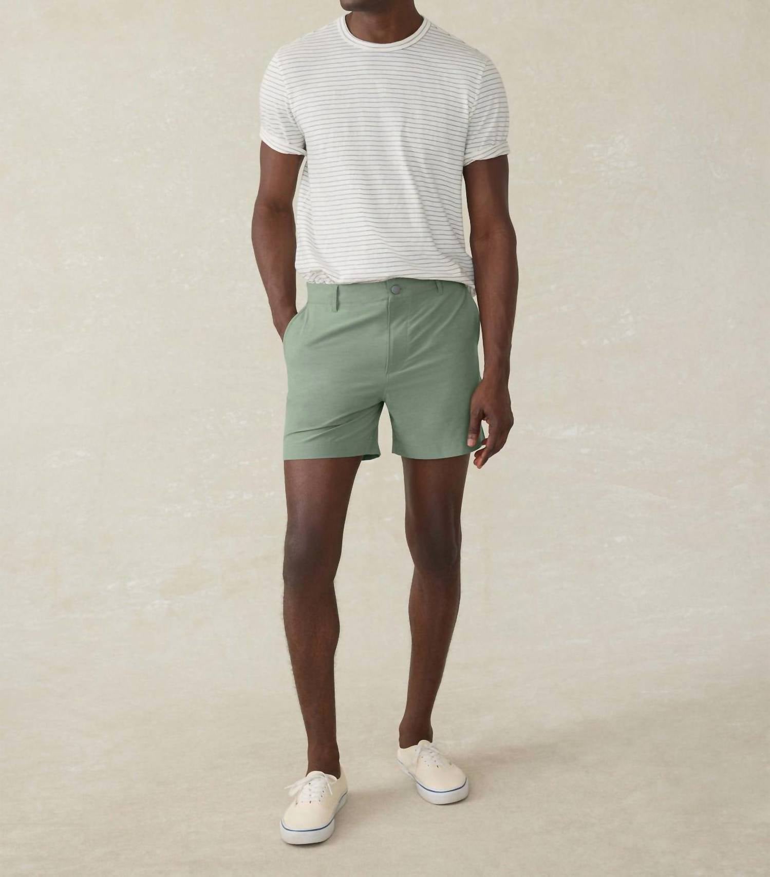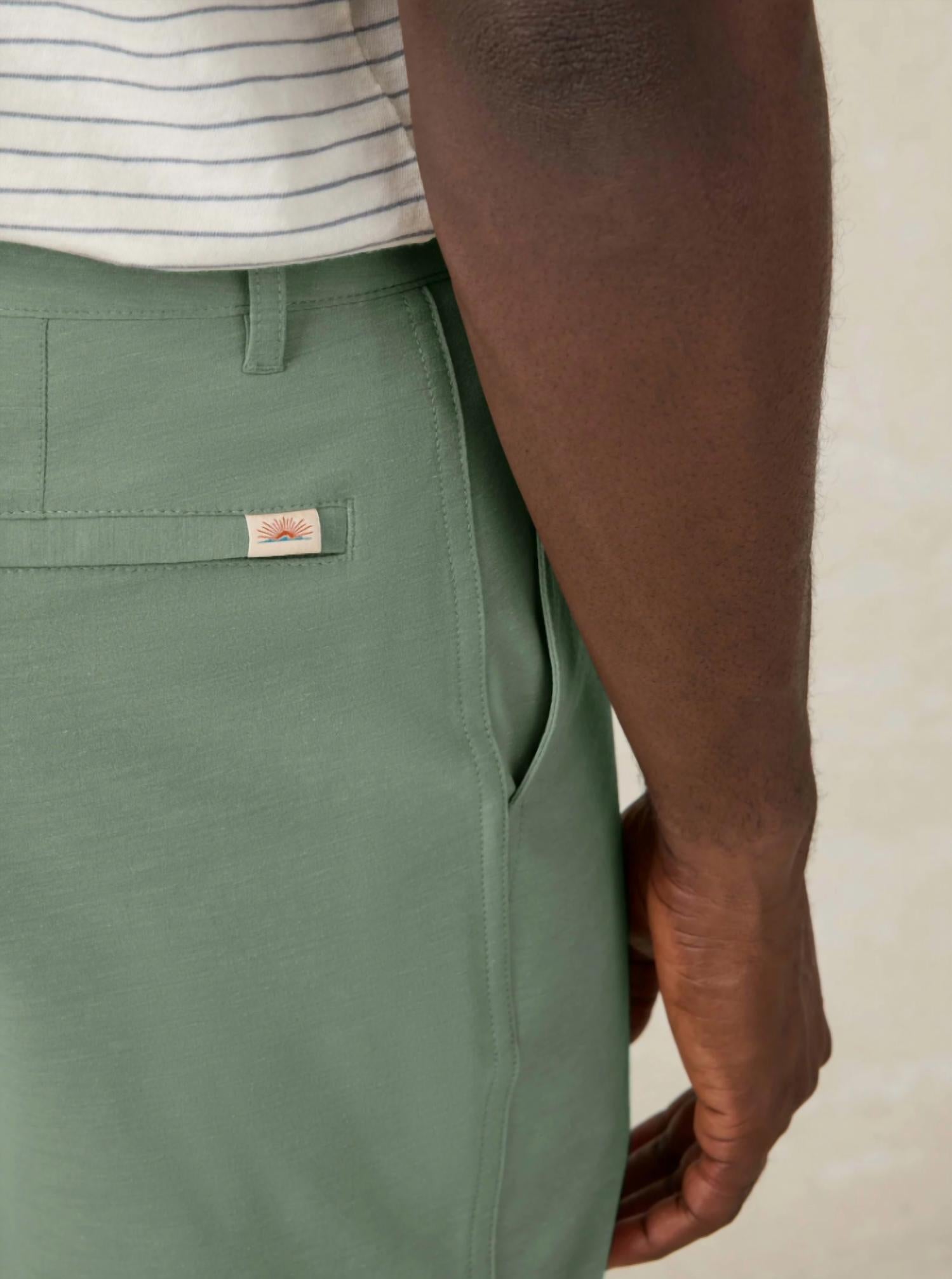 Experience effortless style and functionality with the Faherty All Day Shorts, perfect for both travel and leisure in Trail Olive. These hybrid shorts feature a refined flat front style with a button closure, 5-inch inseam, and mesh-lined pockets for all-day comfort. Made from a breathable blend of 72% recycled polyester, 20% cotton, and 8% spandex, these shorts are designed for quick-drying performance with a lighter-weight fabric. Care for your shorts with ease by machine washing and tumble drying, ensuring they're ready for your next summer adventure.
