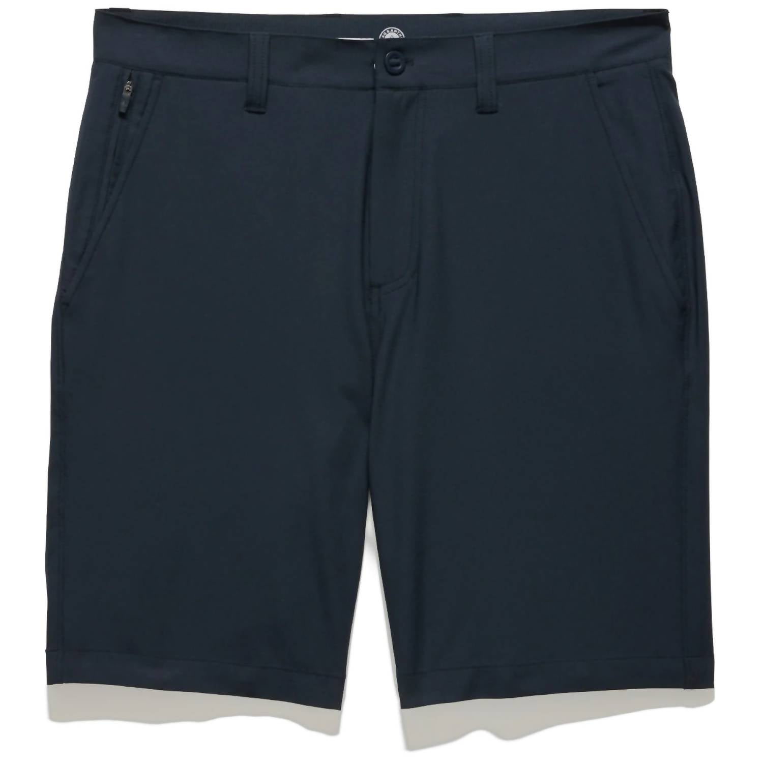 Elevate your athletic wardrobe with the Flags & Anthem Pivot Performance Short in classic navy, designed for both on and off the course. Featuring an 8" inseam, these shorts are crafted from a blend of 90% polyester and 10% spandex for ultimate stretch and quick-drying comfort. With zip-fly front and button closure, they offer practical angled front pockets and additional back mesh-lined slit pockets with button closures. These versatile shorts also provide UPF sun protection and are machine washable for easy care.
