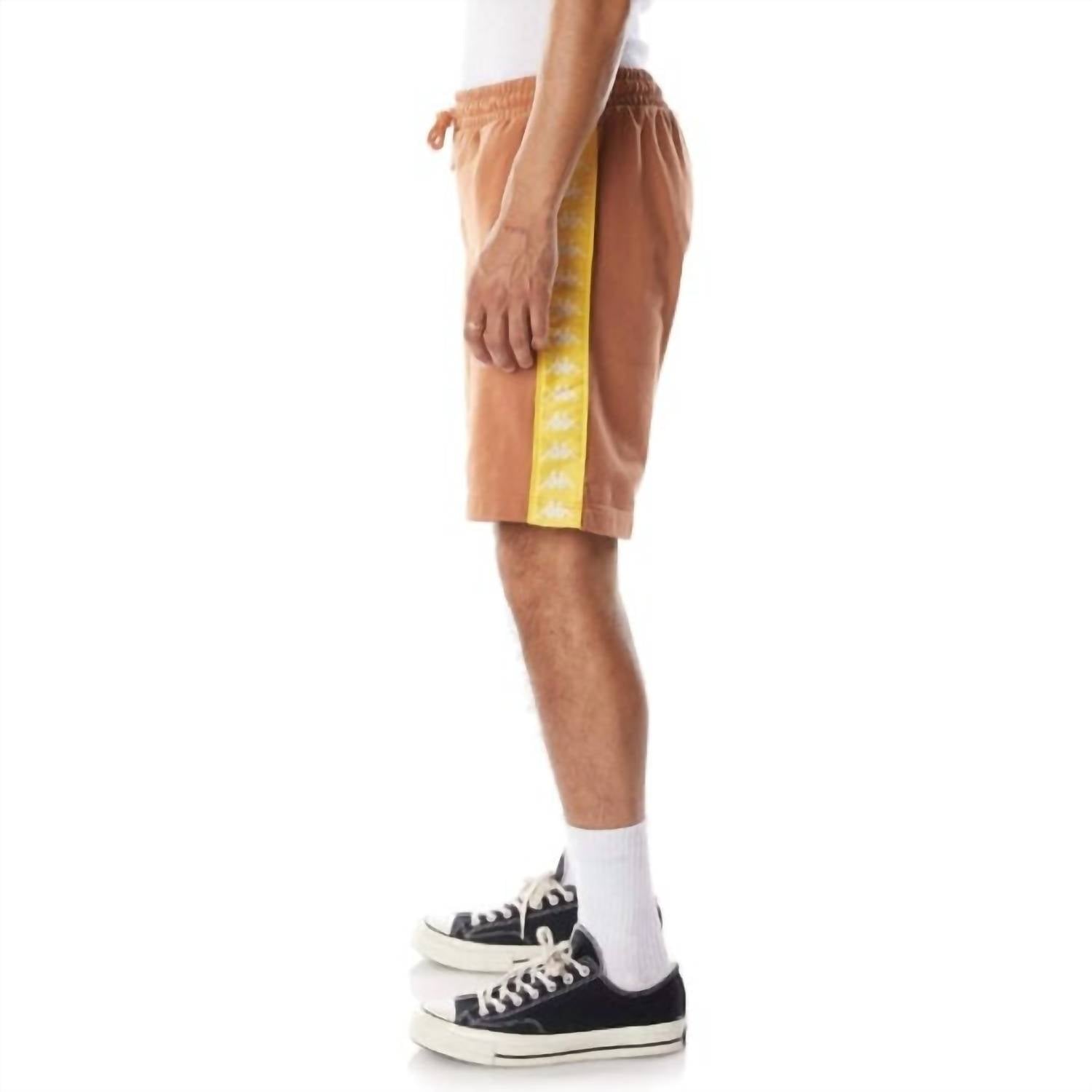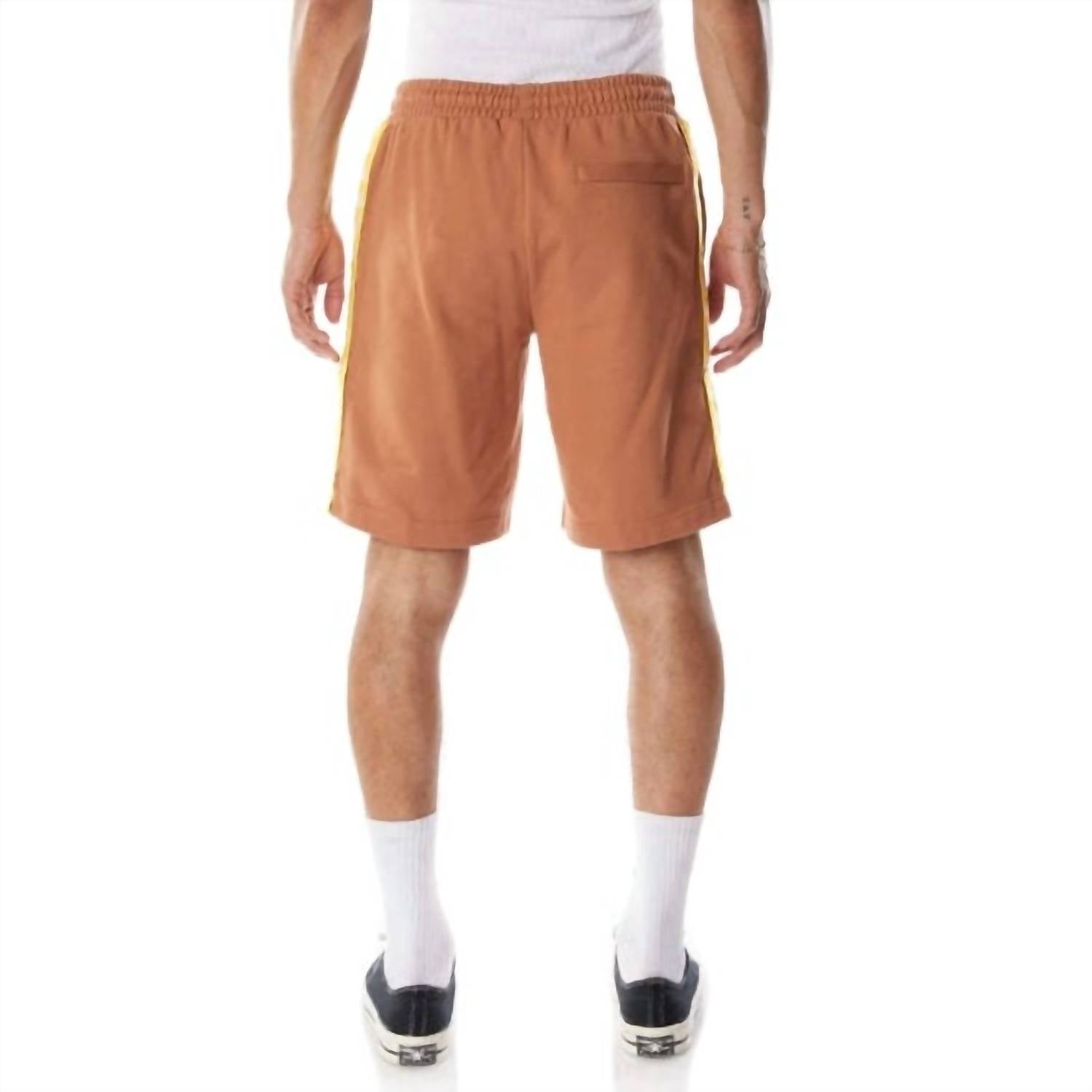 Introducing the Banda Marvz 2 Pull On Shorts by Kappa, designed for athletic style and comfort. Made from a cotton blend with 80% cotton and 20% polyester, these brown bermuda shorts are perfect for your streetwear wardrobe. Featuring jacquard Omini logo tape with piping, side pockets, and a convenient back zipped pocket, they offer both fashion and functionality. Closure: Pull on. Care: Machine wash and tumble dry. Model is 6'0" and wearing a size Large.