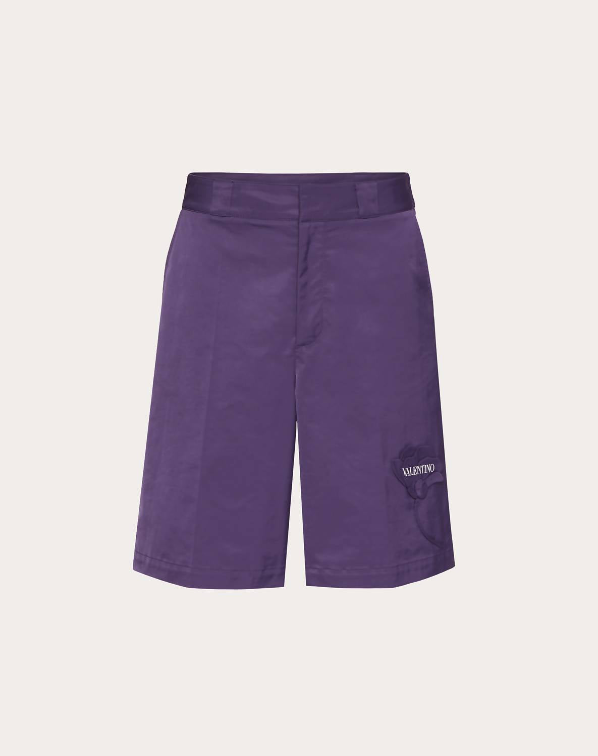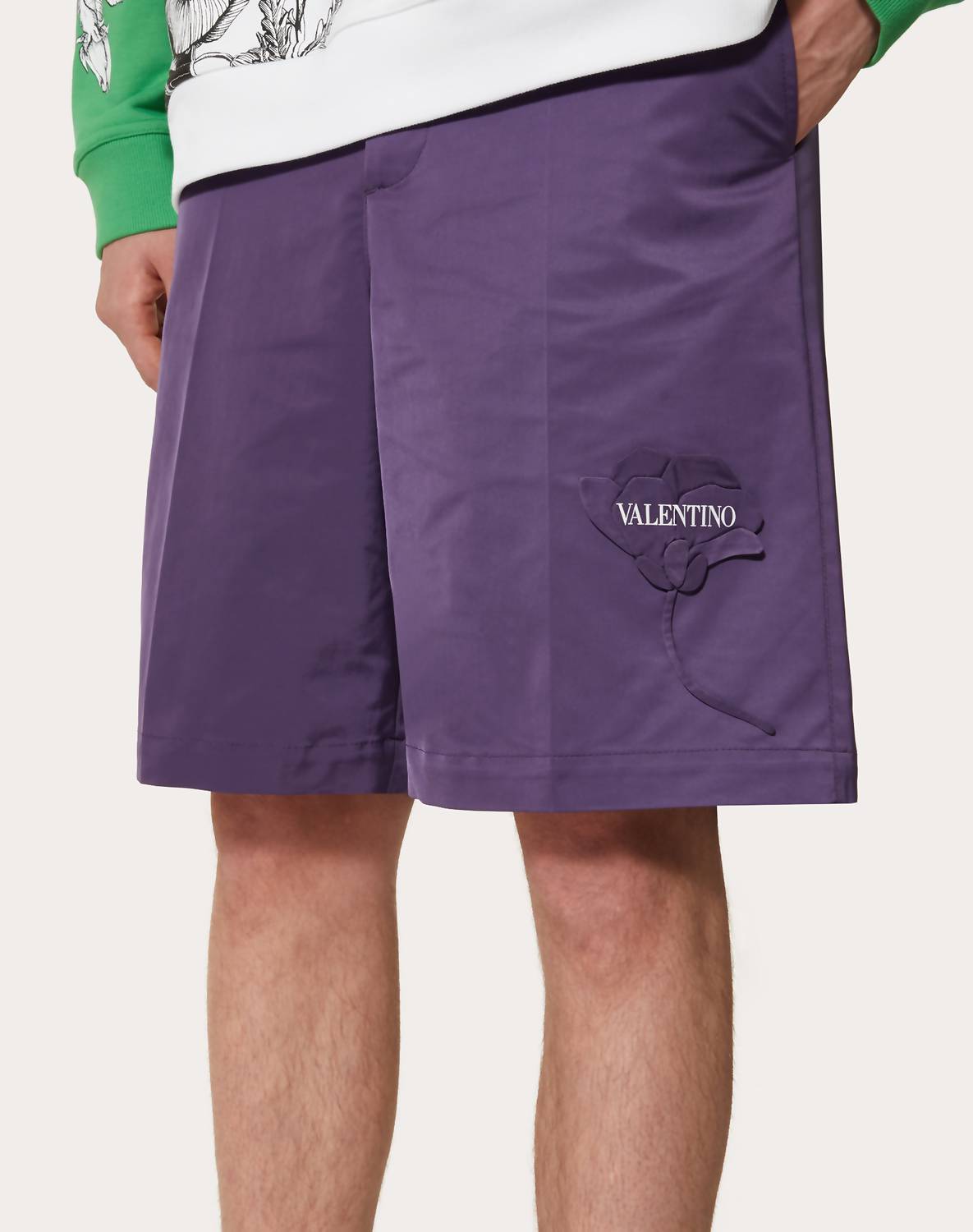 Elevate your summer wardrobe with the Men's Garden Nylon Bermuda Shorts by Valentino, tailored for the modern man. These purple shorts feature stunning floral embroidery and the iconic Valentino appliqué, embodying a perfect blend of elegance and streetwear trend. Made from 100% Nylon, they come equipped with two side pockets and two back pockets, and a comfortable pants leg width of 34.5 cm. Crafted in Italy with a hook and eye closure, these shorts are designed for both travel and casual outings, catering to fashion-forward individuals.