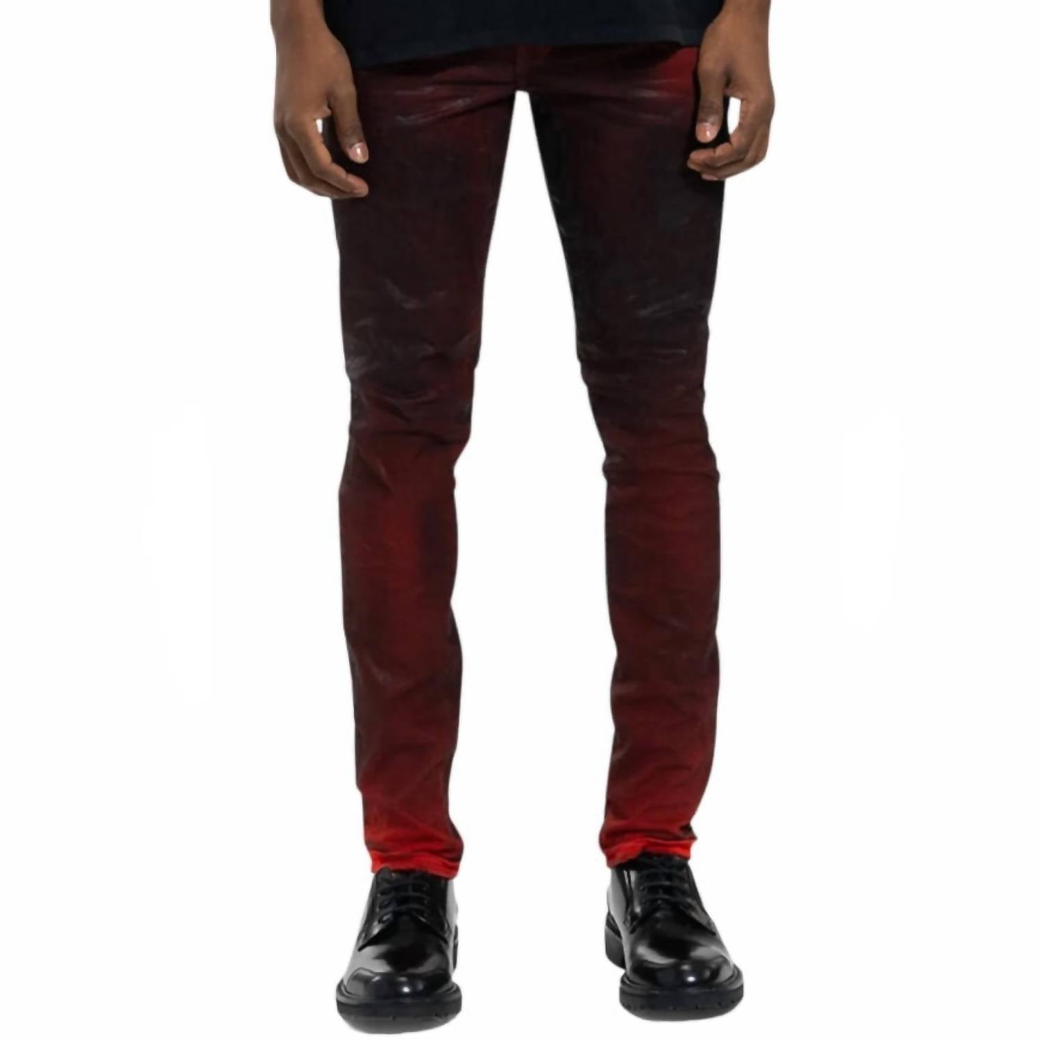 Introducing the Molten Lava Coated Denim Jeans by Purple Brand, a bold addition to your streetwear collection. Crafted from a Cotton Blend with a touch of Lycra® spandex, these jeans offer a comfortable slim fit with a striking red hue. Designed with skinny legs and featuring a low-rise waist, this full-length pair also includes a classic five-pocket style and button closure. Easy to care for, simply machine wash them cold to maintain their eye-catching appeal.