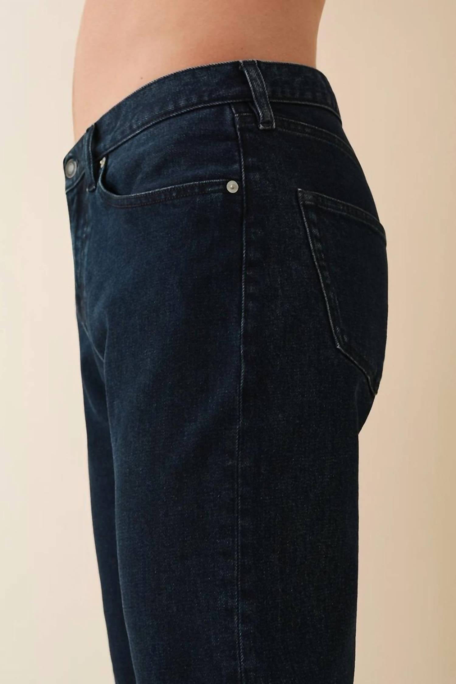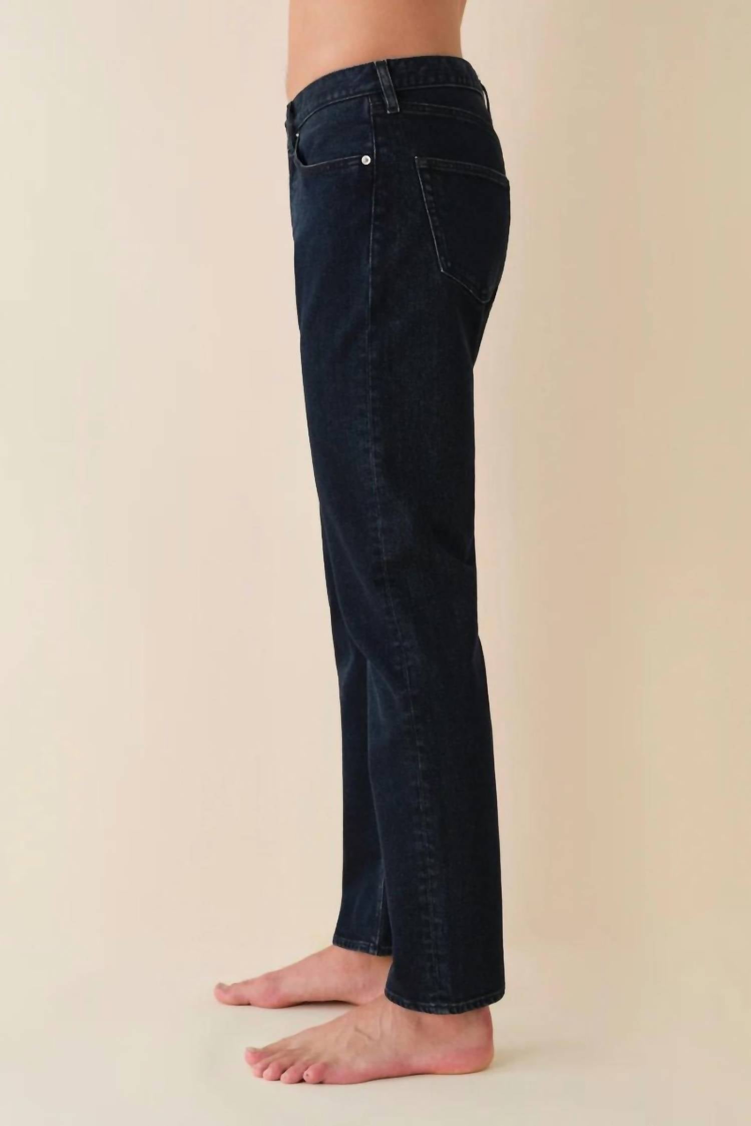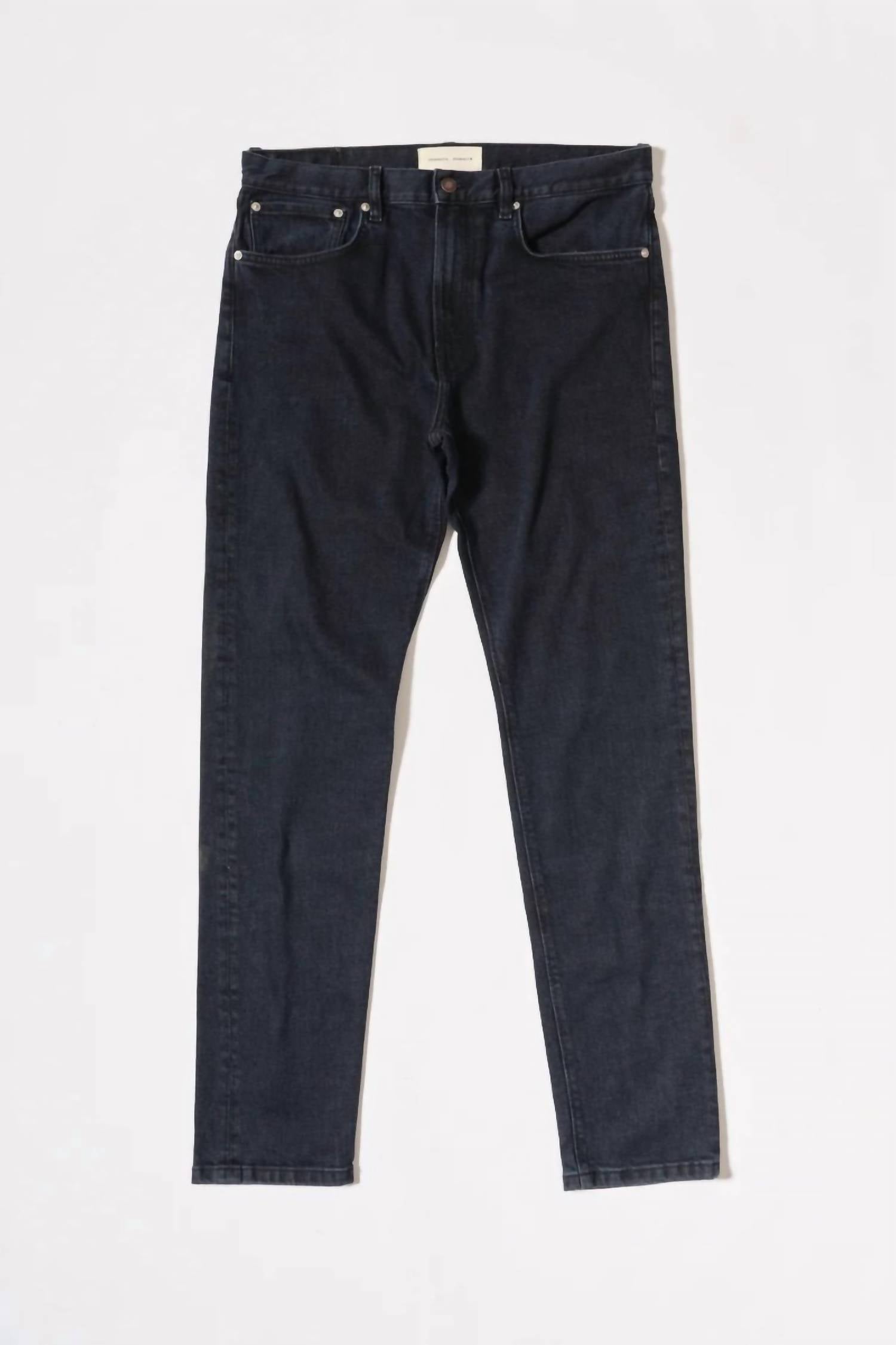 The 'Tapered' jeans feature a modern 5-pocket design with a zip fly, mid-rise waist, and tapered leg. Made from a blend of 50% recycled cotton, 34% cotton, and 16% recycled polyester, they come in blue organic denim overdyed in black with slight stretch. The jeans have a 32" inseam and are produced using environmentally friendly methods. Care instructions recommend washing less frequently, spot cleaning, and machine washing inside out at 30°C on a delicate cycle.