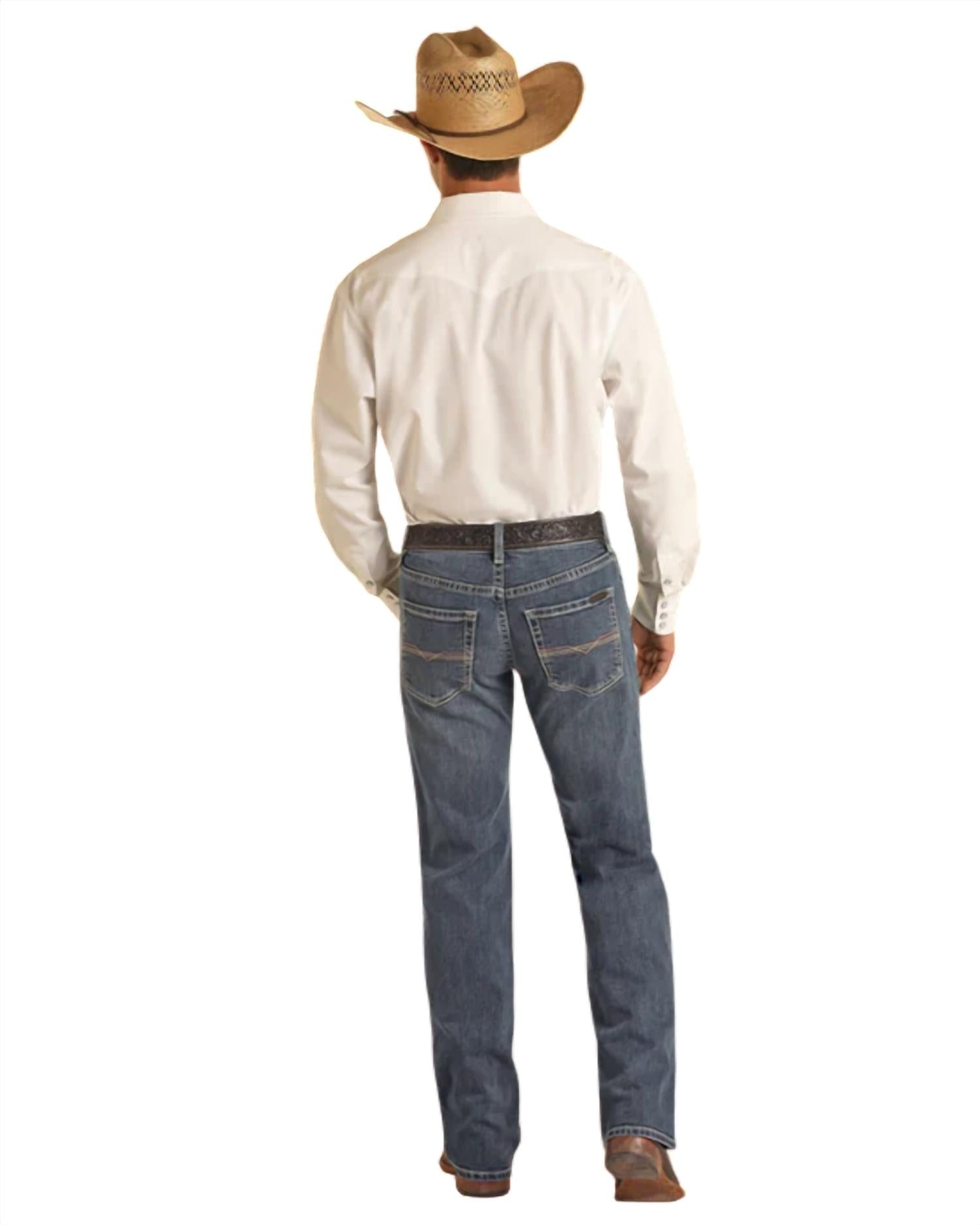 Embrace timeless style with the Ivory Stitch Revolver Jean from Rock & Roll Denim, designed for the modern man. Featuring a slim fit with a mid-rise and straight leg style, this jean in medium vintage showcases detailed ivory stitch embroidery. Made from 99% cotton and 1% spandex, the fabric offers a comfortable stretch fit with a 17" leg opening. Closure: Button closure. Inseam: 30".
