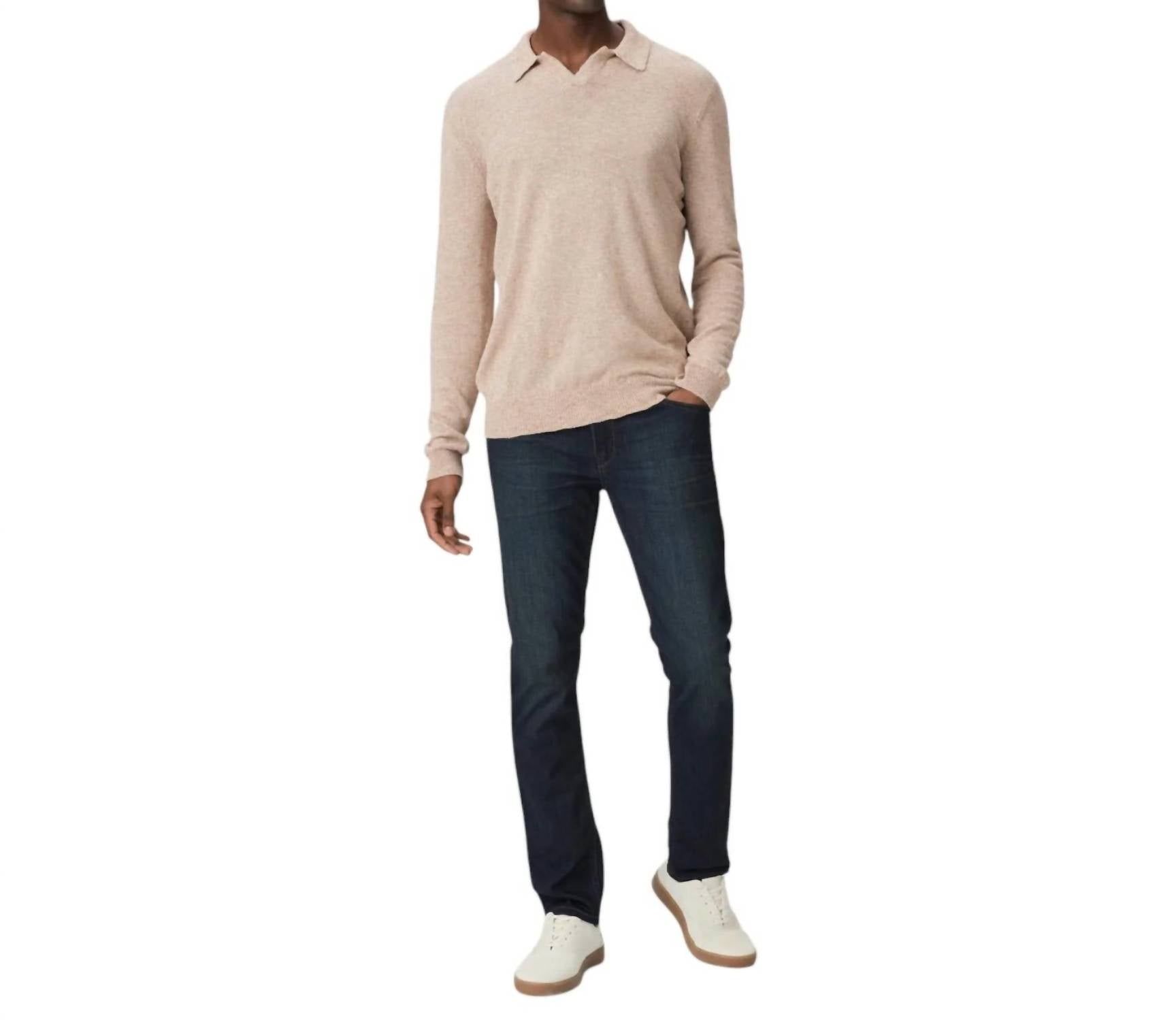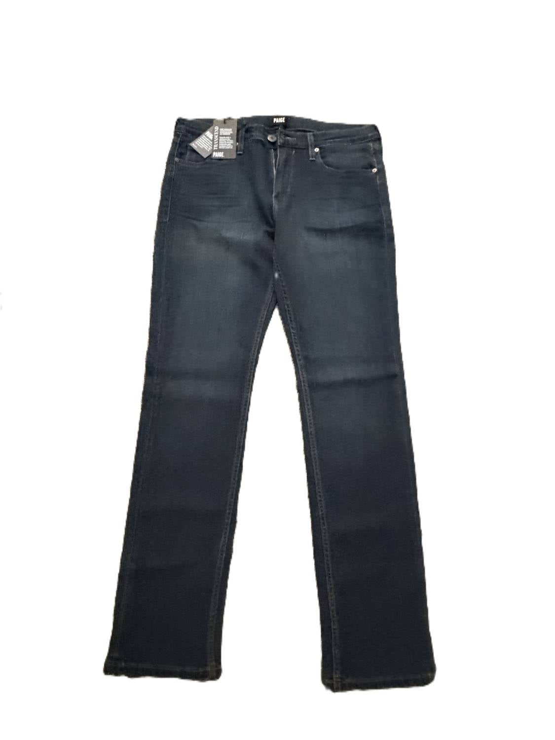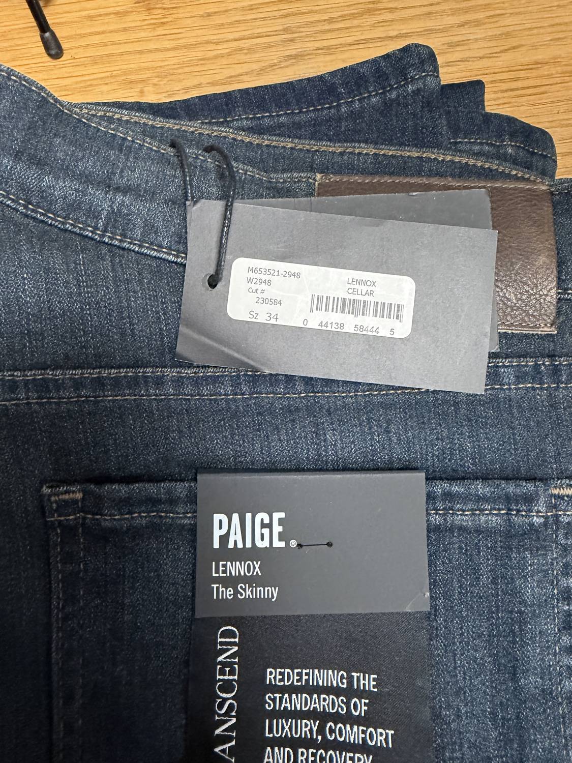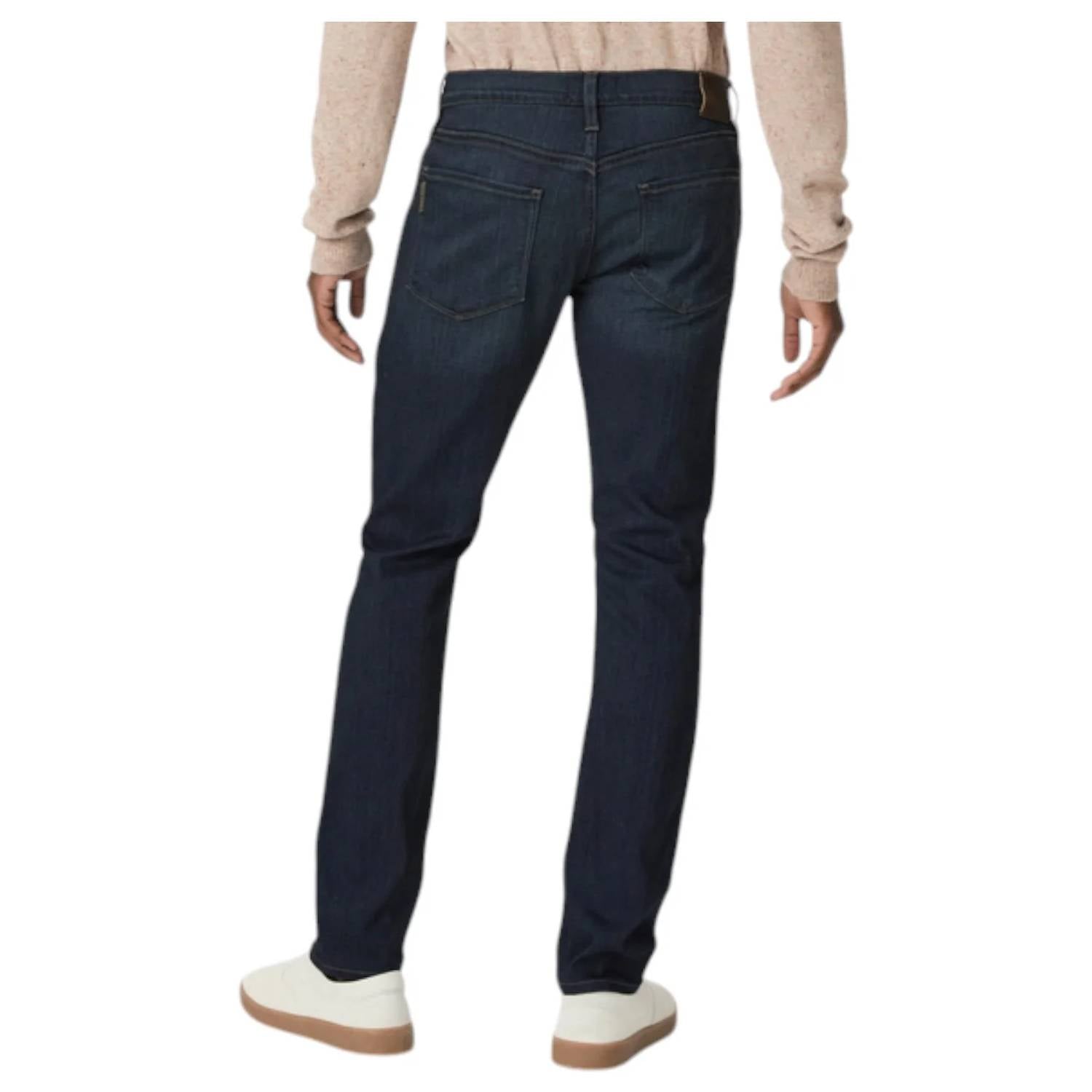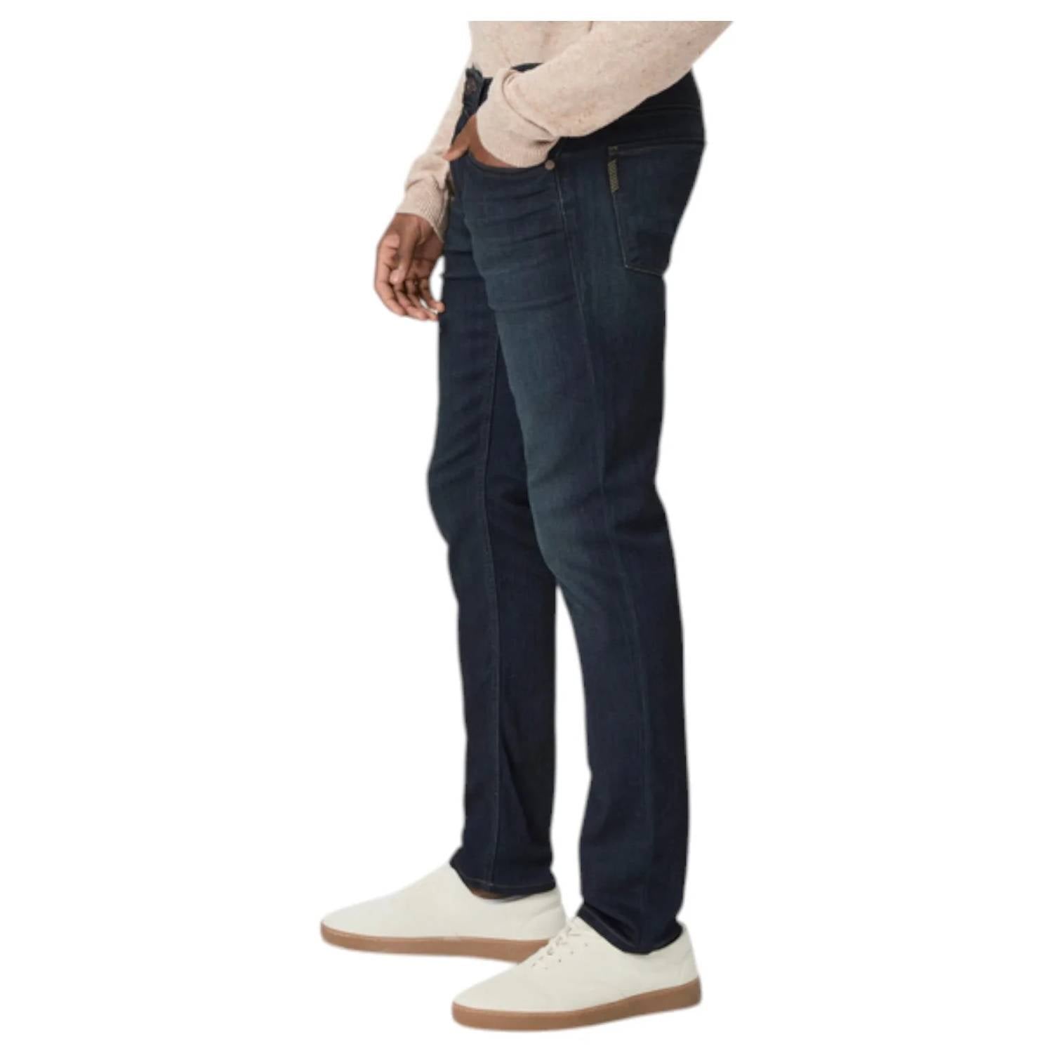 The PAIGE Lennox Transcend Slim Fit Jean in Cellar is a dark blue jean with subtle whiskering and fading. It has a slim fit, fitted through the thigh and tapering from the knee to the leg opening. The jean is made from Transcend denim for comfort, featuring premium stretch and recovery. The fabric composition is 54% rayon, 23% cotton, 22% polyester, and 1% spandex.