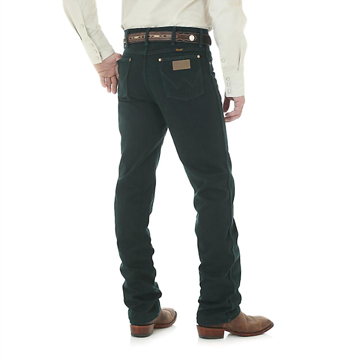 Step confidently in the Wrangler Cowboy Cut Slim Fit Jeans, a robust choice for any wardrobe. Sleeve length: not applicable. Crafted from 100% heavyweight cotton denim, these jeans deliver a relaxed fit with a straight leg style, perfect for wearing over boots. They feature a zip closure and a low-rise waist, reflecting their solid green color and workwear trend.