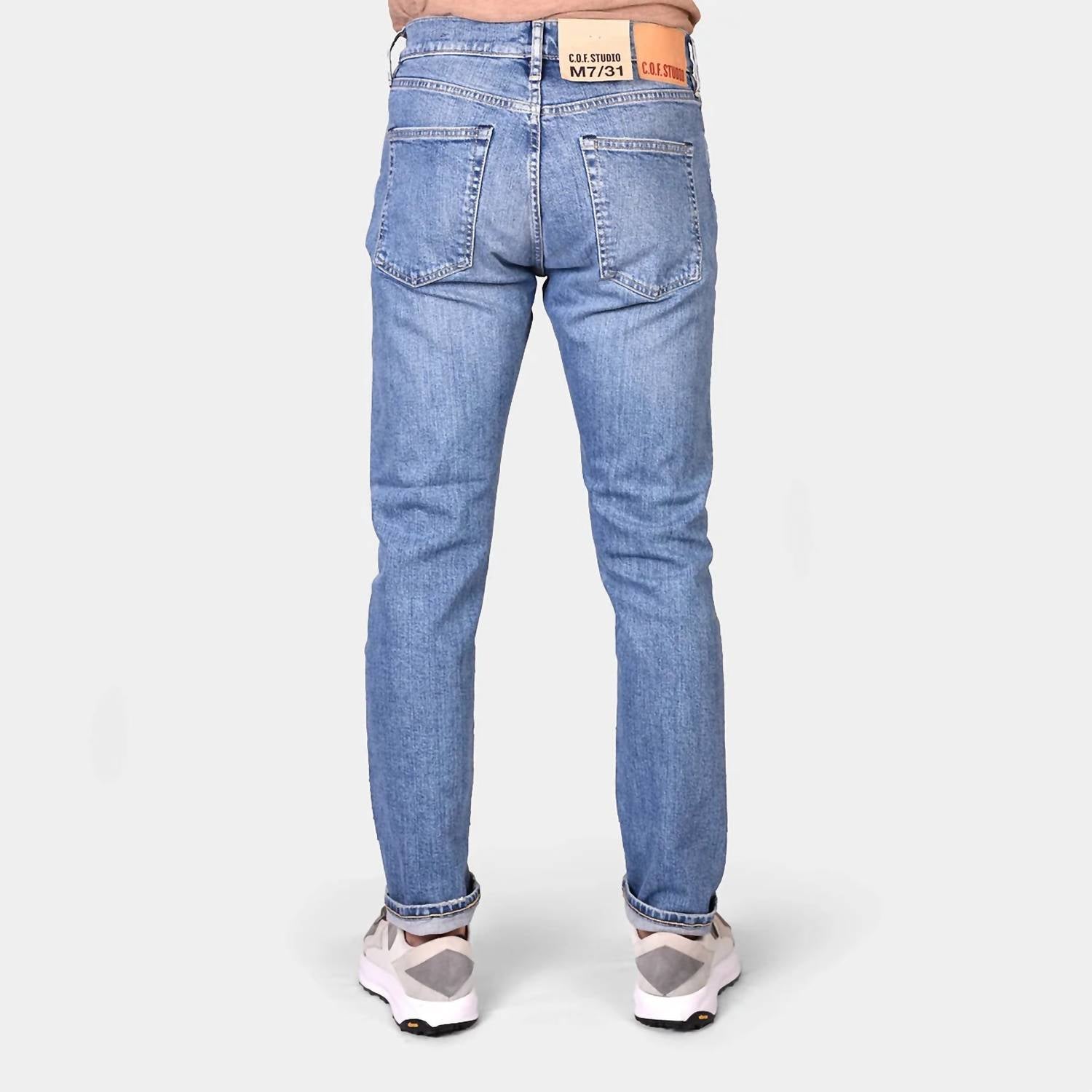 Presenting the C.O.F. Studio M07 80's High-rise Jean, crafted for men seeking style and comfort. These jeans feature a high-rise waist, composed of premium cotton in a solid wash selvedge color. The straight leg with a gentle taper creates a sleek silhouette, while the traditional button closure adds vintage charm. Expertly crafted in Portugal, these jeans embody European quality and design.
