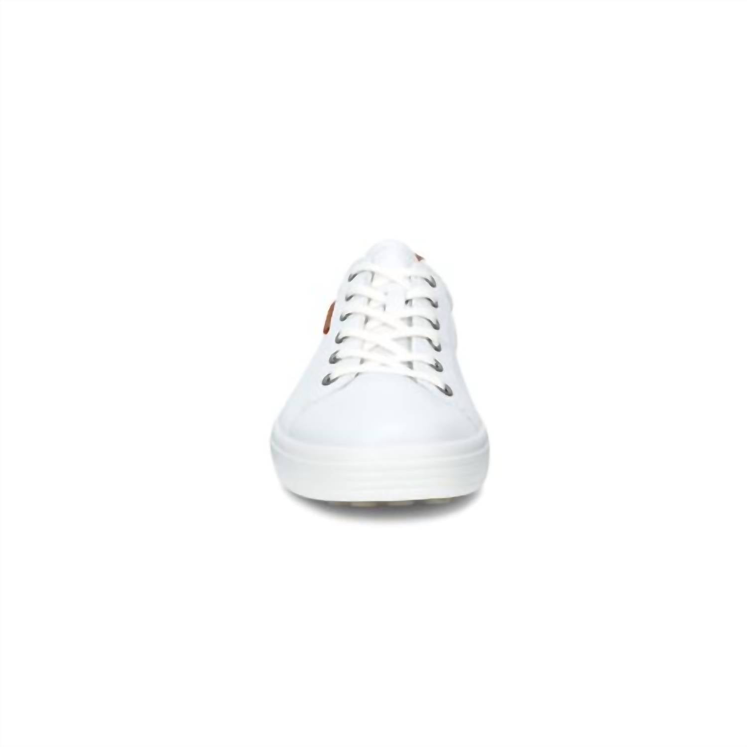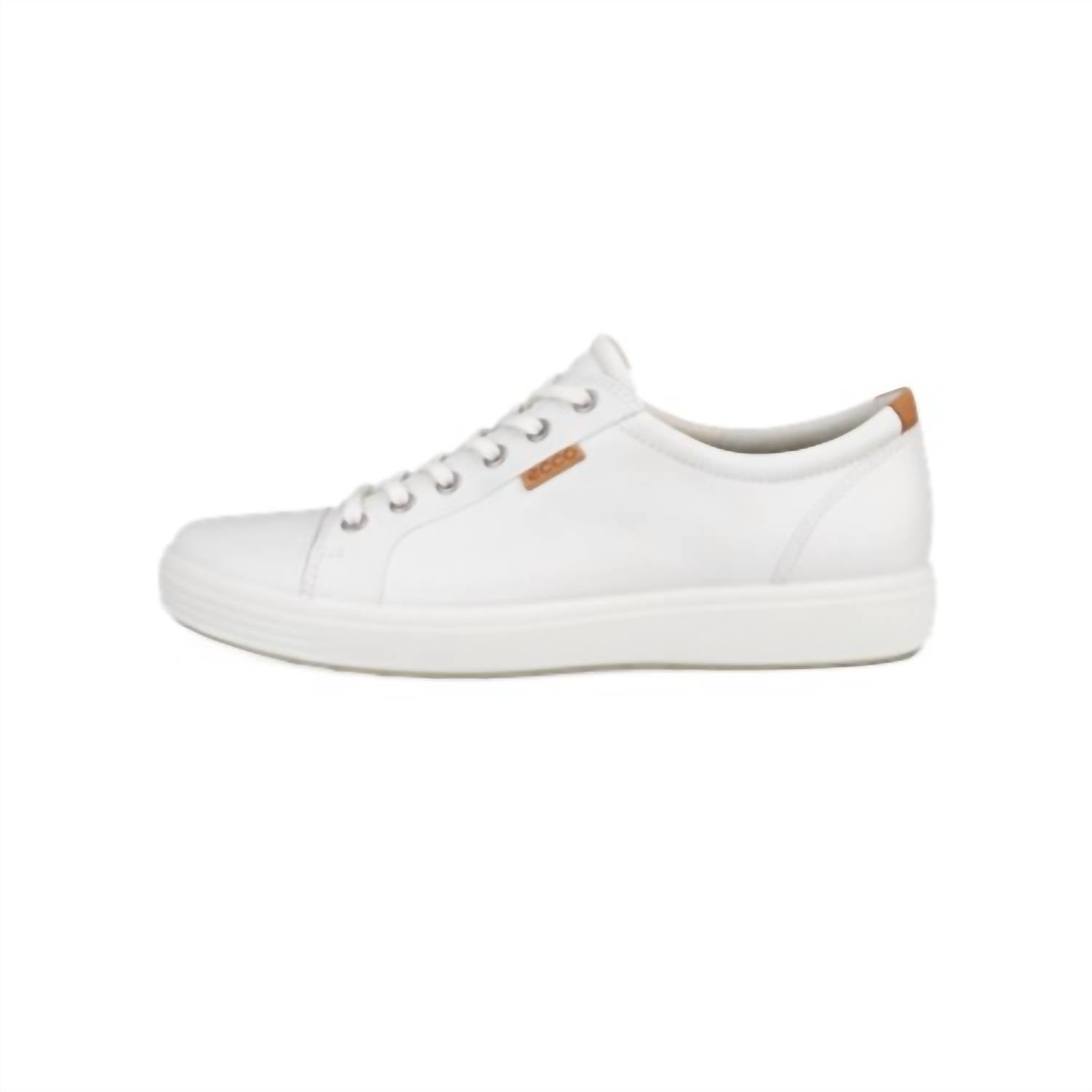 Elevate your casual wardrobe with the Men's Soft 7 Leather Sneaker by ECCO, designed for the modern man who values style and comfort. Crafted from a combination of high-end leather materials, these sneakers feature a long-lace closure system for a personalized fit. The dimpled outsole ensures a dependable grip, while the ultra-soft fabric lining and leather molded insole provide enhanced comfort and breathability. With a flat heel and round toe shape, these versatile white sneakers are perfect for pairing with jeans or trousers.