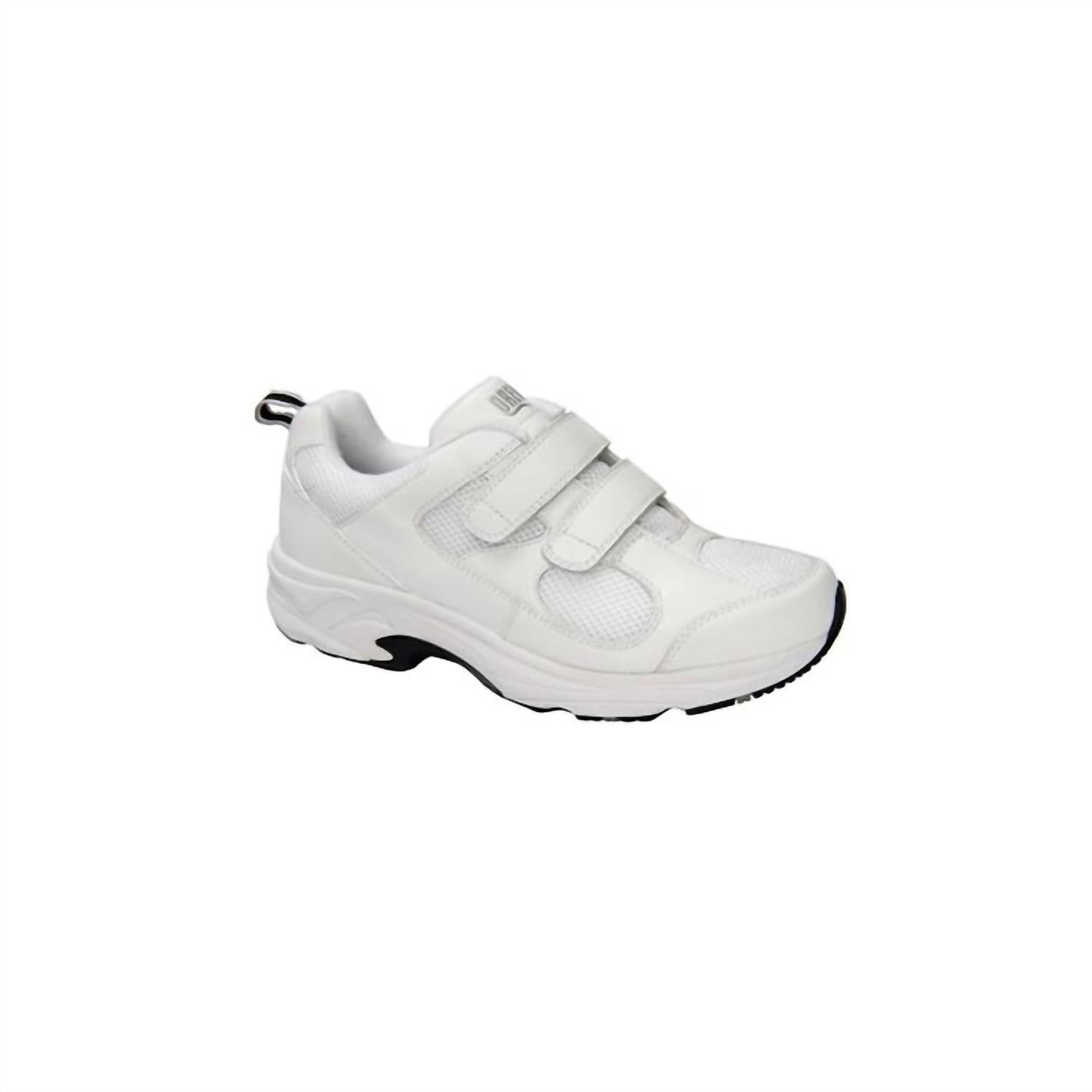 Meet the Drew Men's Lightning II V Shoes in white, designed for superior comfort and support. Crafted with a durable leather upper and breathable mesh panels, these athletic shoes feature two adjustable Velcro® straps for easy on and off. The interior boasts a soft fabric lining with a foam-padded tongue and collar, ensuring a secure fit. With the Plus Fitting System®, the removable Drilex® treated insoles help control odor and stains, while the wide internal shank and lightweight external shank provide stability and support. Perfect for winter sports or everyday use, these shoes offer lasting traction with their durable rubber outsole and shock-absorbing midsole.